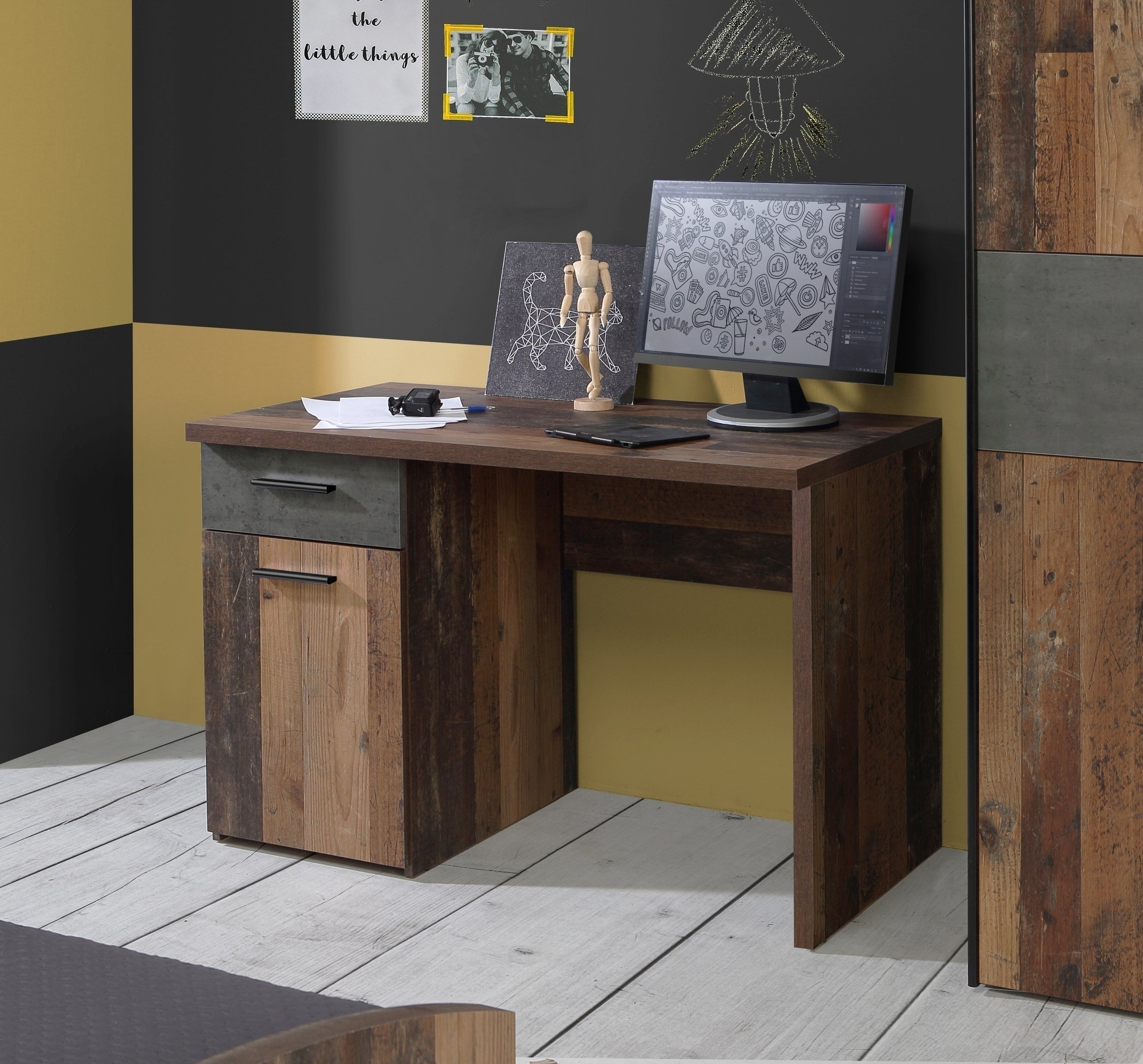 Eine Schublade und zwei geschlossene Fächer hinter Drehtüren halten Büroartikel ordentlich und staubgeschützt bereit.