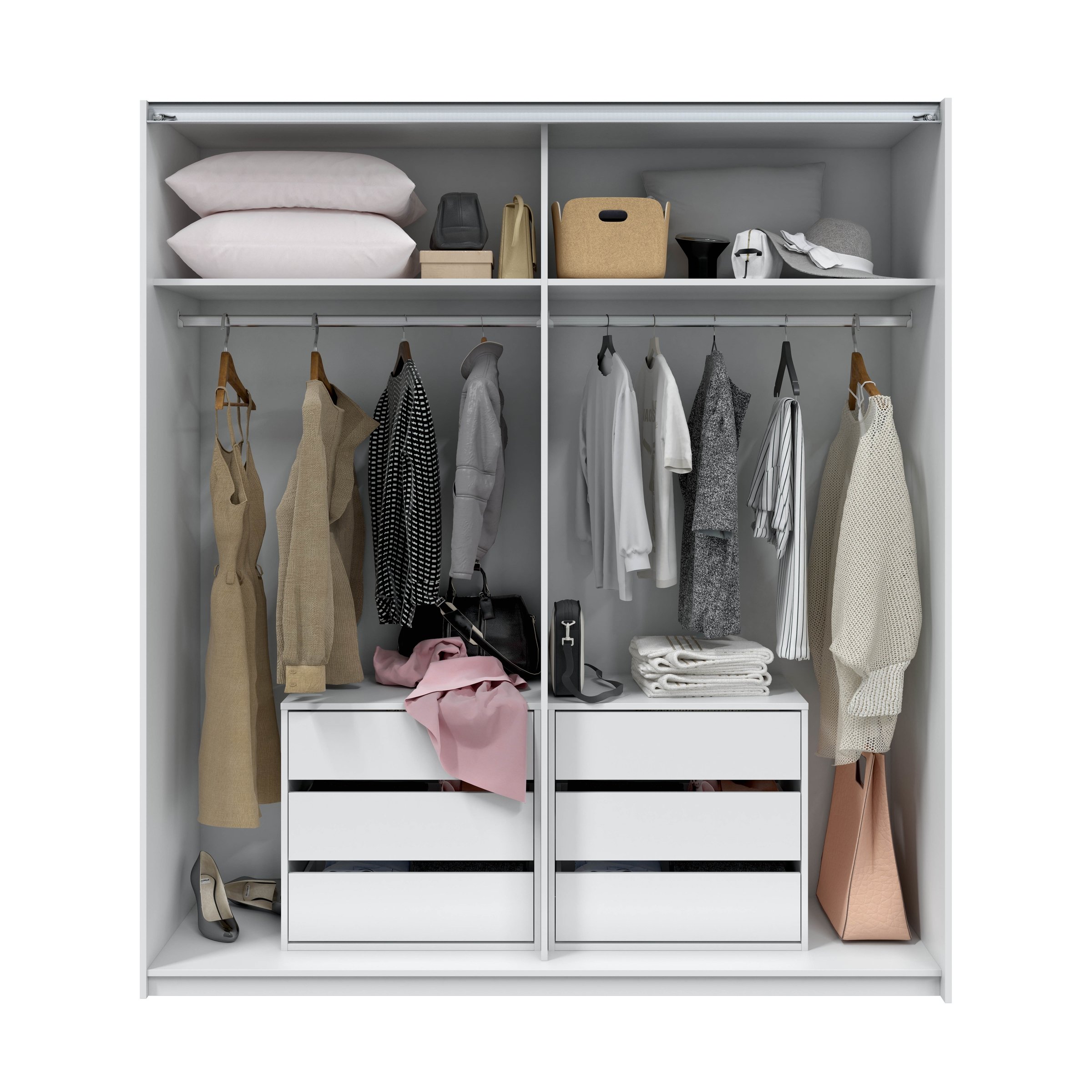 Die drei Schubladen bieten reichlich Platz für alles, was sonst lose im Schrank liegen würde. Ob Socken, Wäsche, T-Shirts oder kleinere Accessoires – alles findet seinen festen Platz und bleibt dank der Schubladenfronten ordentlich verborgen. So wirkt Ihr Kleiderschrank aufgeräumter und die tägliche Kleiderwahl wird erleichtert.