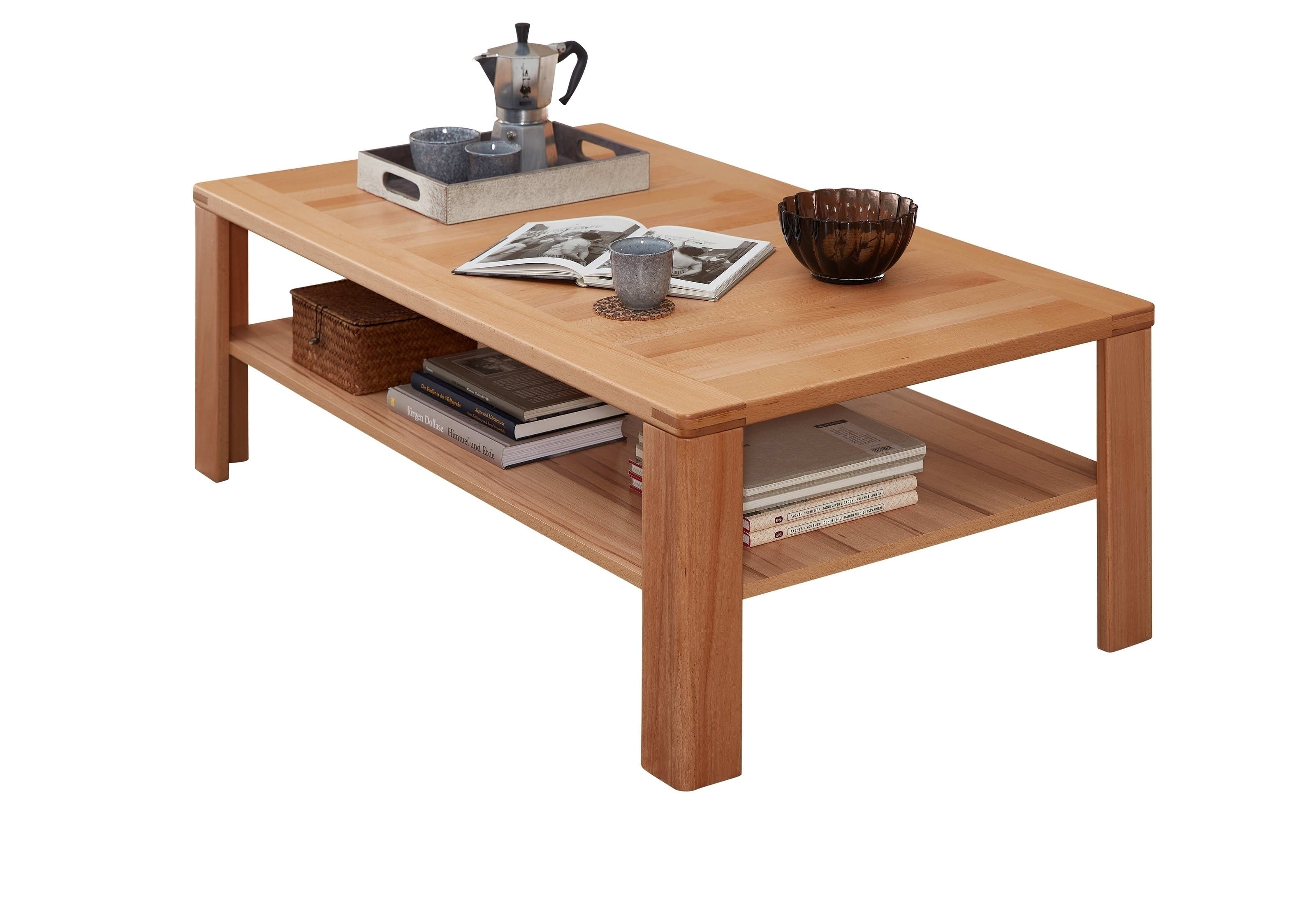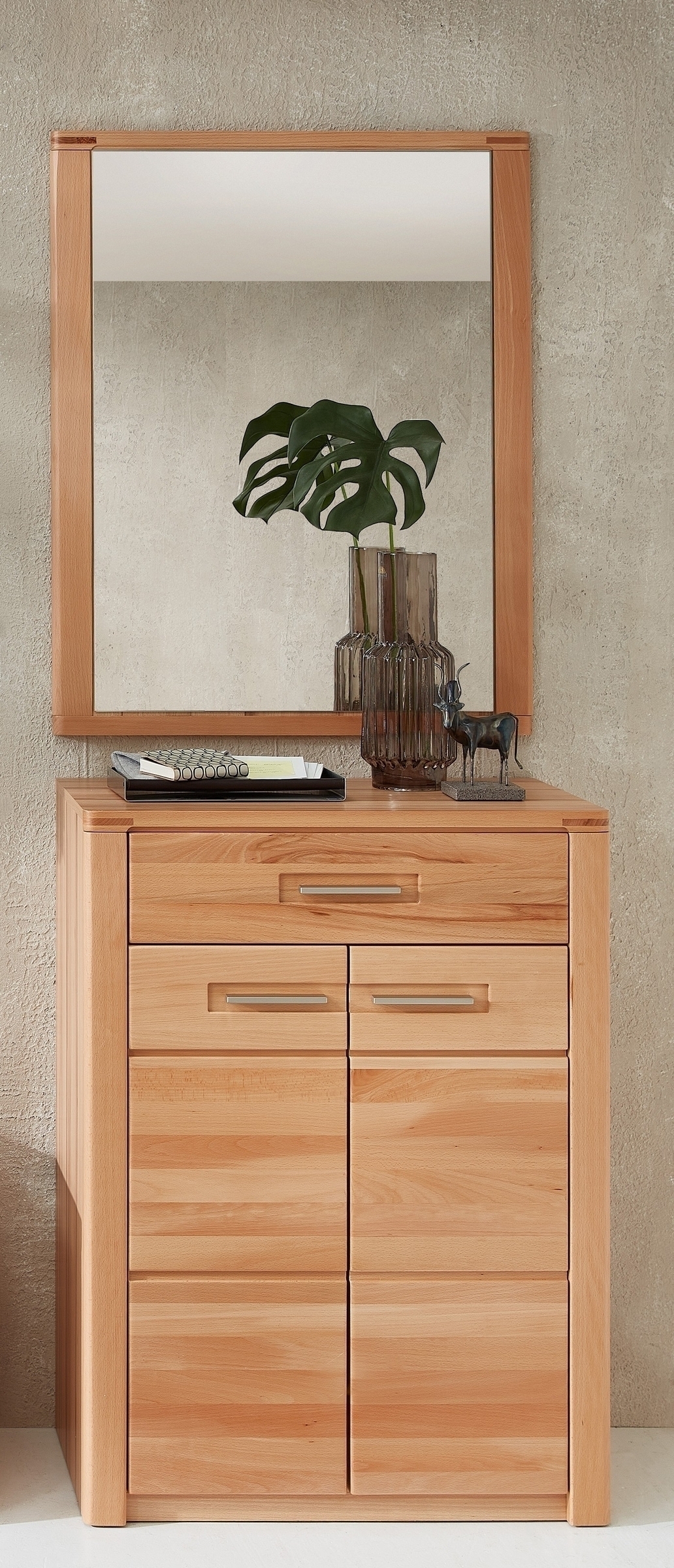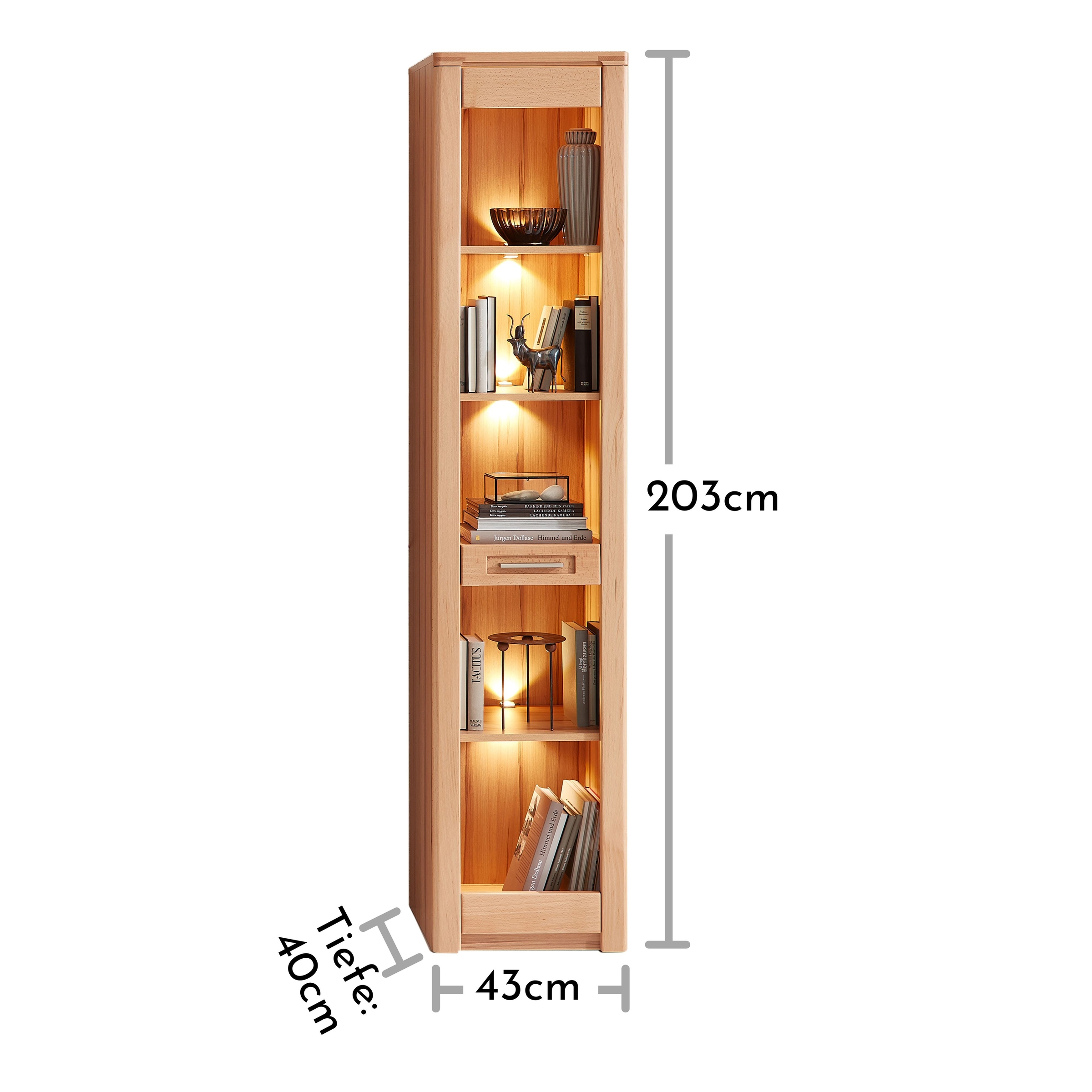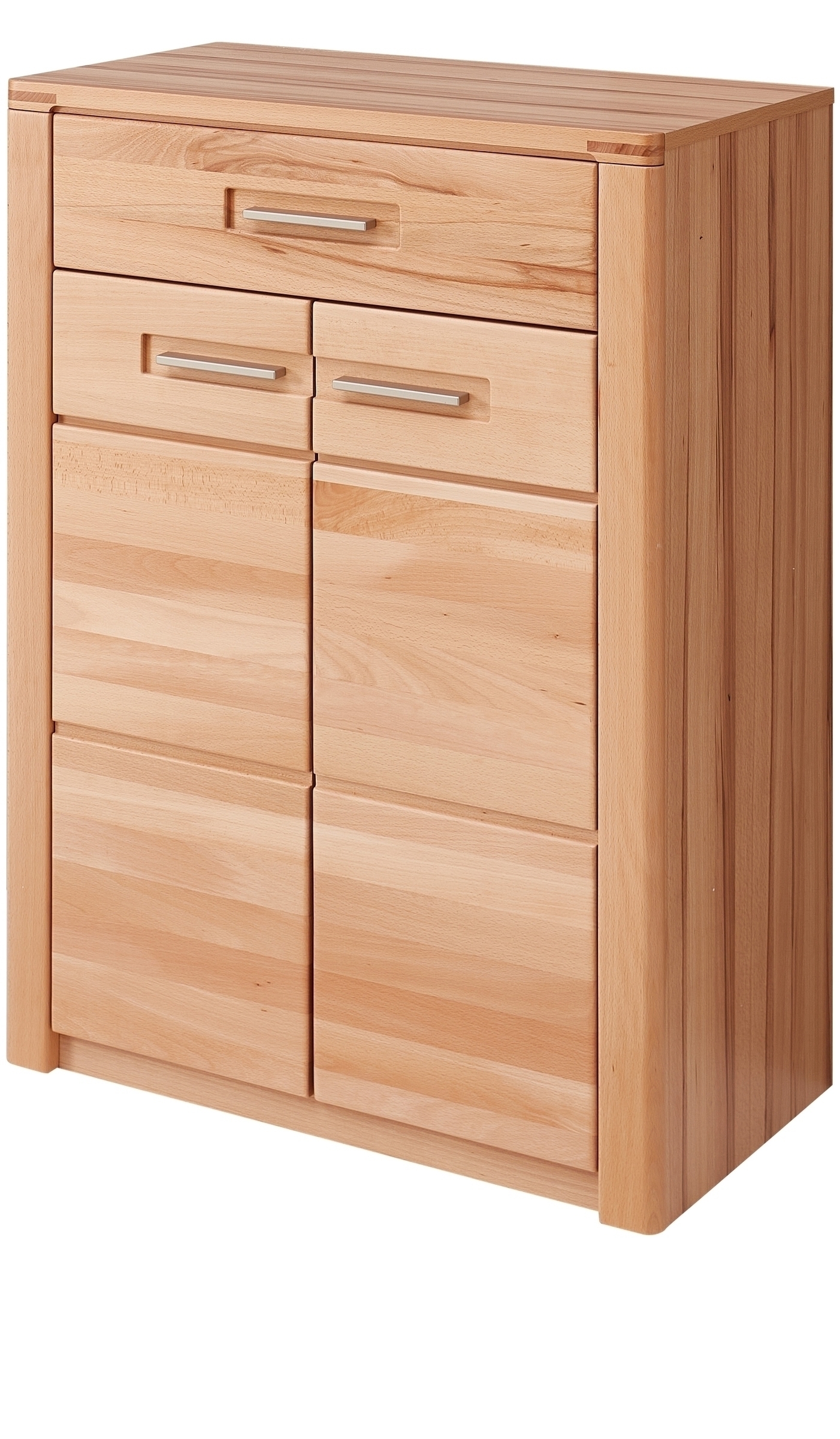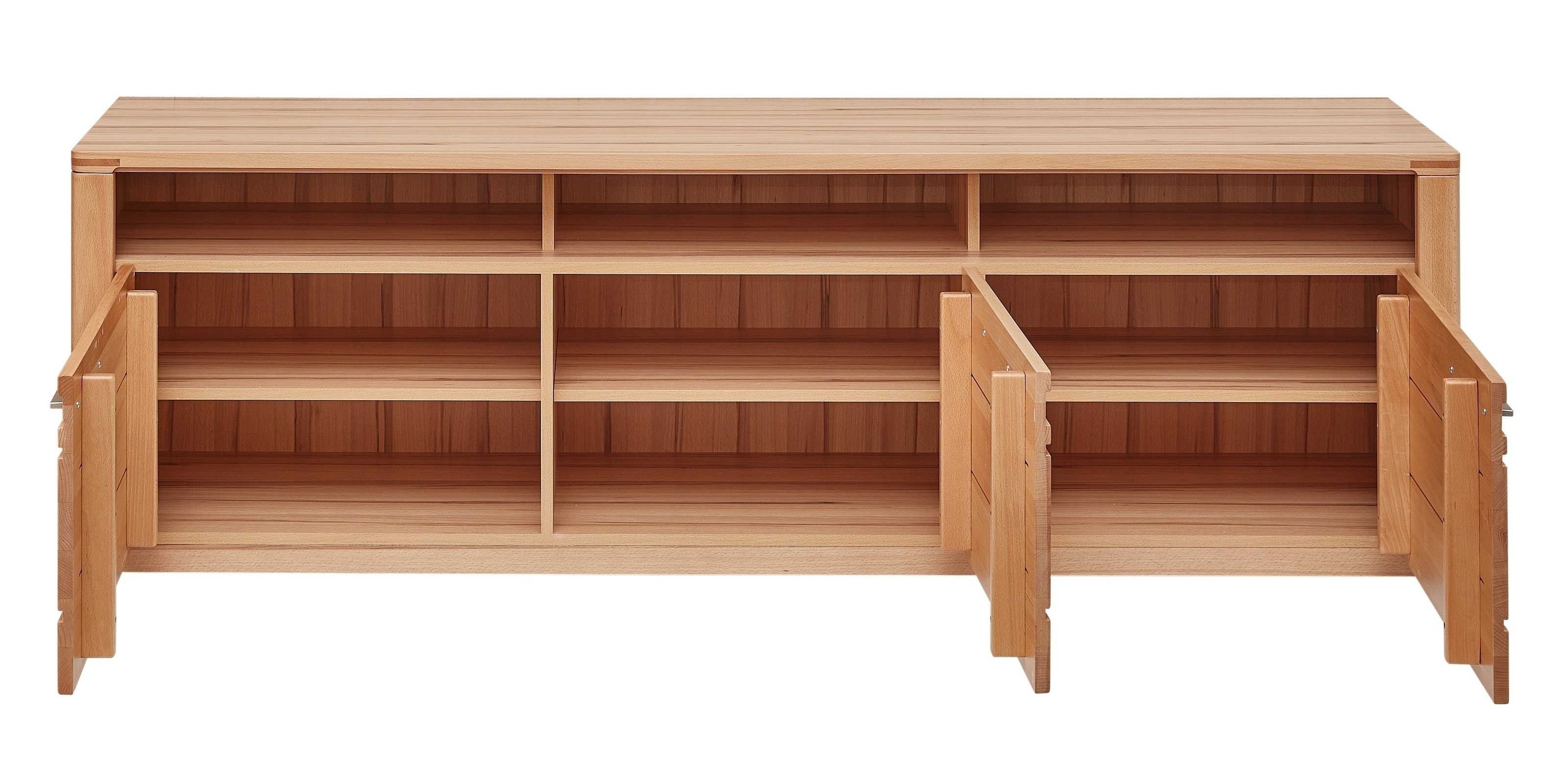 Die Front aus massiver, lackierter Kernbuche sorgt für langlebige Qualität und eine warme Holzoptik.