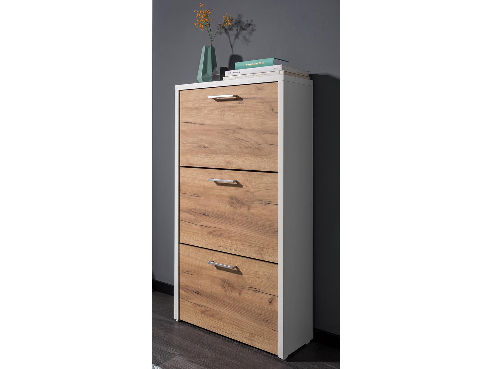 Moderner Schuhkipper aus melaminharzbeschichteter Spanplatte, Korpus in Weiß, Front in Honig-Eiche Nachbildung mit 3 Klappen mit Doppelwalze. Breite 61 cm, Höhe 115 cm, Tiefe 25 cm