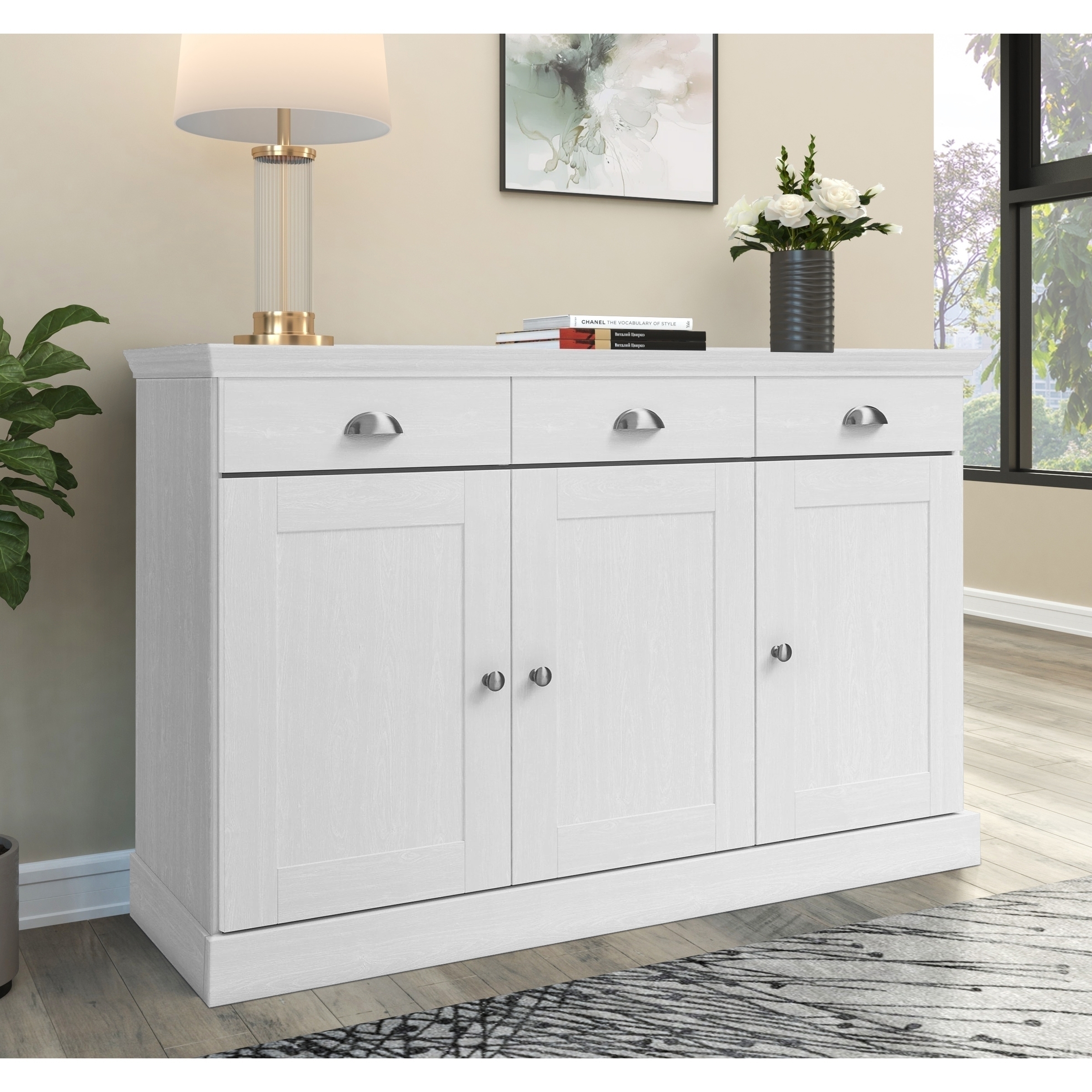 [Bullet-Point 1] => Geräumiges Sideboard in Weiß mit Maßen 125x80x35 cm (B/H/T) – stilvolle Funktionalität für Wohnzimmer, Flur oder Essbereich