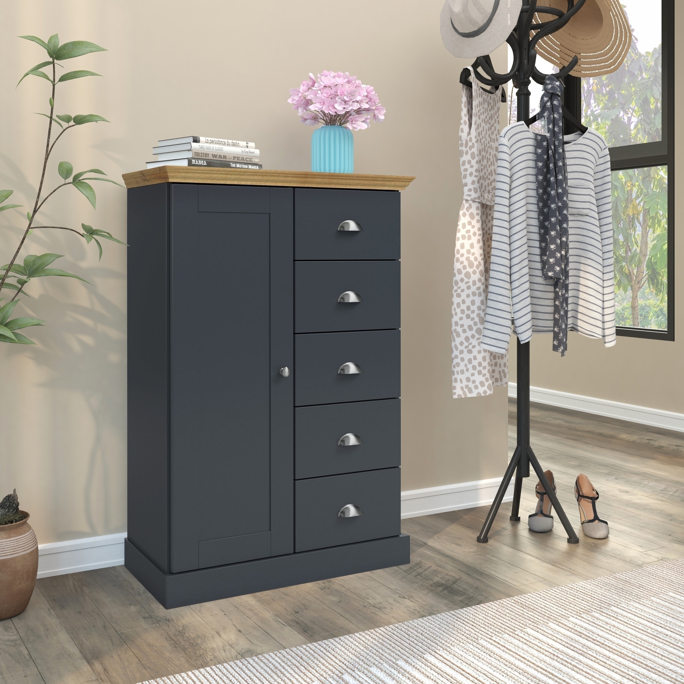 Die Kombination aus Spanplatte, MDF und pflegeleichter Folienbeschichtung in Holzoptik verleiht dem Schuhschrank ein modernes, zeitloses Erscheinungsbild. Anthrazitfarbene Fronten, silberne Muschelgriffe aus Metall und ein stabiles Rahmengestell sorgen für eine harmonische Optik und langlebige Qualität, unterstützt durch FSC-zertifiziertes Holz.