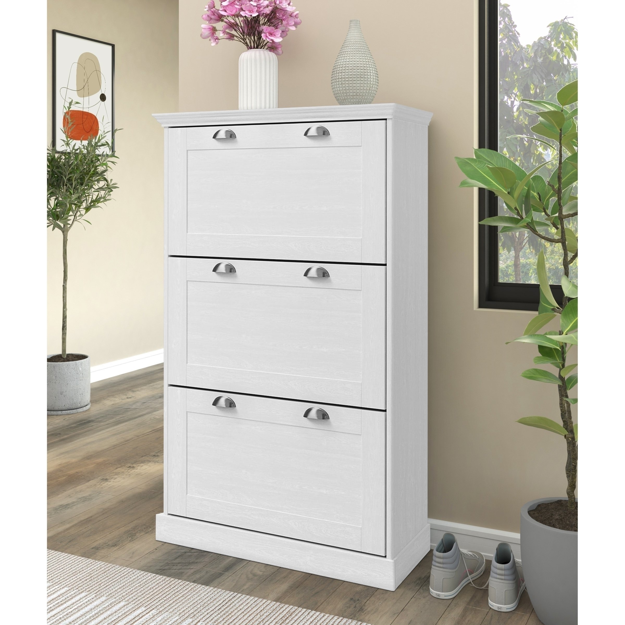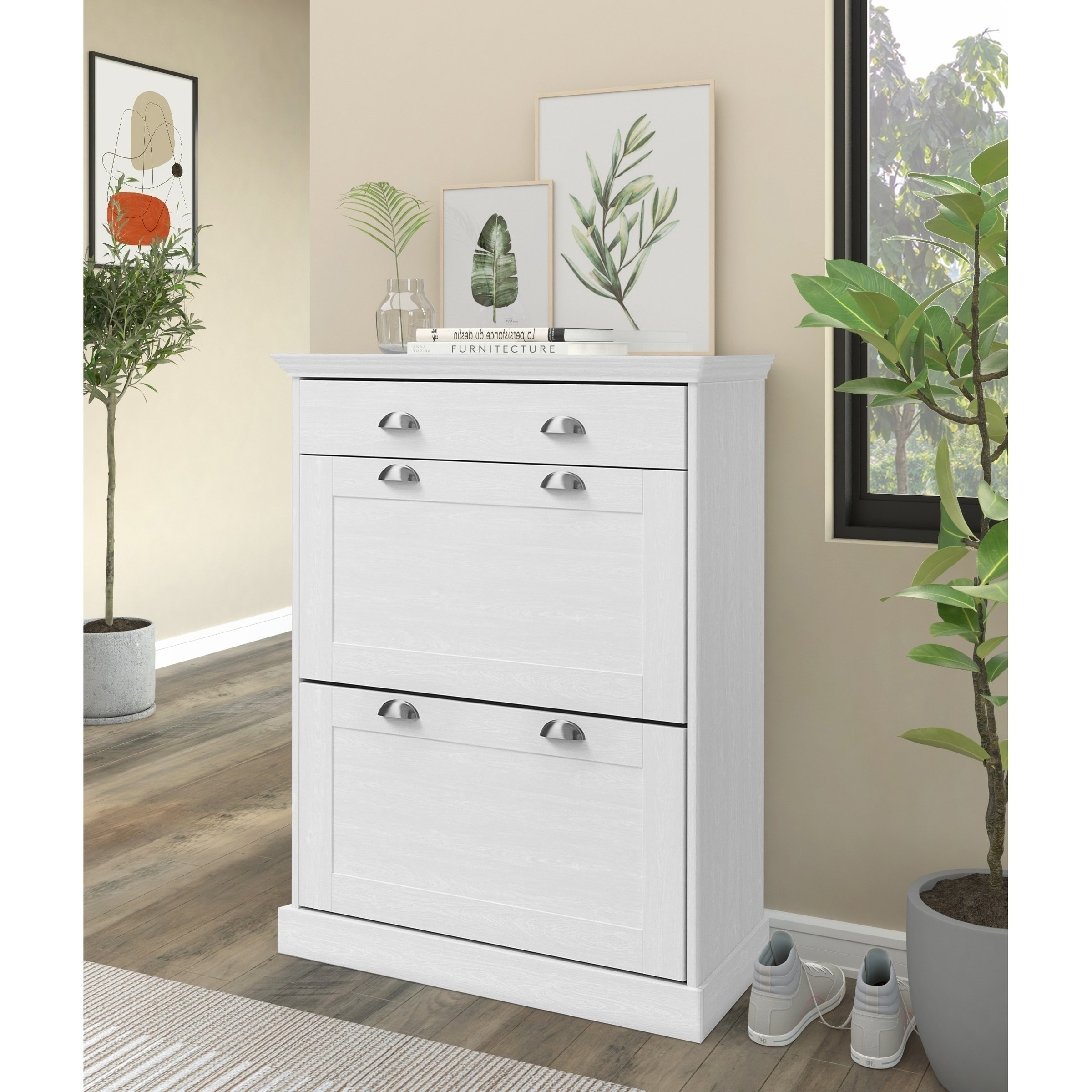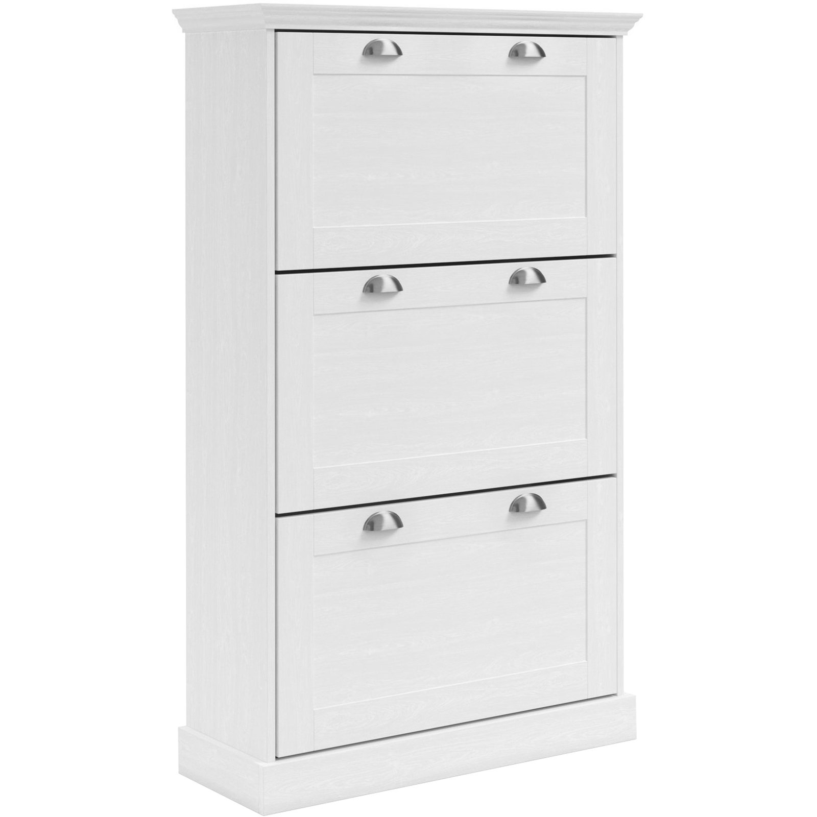 Drei praktische Klappen aus Spanplatte bieten großzügigen Stauraum für Schuhe und Accessoires, sodass alles schnell griffbereit und dennoch unsichtbar verstaut ist. Die schlanke Bauweise macht den Schuhkipper besonders geeignet, wenn wenig Platz vorhanden ist, aber viel Ordnung gewünscht wird.