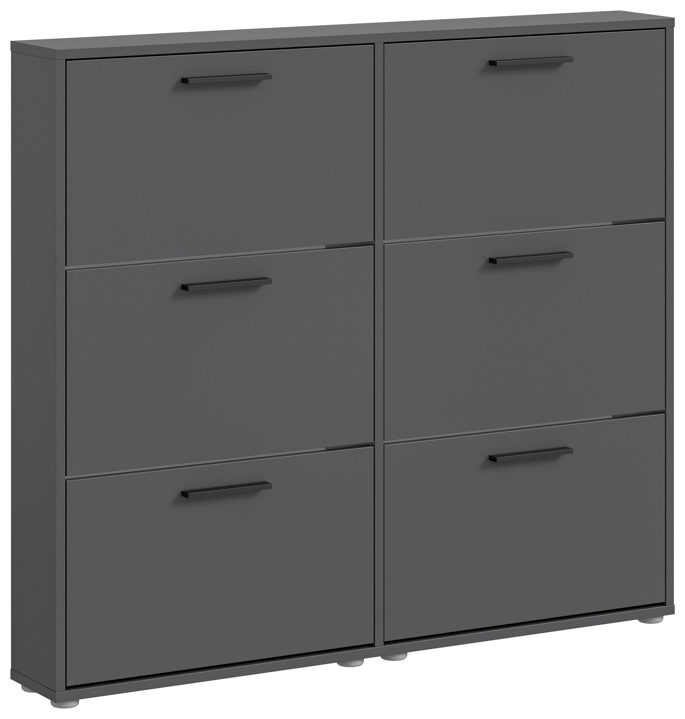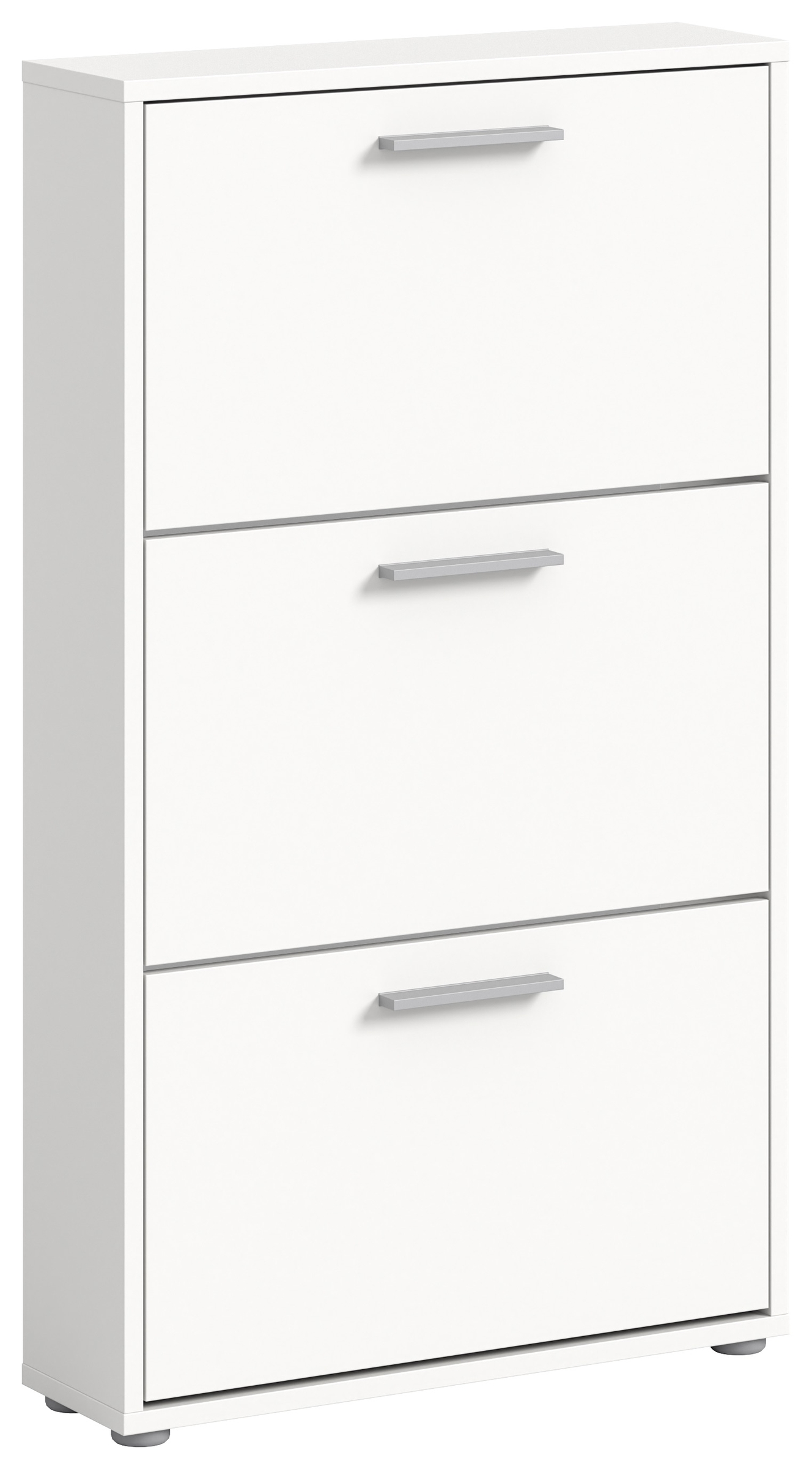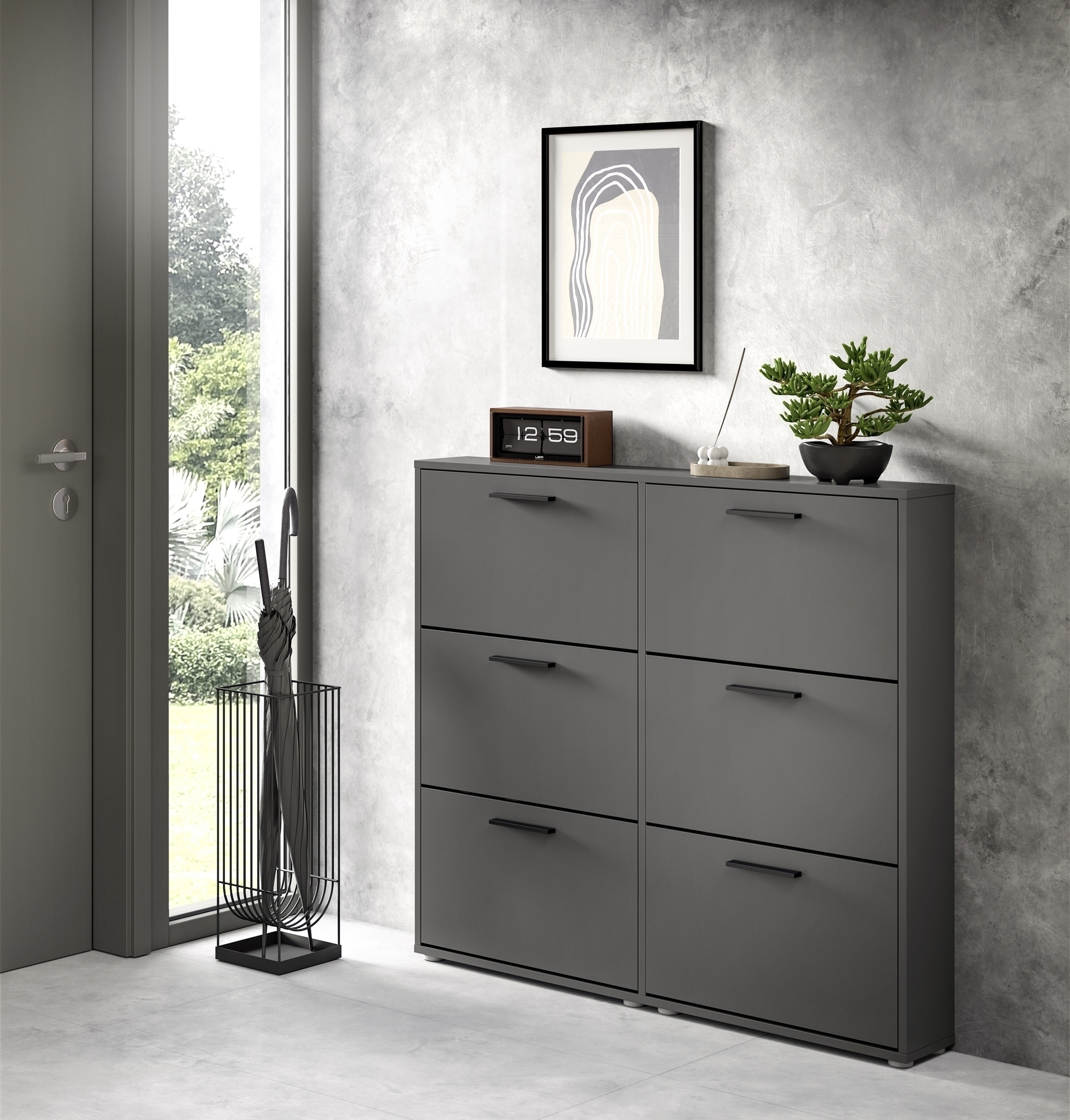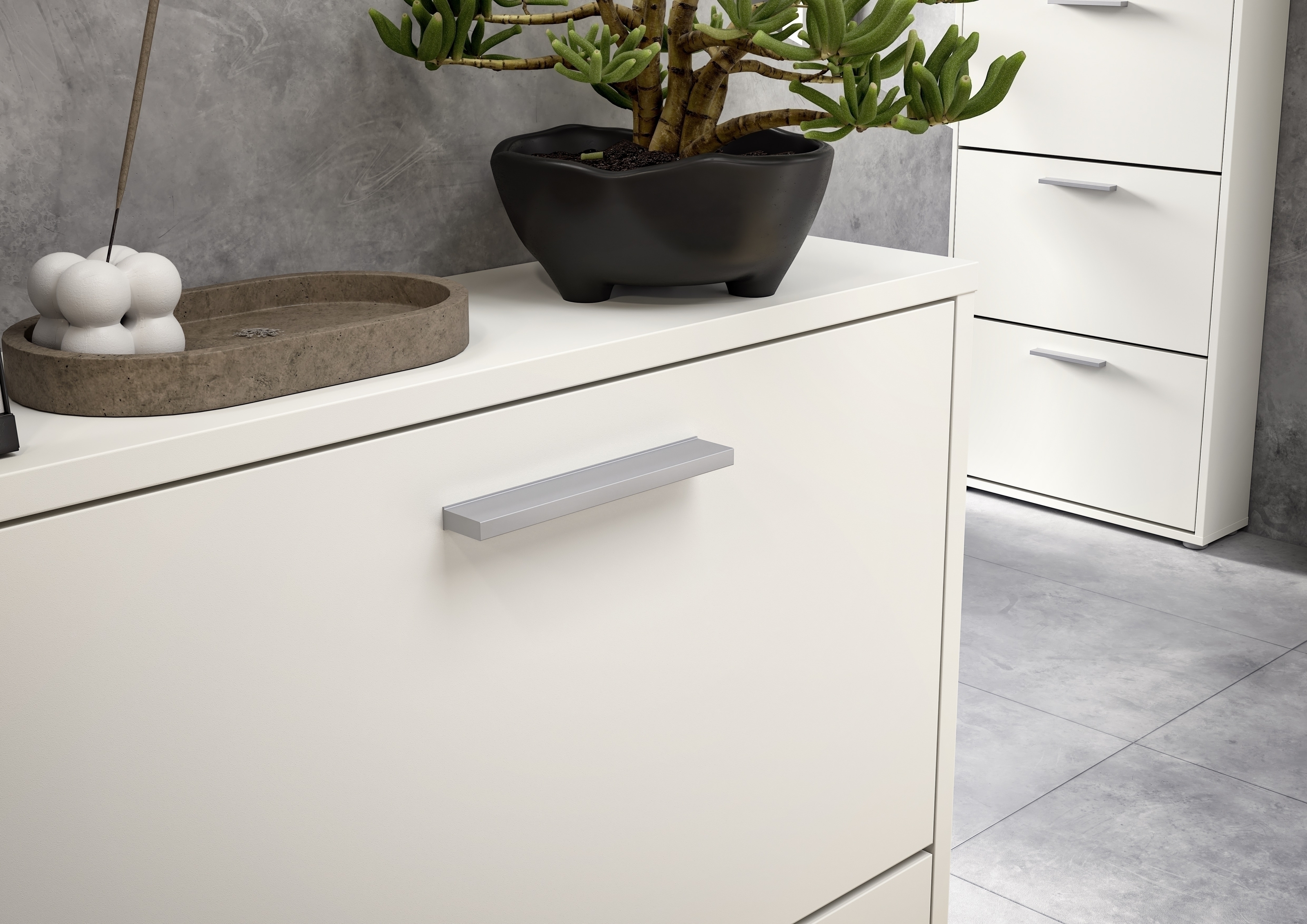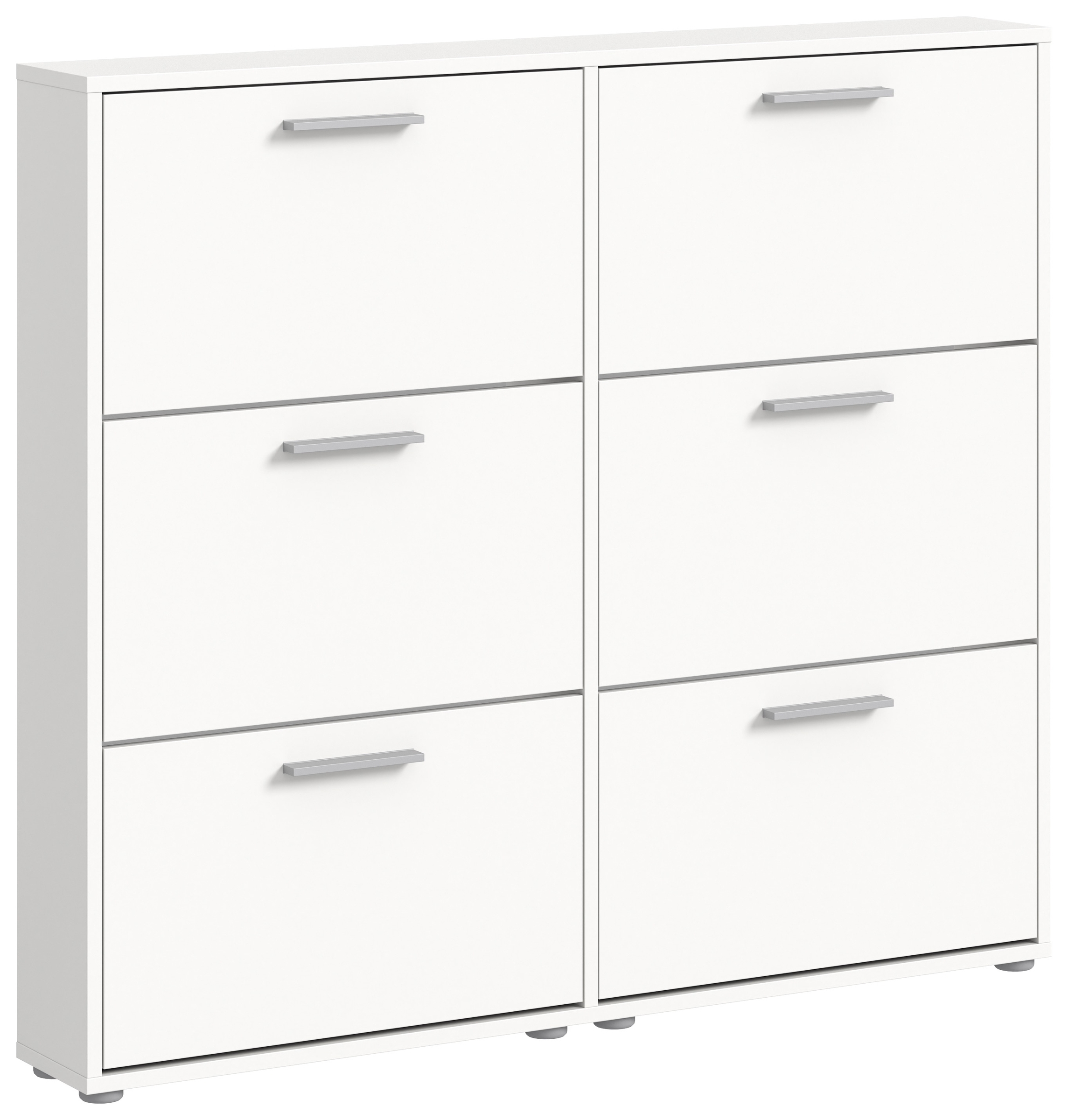 Dank der drei praktischen Klappen verstauen Sie mehrere Paar Schuhe geordnet und griffbereit, ohne wertvollen Stellplatz zu verschenken. Die eleganten, schwarzen Griffleisten ermöglichen ein komfortables Öffnen und Schließen im täglichen Gebrauch.