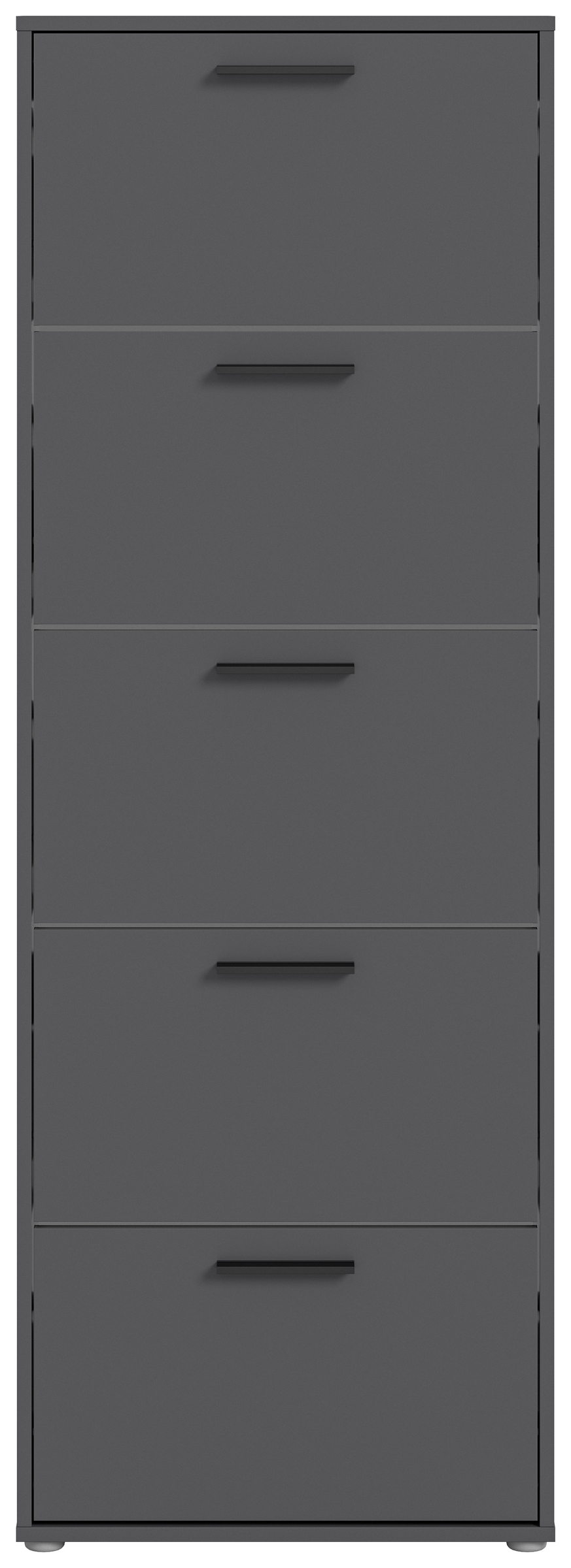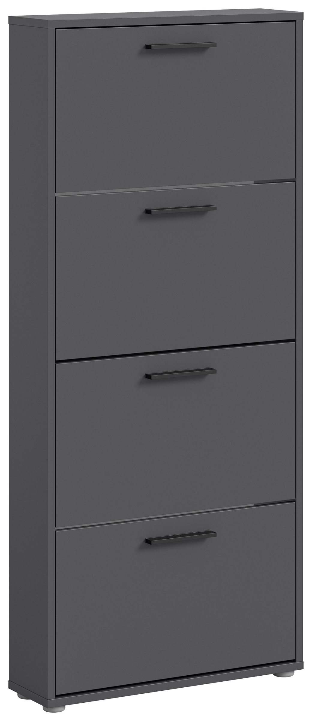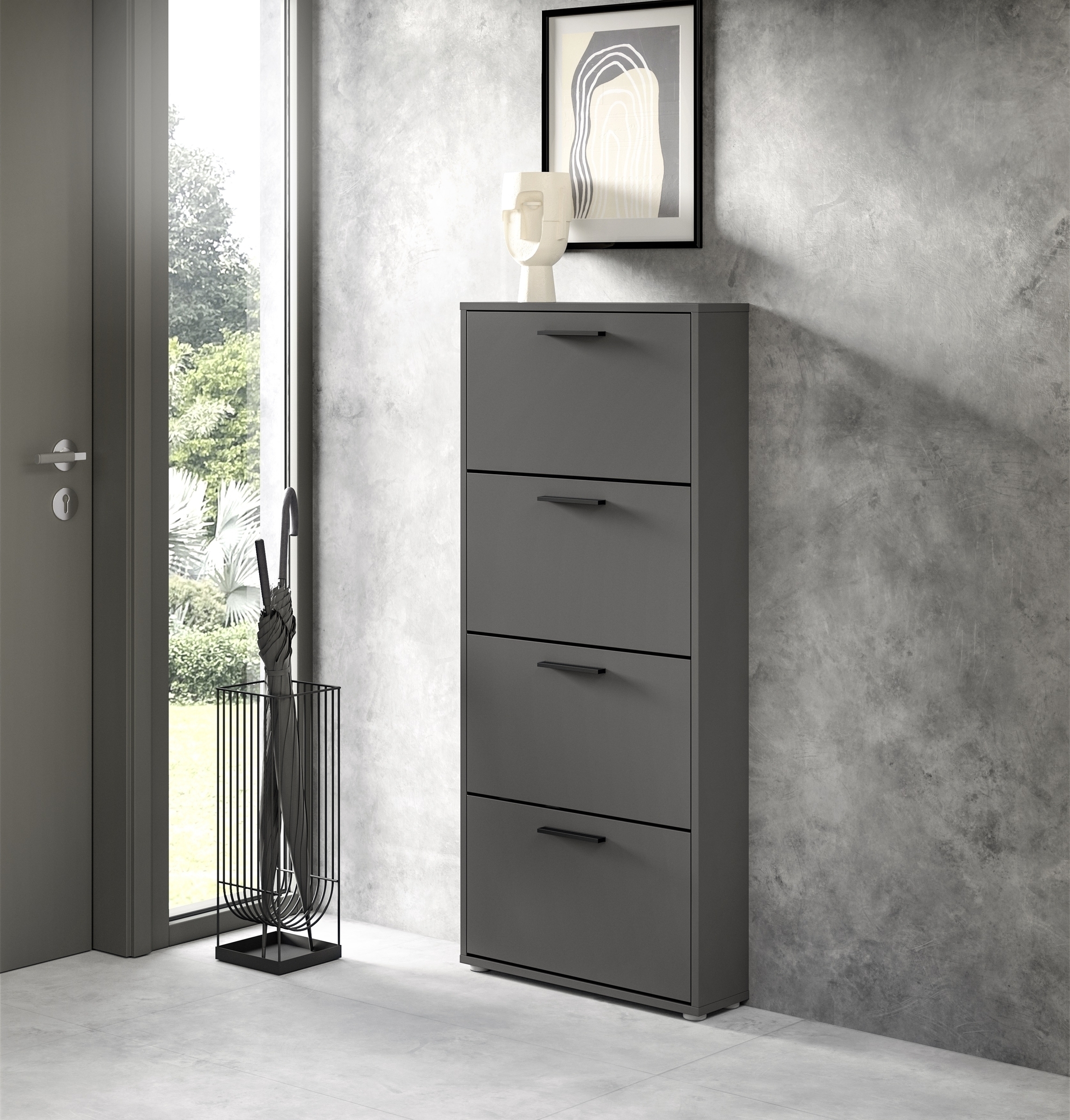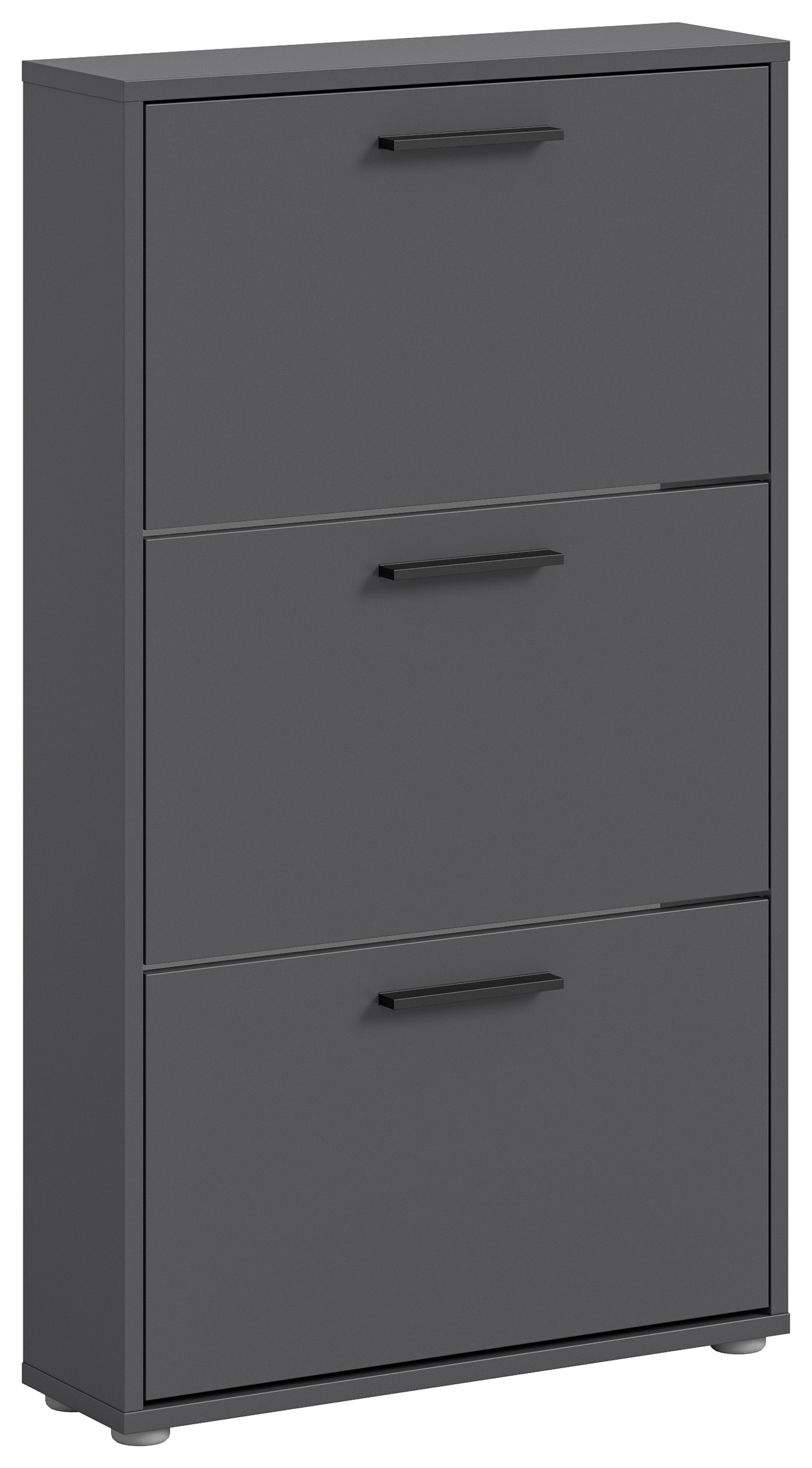 Ausgestattet mit drei praktischen Klappen bietet der Kipper ausreichend Platz für mehrere Paar Schuhe, die ordentlich und staubgeschützt verstaut werden. Die formschönen, schwarzen Griffleisten ermöglichen ein bequemes Öffnen und Schließen der Klappen, während die grauen Kunststofffüße für einen stabilen Stand sorgen und das Möbel leicht vom Boden abheben.