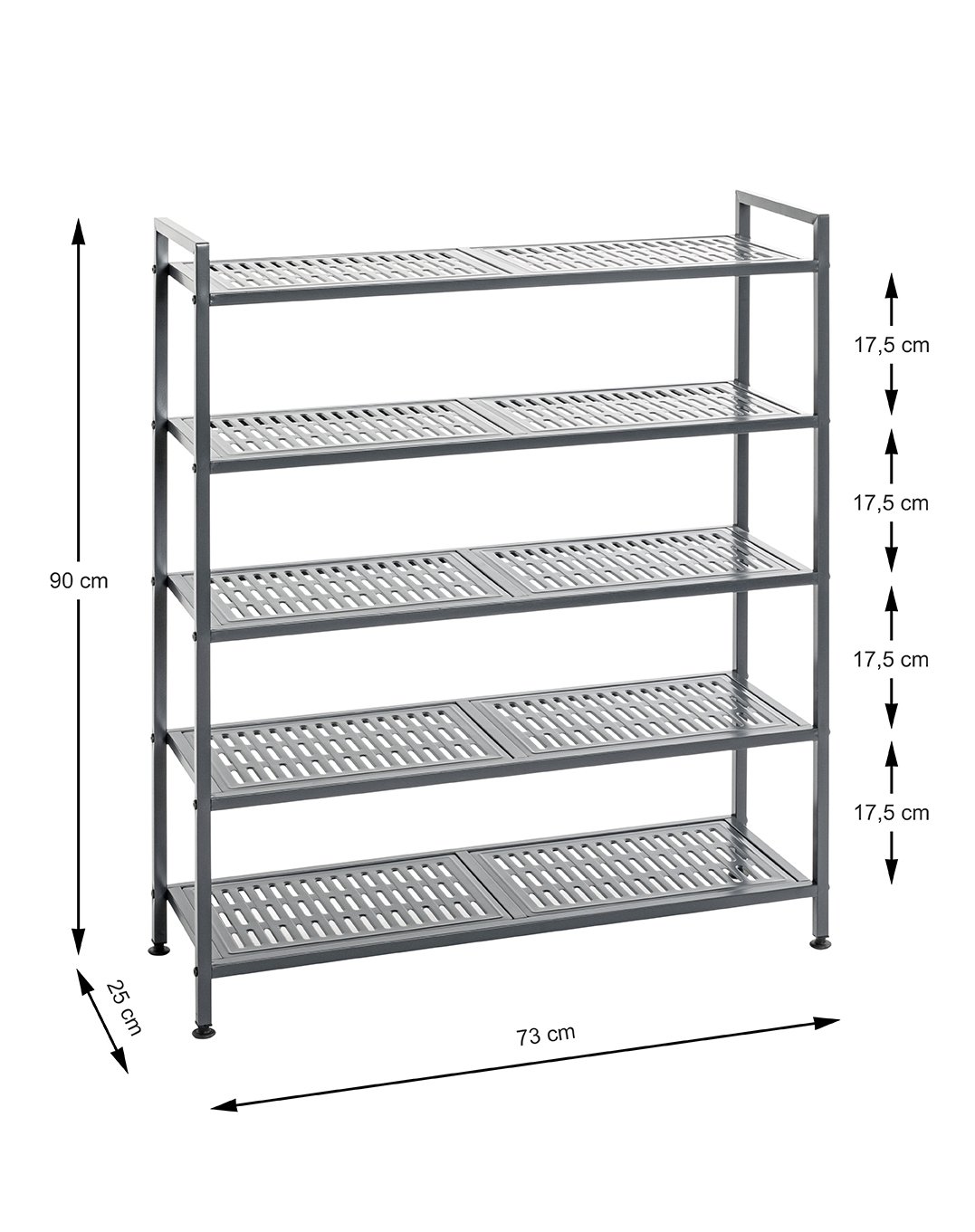 Gefertigt aus robustem, pulverbeschichtetem Stahlrohr in elegantem Anthrazit verbindet das Regal moderne Optik mit hoher Stabilität. Die fünf stabilen Ablagen bieten Platz für ca. 20 Paar Schuhe und tragen jeweils bis zu 12 kg – ideal für Alltagsschuhe, Sneaker und vieles mehr.