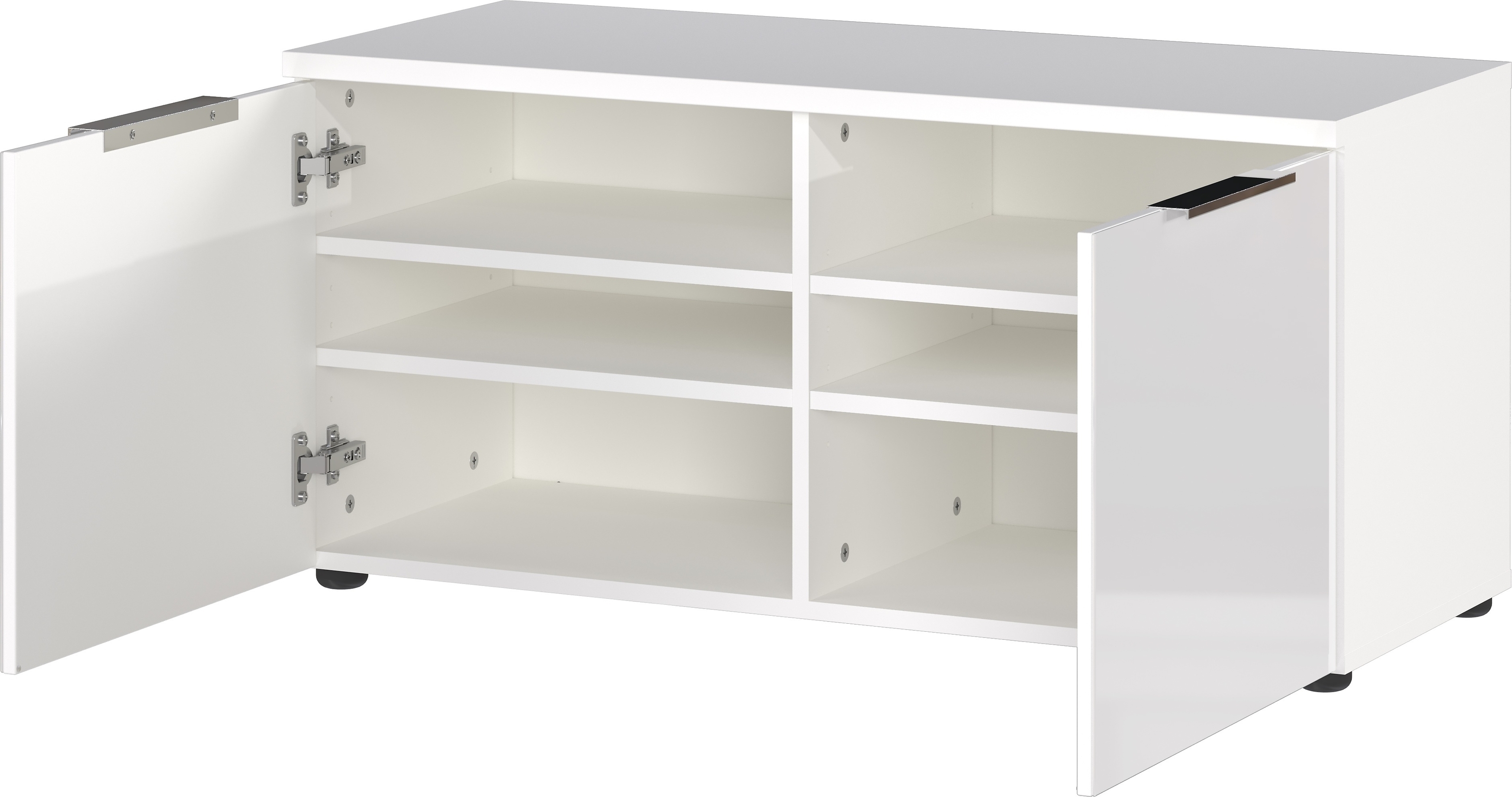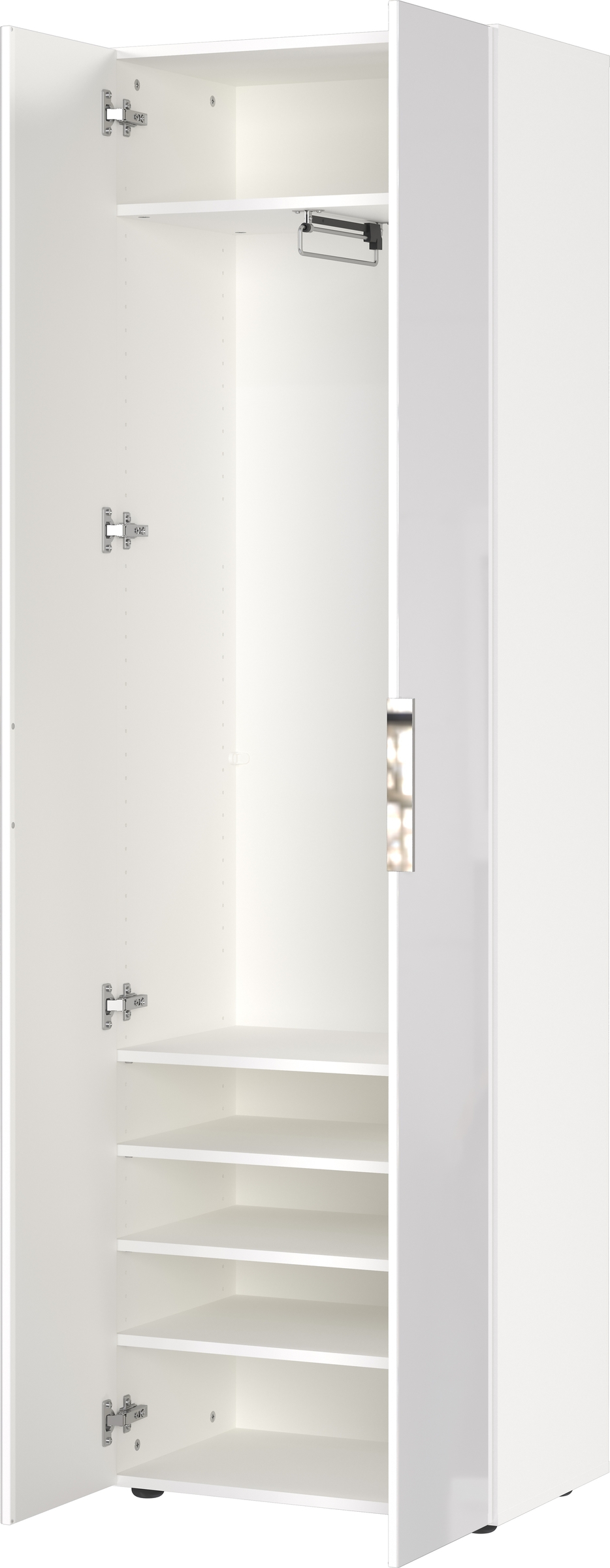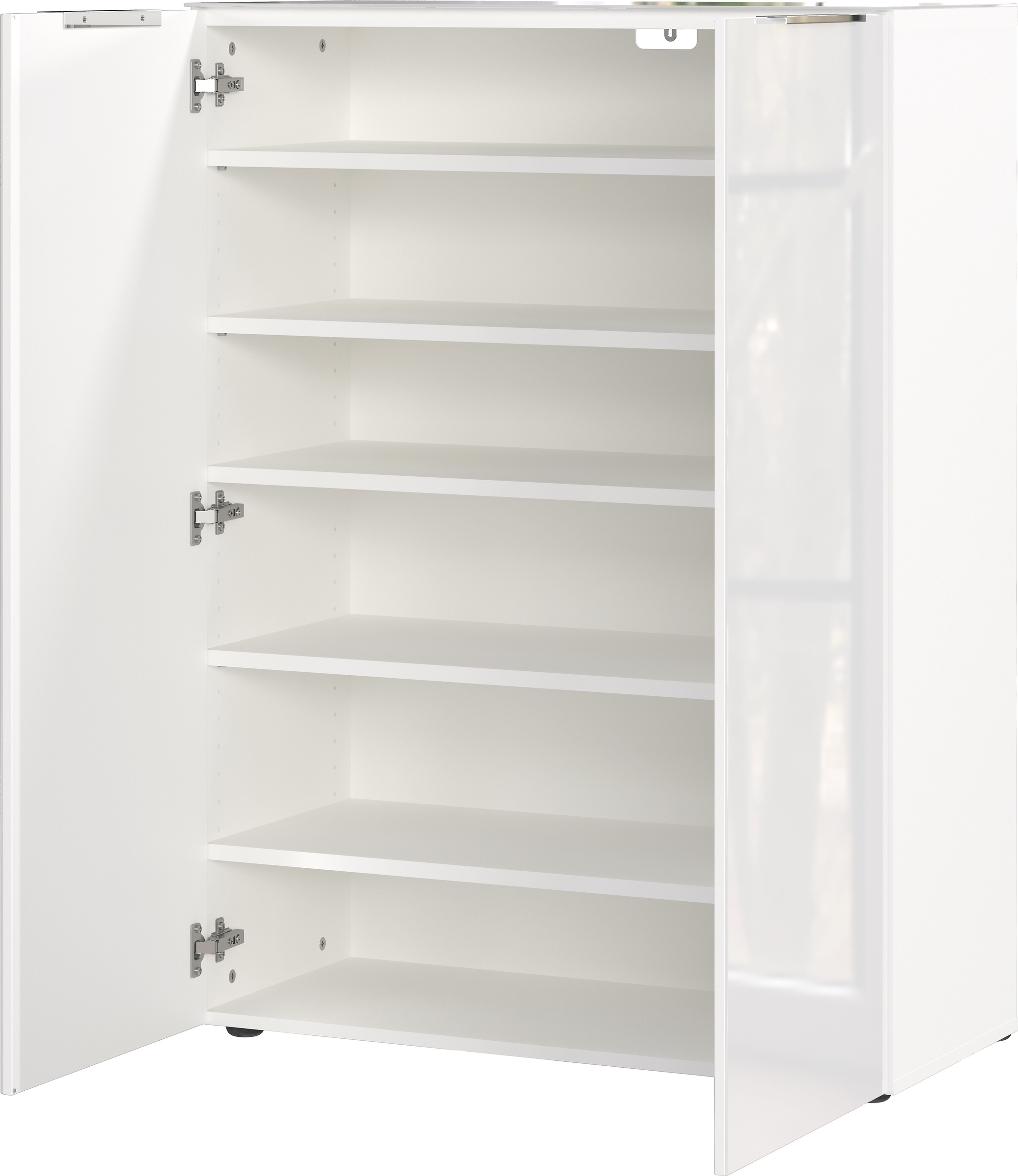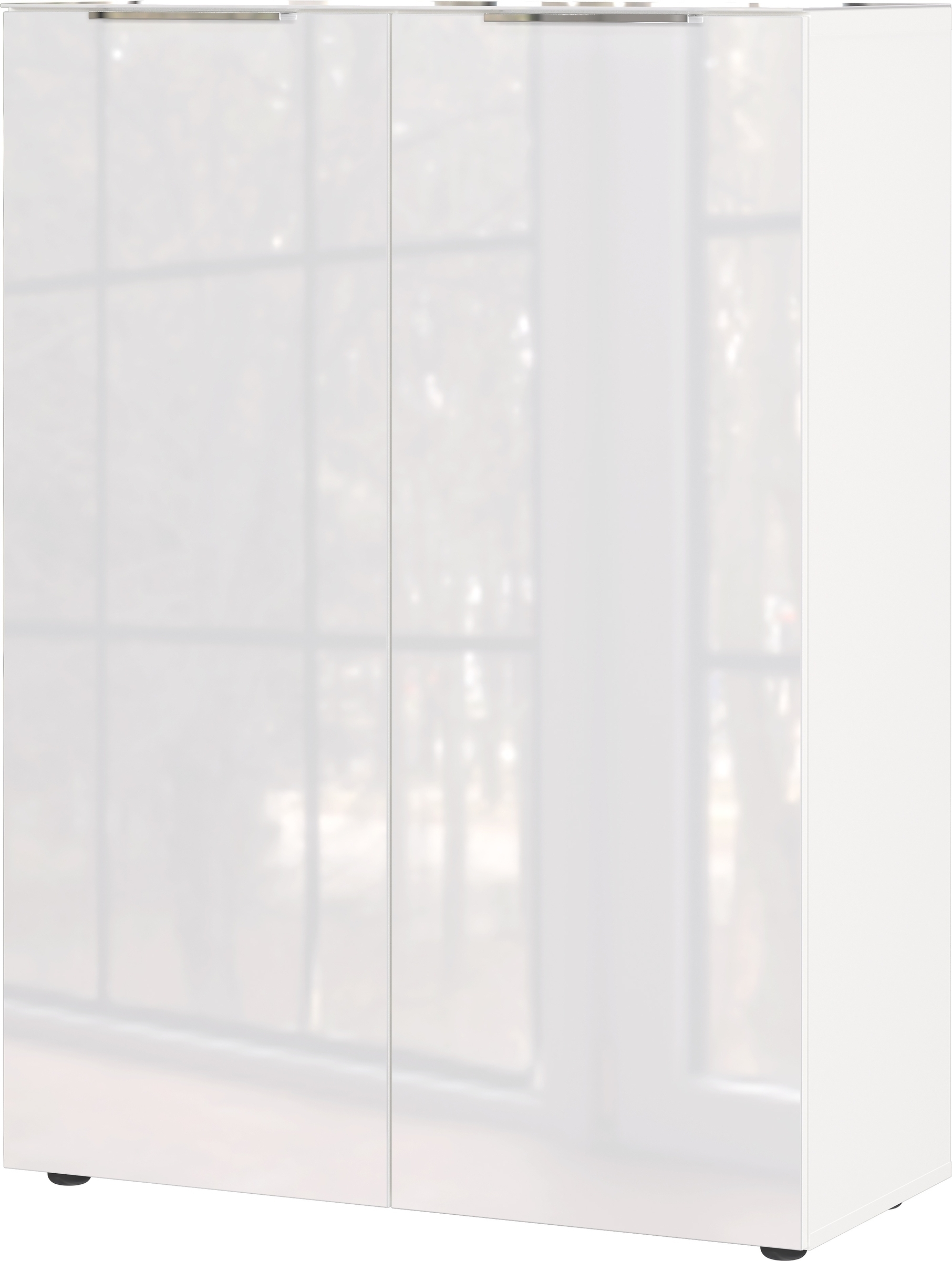 Die weiße Glasfront auf melaminharzbeschichteter Spanplatte sorgt für eine edle Anmutung und ist zugleich kratzfest, pflegeleicht und robust im täglichen Gebrauch. Hinter den beiden Drehtüren mit Türdämpfung verbergen sich ein fester Boden und vier individuell verstellbare Einlegeböden, die jeweils bis zu 10 kg tragen und so auch für schwereres Schuhwerk geeignet sind.