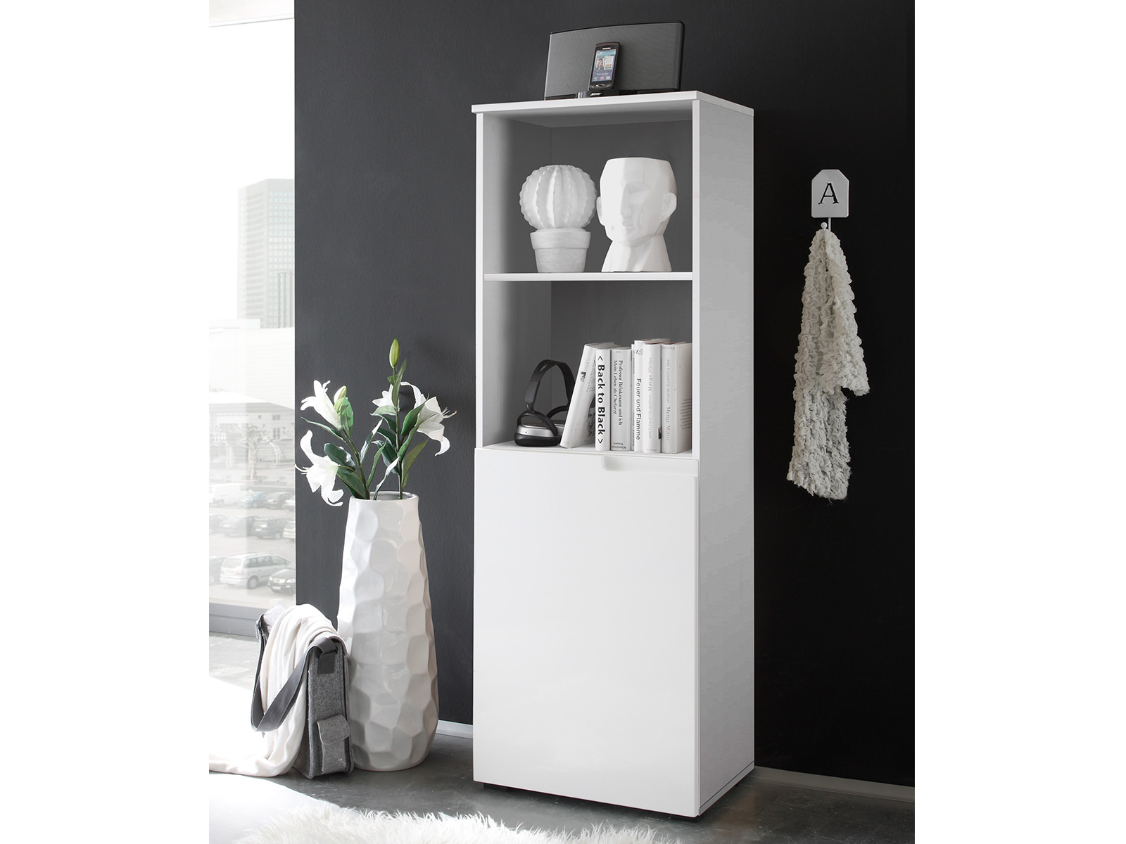 [metaDescription] => Modernes Regal, Korpus aus Spanplatte in Weiß, Front aus MDF in Weiß-Hochglanz mit 1 Tür 1 Einlegeboden und 2 offene Fächer Breite 50 cm, Höhe 145 cm, Tiefe