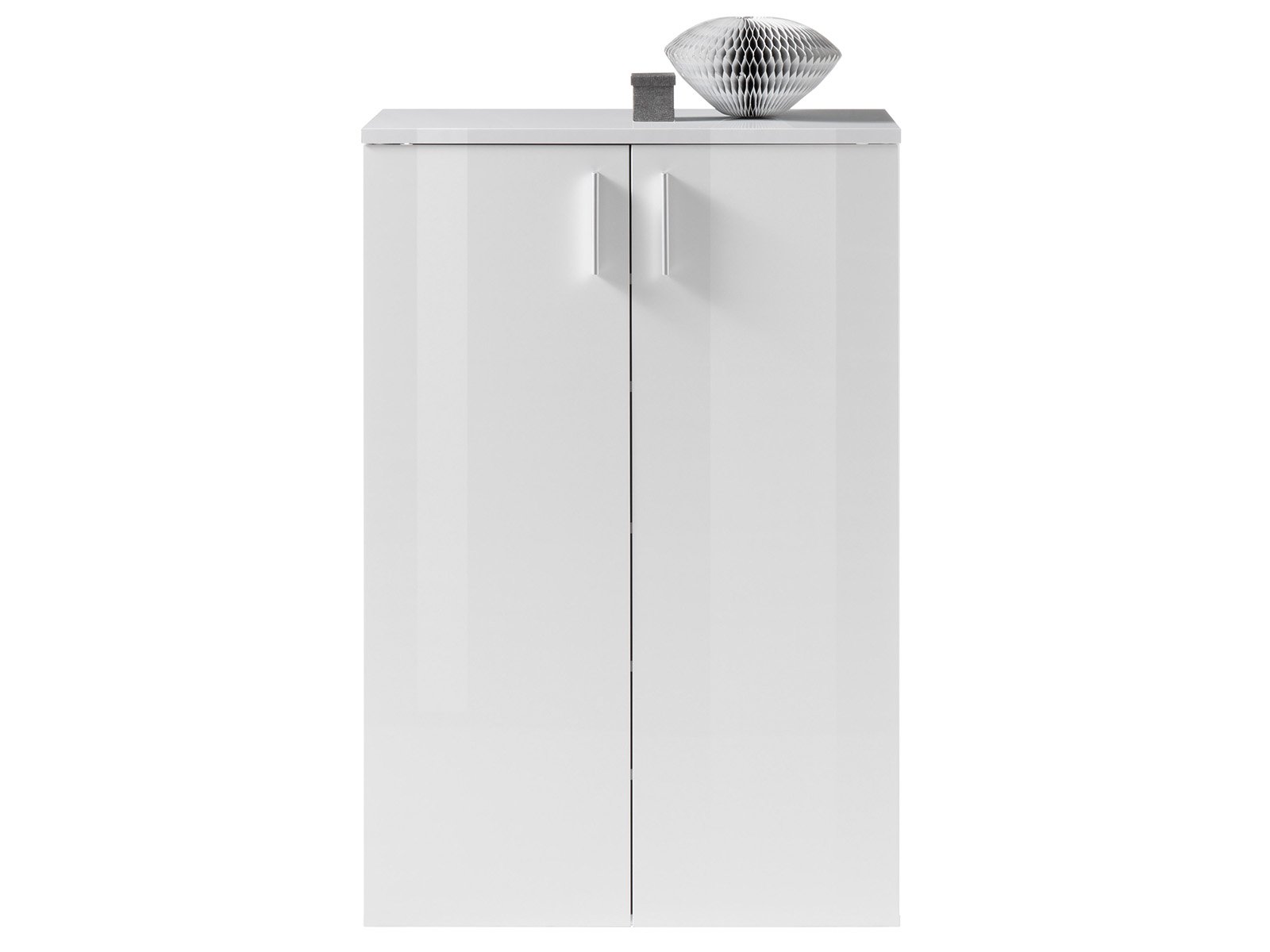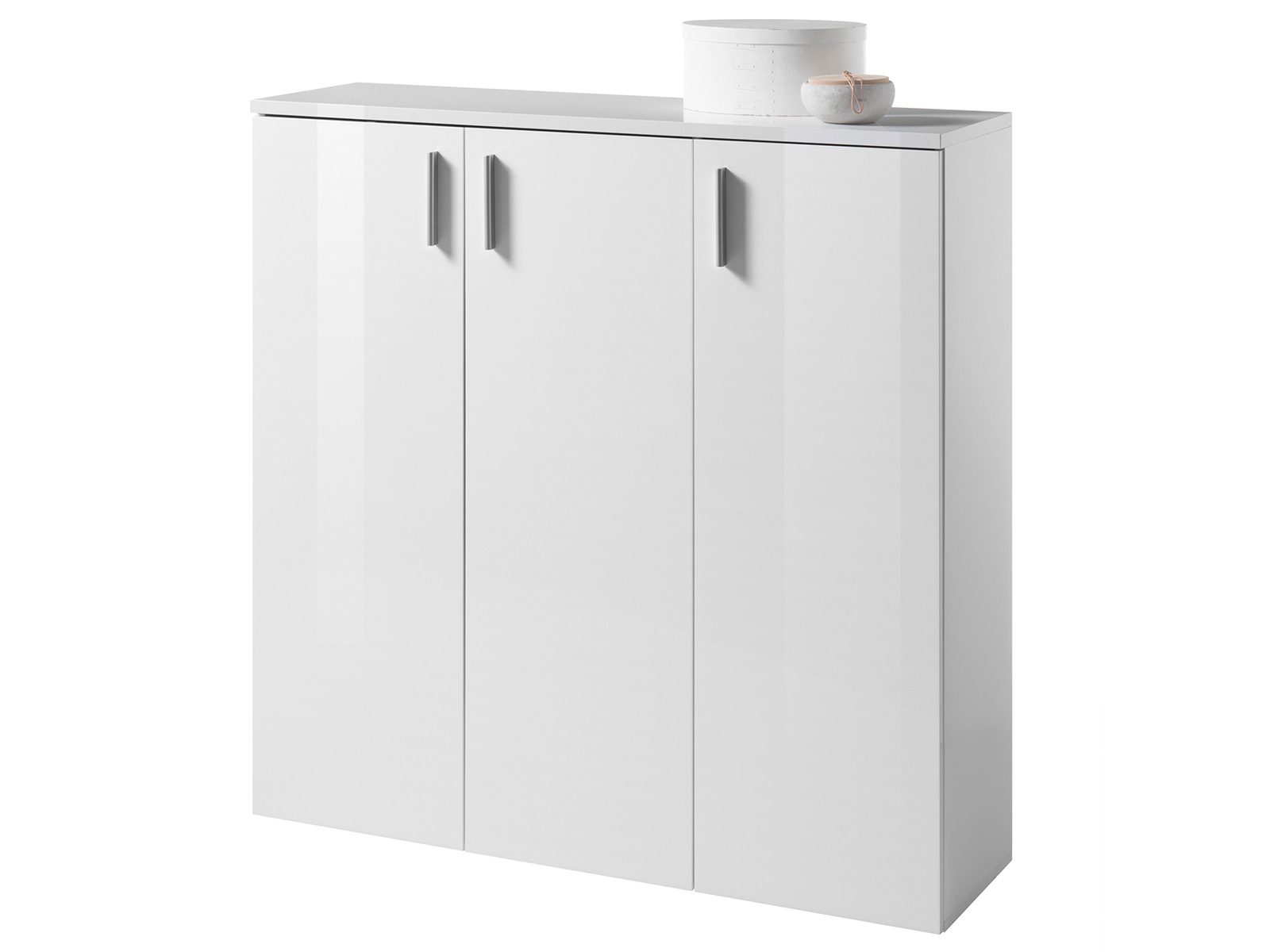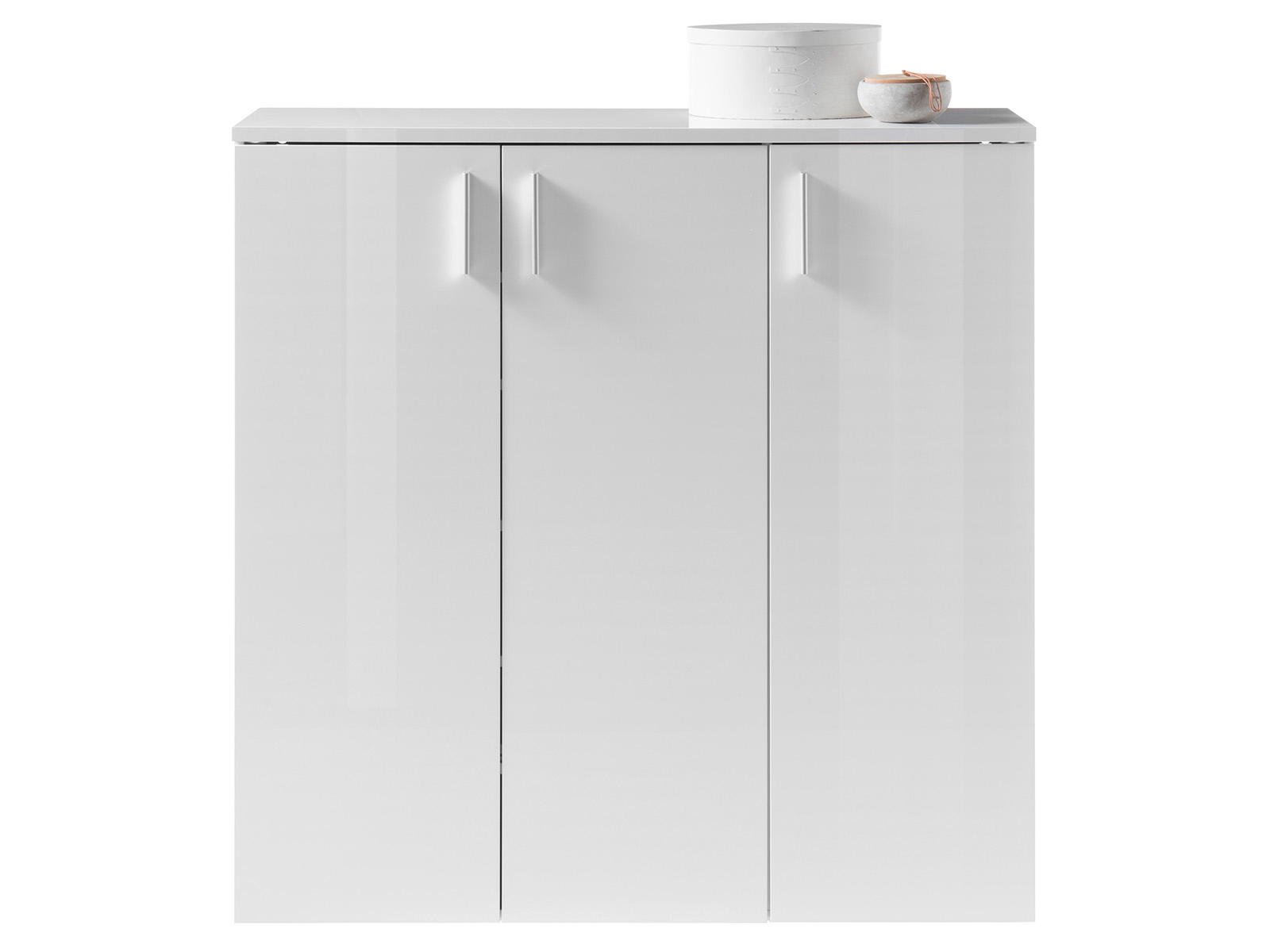 Das moderne Design mit einem Korpus in Weiß und einer Front in Weiß-Hochglanz verleiht dem Möbelstück eine klare, frische Optik. Diese Farbgestaltung lässt sich unkompliziert mit vielen Einrichtungsstilen kombinieren und sorgt für einen freundlichen ersten Eindruck beim Betreten der Wohnung. Der großzügige Oberboden dient zusätzlich als Ablagefläche und kann dekorativ gestaltet werden.