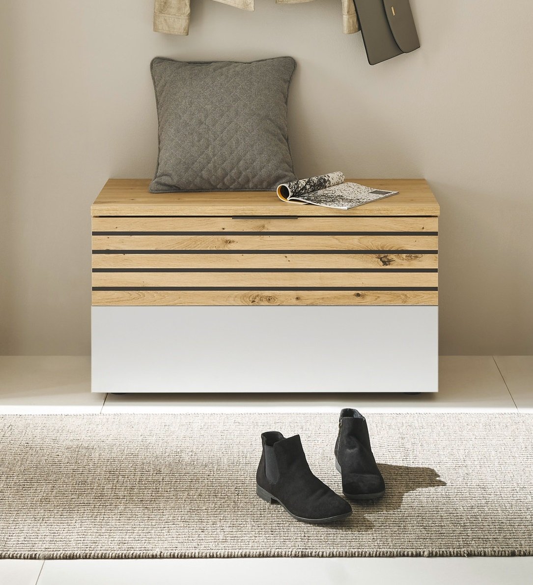 Die Kombination aus weiß matter Dekoroberfläche und Absetzungen in Artisan Eiche verleiht dem Schuhschrank eine moderne, zugleich zeitlose Optik. Das FSC-zertifizierte, E1-konforme Holzwerkstoff-Material und die pflegeleichte Spanplatte unterstreichen die nachhaltige und alltagstaugliche Qualität dieses Möbelstücks.