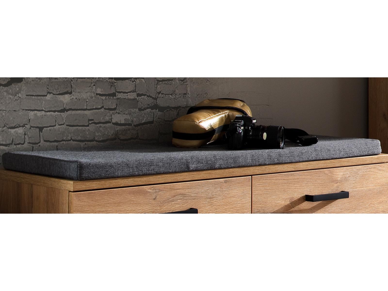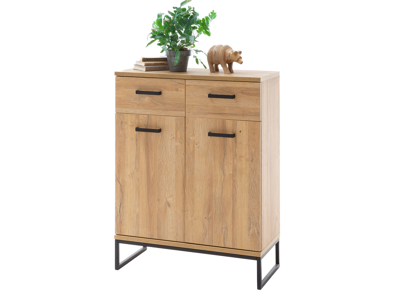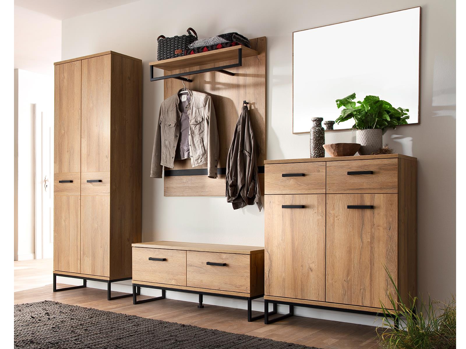 Die melaminharzbeschichtete Spanplatte in Grandson Oak Nachbildung verleiht dem Möbel eine warme, natürliche Ausstrahlung, während das schwarze Metallgestell und die Metallgriffe moderne Akzente setzen. Die robuste Beschichtung macht die Oberfläche pflegeleicht, widerstandsfähig und langlebig – ideal für den täglichen Einsatz im Flur.