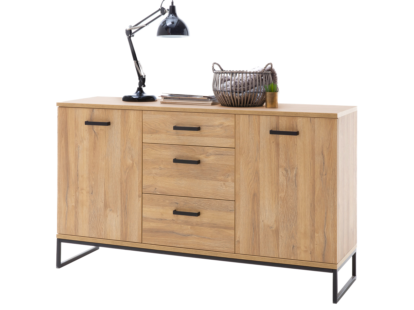 Gefertigt wird "Torrent I" aus melaminharzbeschichteter Spanplatte (DBS), die sich durch ihre pflegeleichte und widerstandsfähige Oberfläche auszeichnet. Die Rückwand besteht aus hochdichter Faserplatte (HDF), während Gestell und Griffe aus schwarzem Metall gefertigt sind. Die Grandson Oak Nachbildung mit täuschend echter Maserung harmoniert perfekt mit den schwarzen Metallakzenten und unterstreicht den modernen Wohnstil.