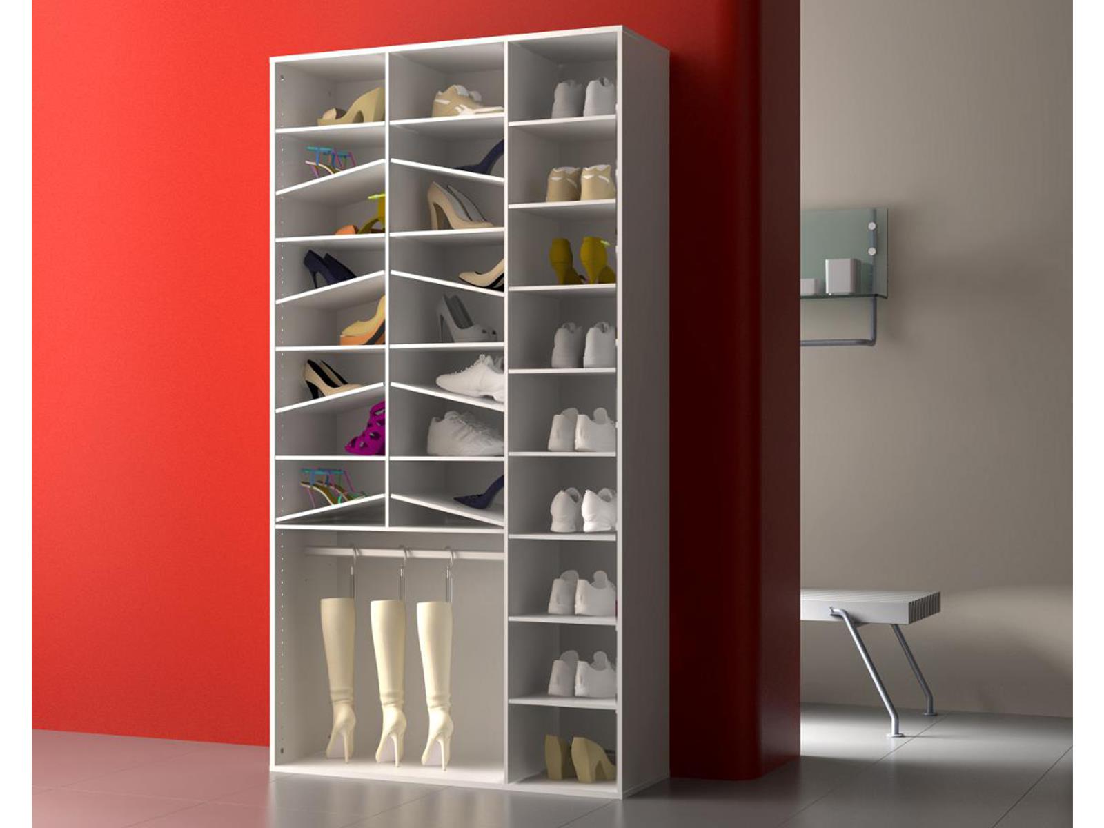16 Einlegeböden, 10 offene Fächer und eine Stange mit 3 Schuhhaltern bieten reichlich Stauraum für unterschiedliche Schuhtypen.