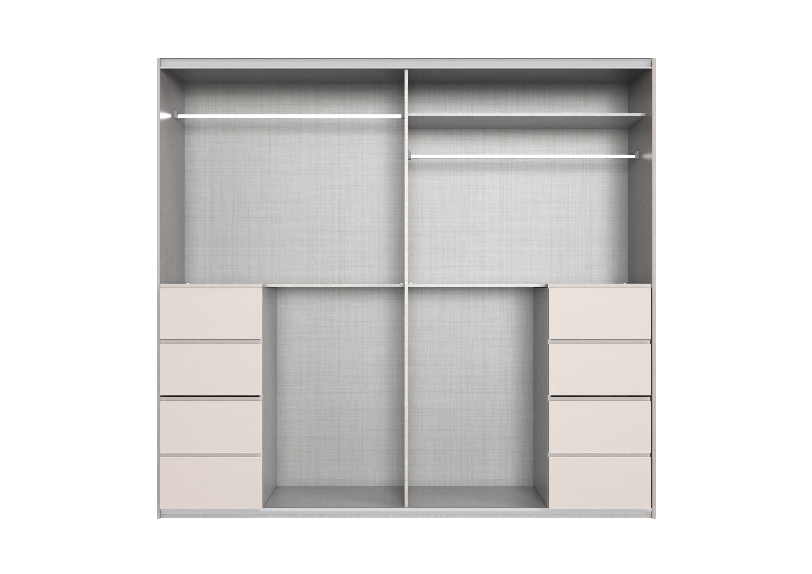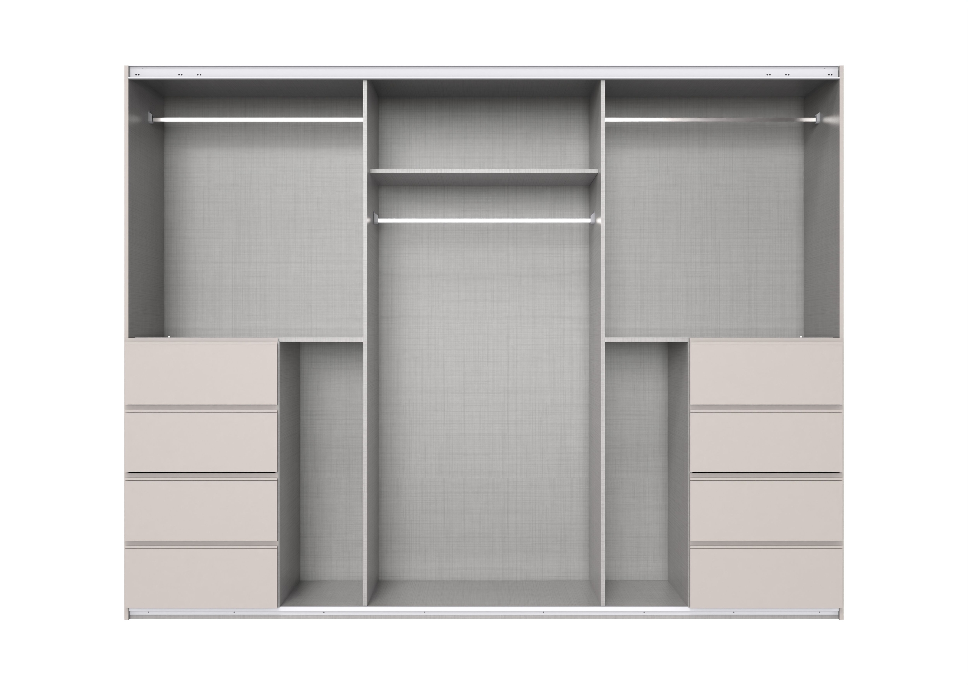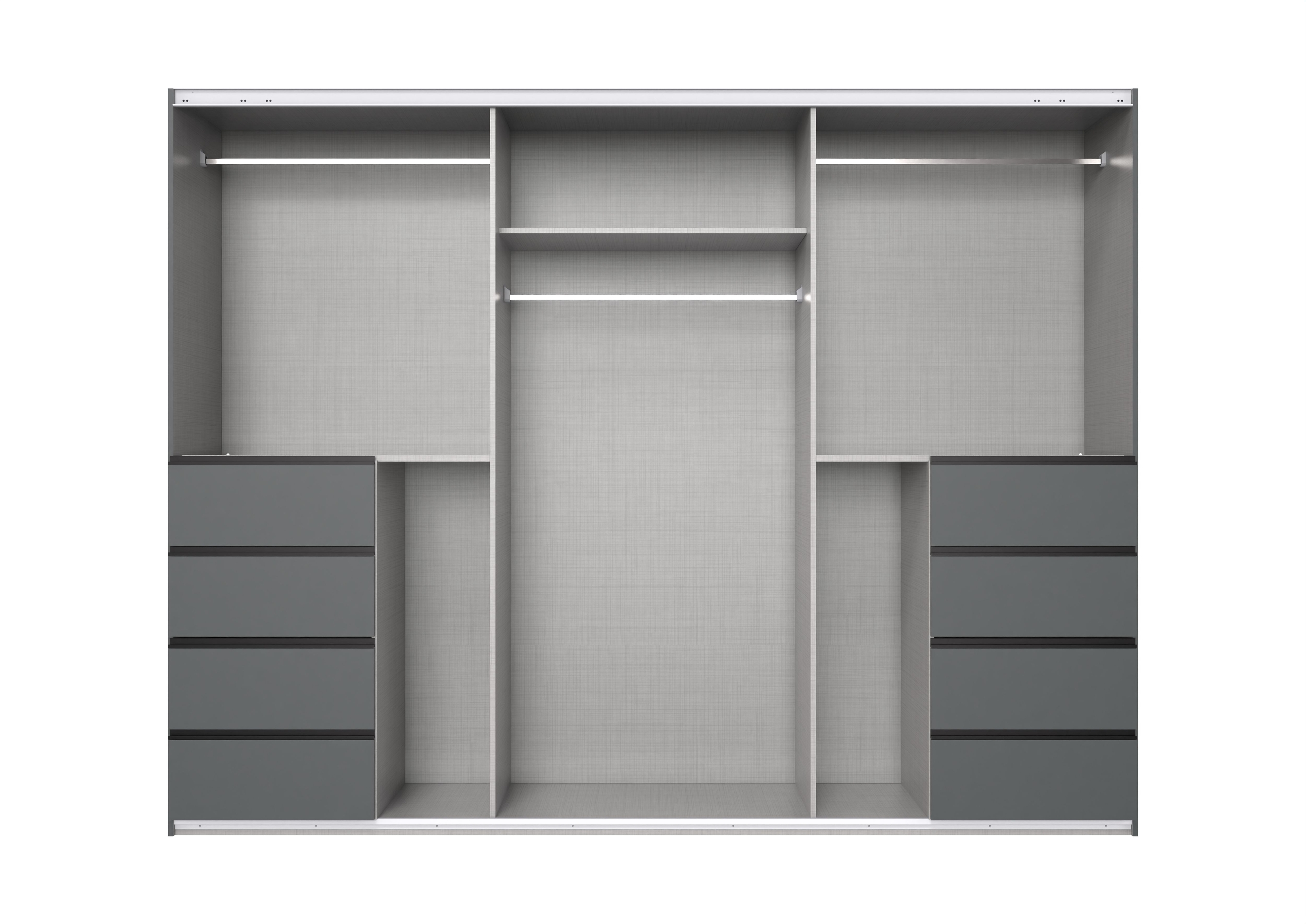 Die drei Schwebetüren lassen sich komfortabel zur Seite schieben und benötigen keinen zusätzlichen Öffnungsraum, was den Schrank auch in größeren Raumkonzepten angenehm nutzbar macht. Im Inneren sorgt eine Kleiderstange mit 87 cm Länge für hängende Kleidung, während ein Einlegeboden und acht integrierte Schubladen eine strukturierte Organisation ermöglichen.
