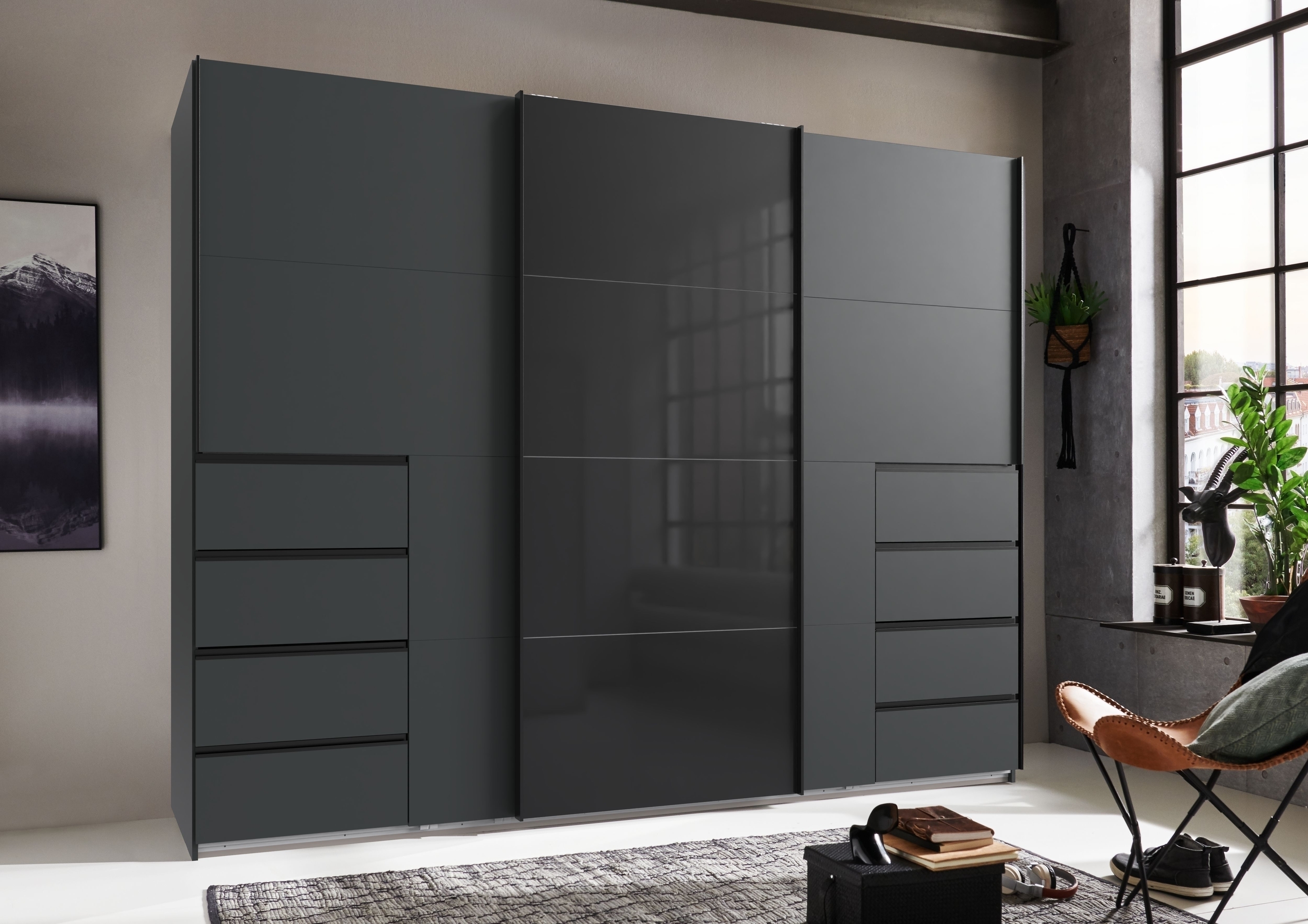 ✔Drei Schwebetüren mit Graphit-Fronten und schwarzen Glaselementen – hochwertige Optik