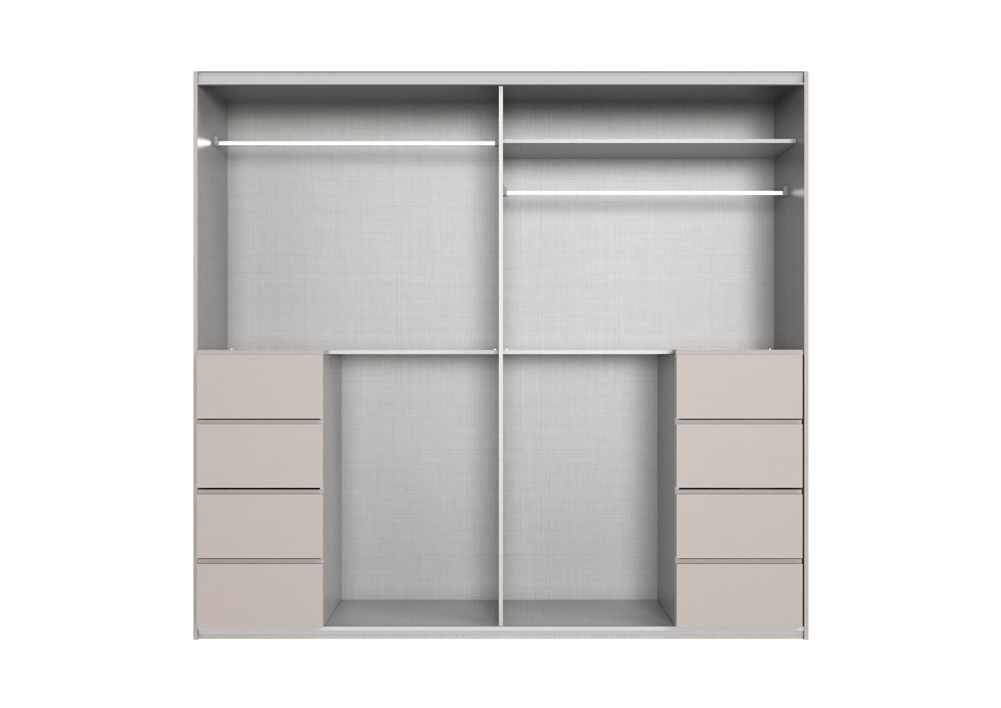 Die durchdachte Innenaufteilung mit zwei Kleiderstangen, einem Einlegeboden und vier Schubladen ermöglicht eine flexible Organisation. So finden Hemden, Jacken, Wäsche oder Accessoires ihren Platz – und das ohne unnötigen Platzverbrauch durch Schwenktüren.