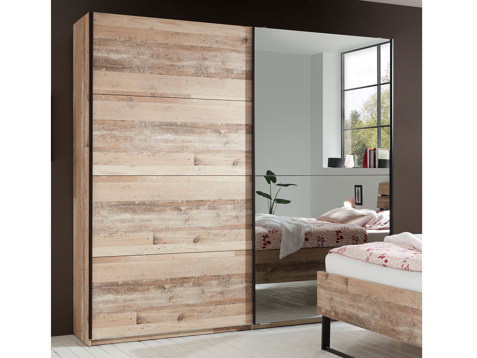 Optisch überzeugt „Renfrew I“ mit seiner Old Style hell Nachbildung, die mit realistisch wirkender Maserung einen authentischen Vintage-Look erzeugt. Die Grauspiegel-Fläche auf einer der Schwebetüren dient nicht nur als bequeme Ganzkörperspiegelung, sondern verleiht kleineren Räumen auch eine optische Großzügigkeit.