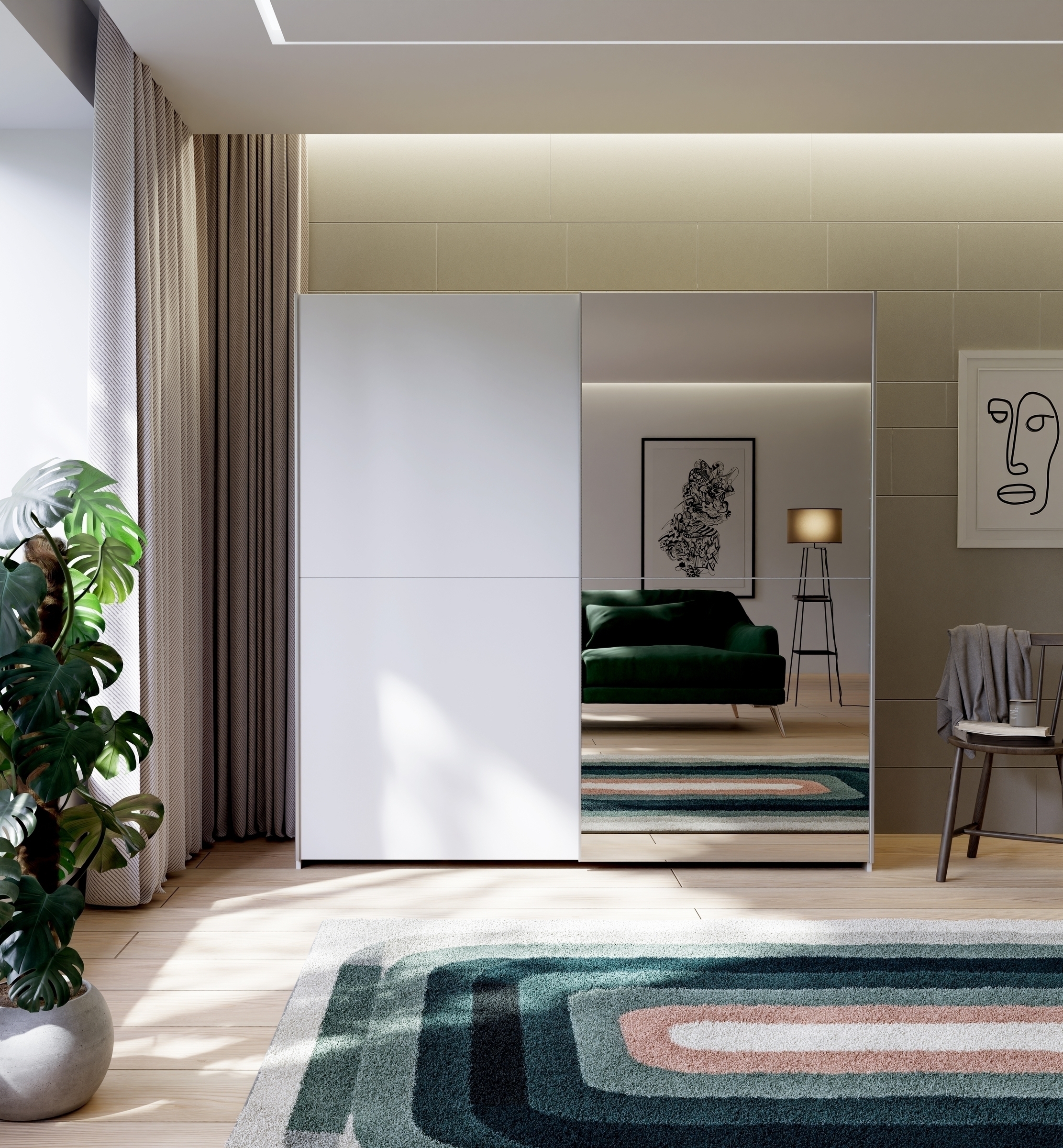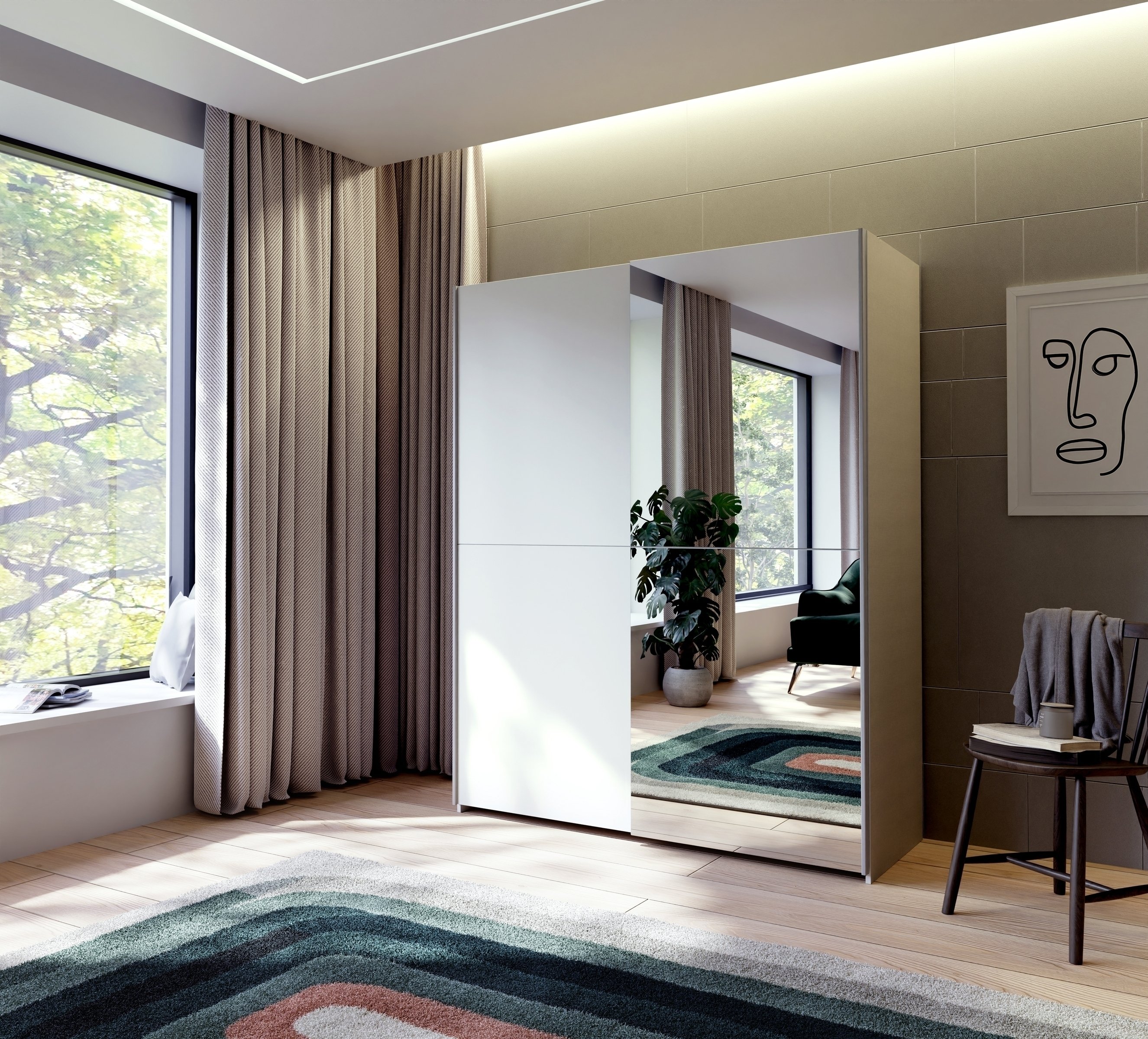 Die zwei Schiebetüren lassen sich platzsparend öffnen und sorgen für einen komfortablen Zugriff, ohne zusätzlichen Schwenkbereich im Raum zu beanspruchen. Eine der Türen ist mit einem praktischen Spiegel ausgestattet, der nicht nur das Ankleiden erleichtert, sondern auch das Schlafzimmer optisch vergrößert und aufhellt. Metallgriffe ergänzen das moderne Erscheinungsbild und liegen angenehm in der Hand.