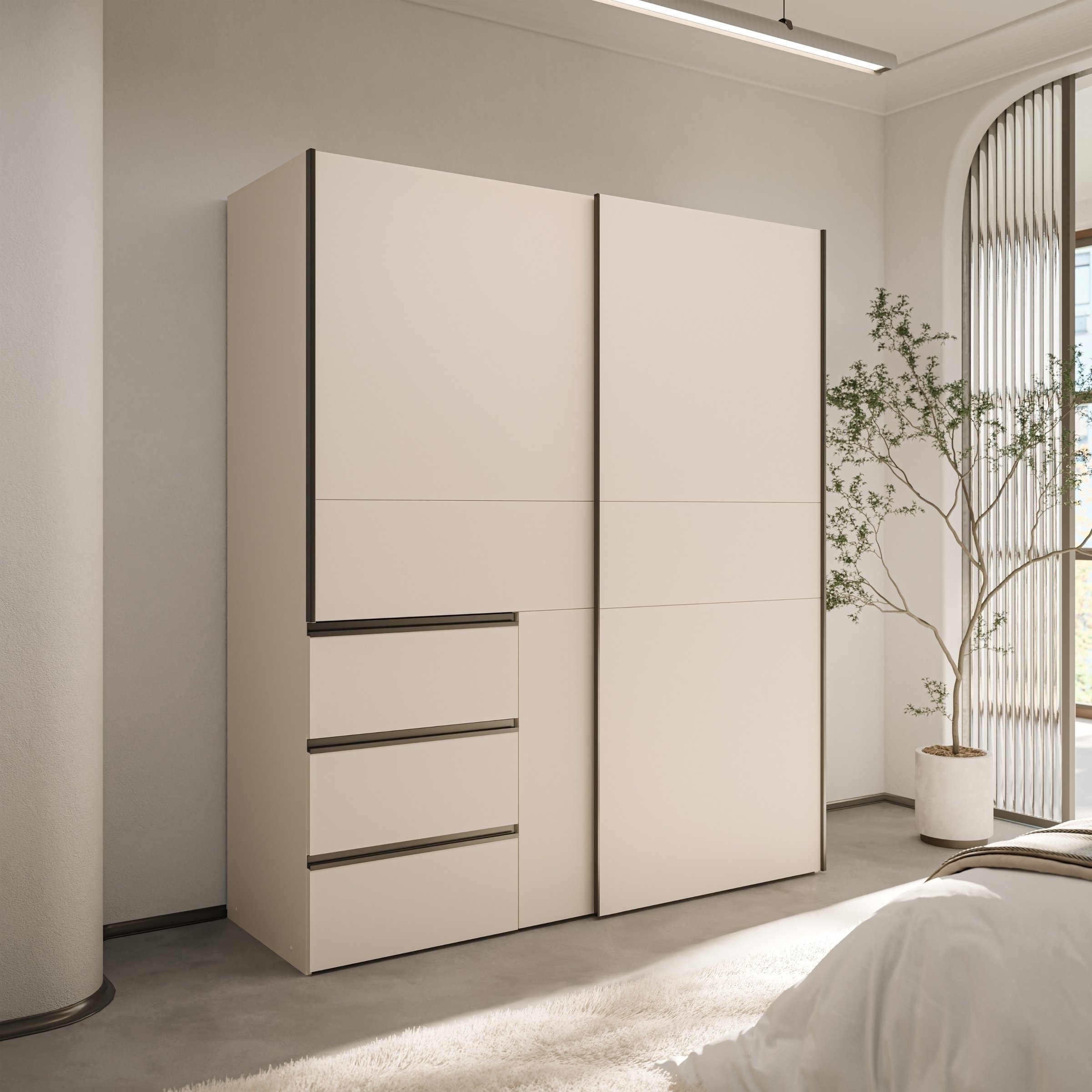 Die moderne Optik und die klare Linienführung machen den WINN 2 zu einem Hingucker in jedem Schlafzimmer. Durch die kompakte Tiefe von 61,2 cm eignet er sich ideal für verschiedenste Raumgrößen, ohne auf Stauraum zu verzichten.