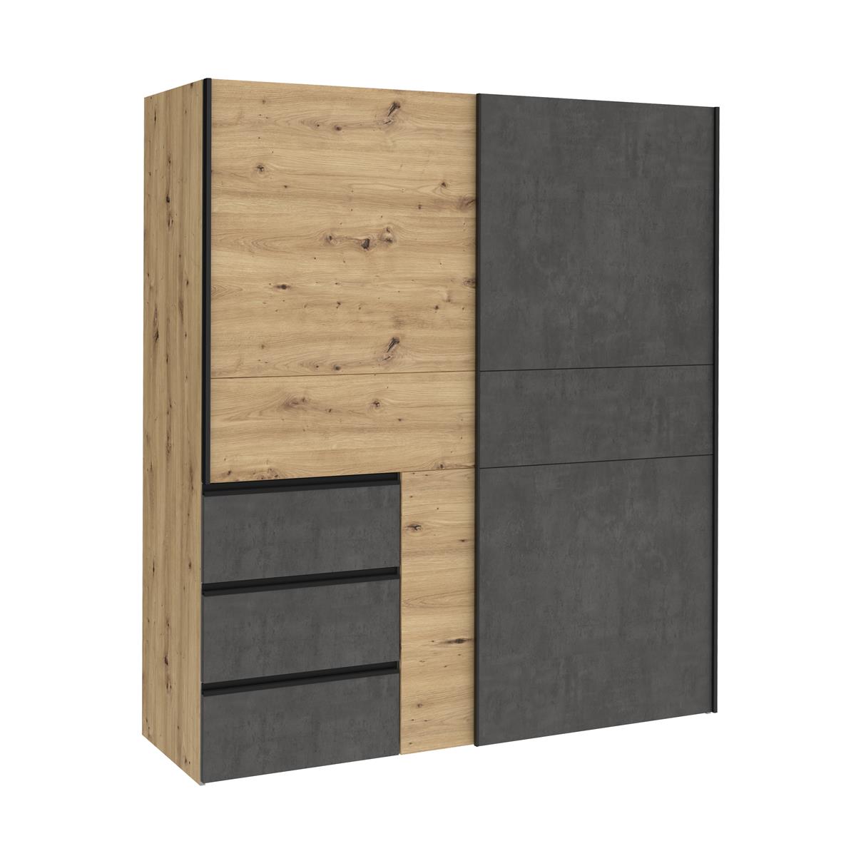 Die Kombination aus Artisan Eiche Nachbildung und Absetzungen in Concrete Optic Dark Gray verleiht dem Schwebetürenschrank einen modernen, wertigen Look, der besonders gut zu aktuellen Einrichtungskonzepten passt. Zwei Schwebetüren, zwei Ablageböden, zwei Kleiderstangen und drei Schubkästen sorgen für eine übersichtliche und gut strukturierte Aufbewahrung im Alltag.