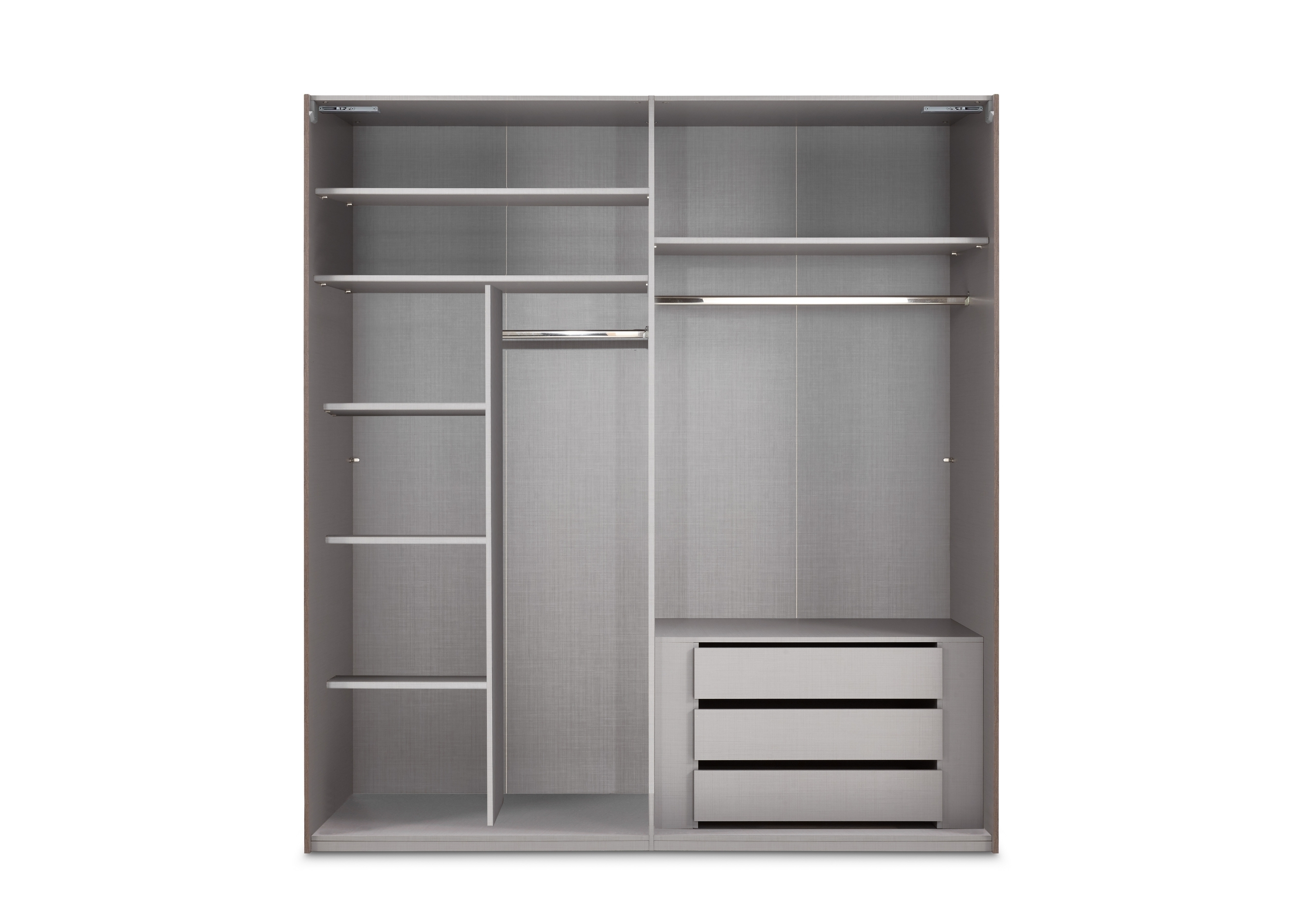 Dank der praktischen Schwebetüren lässt sich der Schrank auch bei begrenztem Raum vor dem Möbel problemlos öffnen. Die Soft-Close-Funktion mit Selbsteinzug sorgt für ein leises und komfortables Schließen der Außentüren, während die durchdachte Innenausstattung mit Wäscheeinteilung, mehreren Einlegeböden und zwei Kleiderstangen für Ordnung und Übersichtlichkeit sorgt.