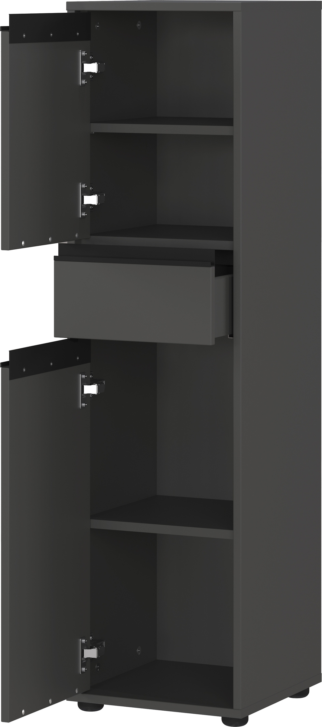 Die verstellbaren Einlegeböden, der belastbare Oberboden und die flexibel rechts oder links anschlagbaren Türen machen den Schrank besonders anpassungsfähig. Schwarze Griffleisten und Möbelgleiter setzen moderne Akzente und unterstreichen das klare, zeitlose Design „Made in Germany“.