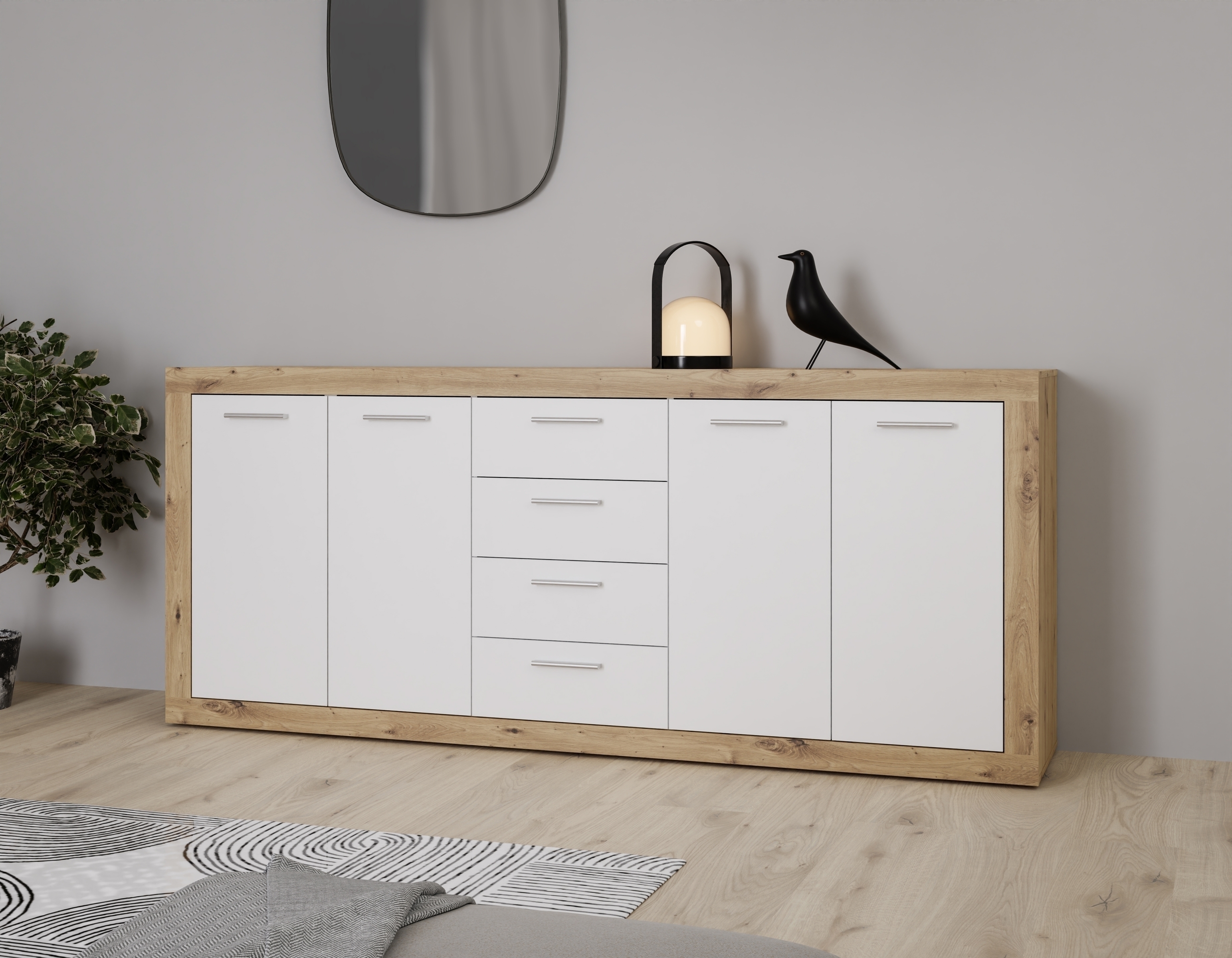 Drei Türen und vier Schubladen bieten vielseitige Verstaumöglichkeiten, während der Oberboden mit einer Belastbarkeit von bis zu 40 kg zusätzlichen Platz für Deko, Pflanzen oder Technik schafft. So nutzen Sie Ihre Stellfläche optimal, ohne auf ein aufgeräumtes Gesamtbild zu verzichten.