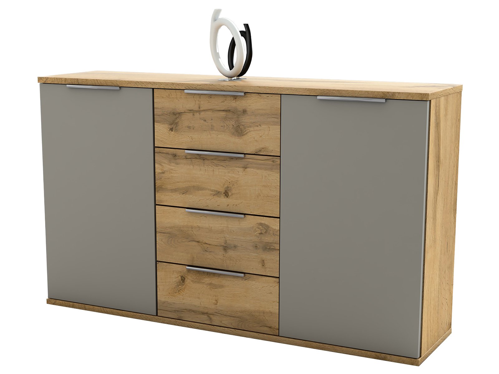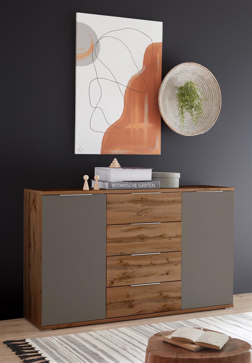 Gefertigt aus robuster Spanplatte und in einer Kombination aus kräftiger Wildeiche-Nachbildung und elegantem Basaltgrau fügt sich das Sideboard harmonisch in moderne Wohnstile ein. Die realistische Holznachbildung sorgt für eine warme Ausstrahlung, während das Basaltgrau einen stilvollen Akzent setzt.