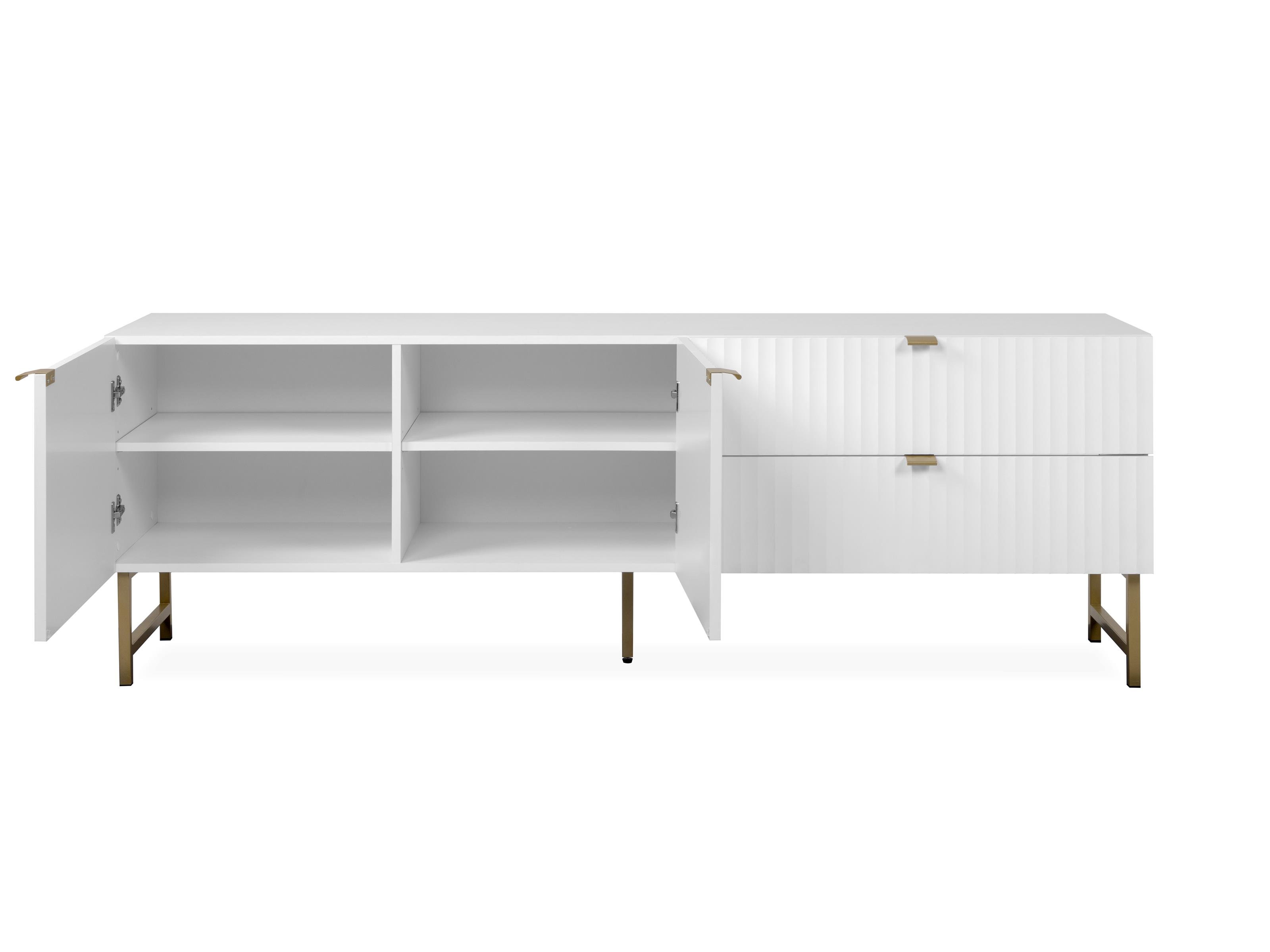 [metaDescription] => Modernes TV-Lowboard in Weiß matt, Korpus aus melaminbeschichteter Spanplatte, Front aus MDF mit 2 Holztüren, 2 Schubkästen und 2 Einlegeböden Breite 179 cm