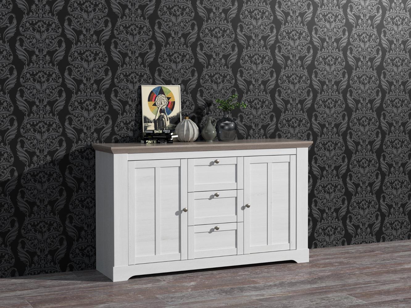 Die Kombination aus Schneeeiche-Nachbildung und einem Oberboden in Nelson Eiche-Nachbildung verleiht dem Sideboard einen freundlichen, zugleich zeitlosen Charakter – ideal, um Wohnzimmer, Esszimmer oder Diele harmonisch einzurichten. Die 3 Drehtüren, 3 Schubkästen und 3 höhenverstellbaren Einlegeböden erleichtern es, verschieden große Dinge übersichtlich unterzubringen.