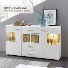 [cKurzBeschreibung] => Modernes Sideboard in Weiß-Matt, Korpus aus Spanpatte, Front aus MDF mit Absetzungen aus Spanplatte in Hirnholz Nachbildung mit 2 Glas-/Holztüren, 3 Schubkästen, 4 Konstruktionsböden und 1 Einlegeboden, inkl. LED-Beleuchtung. Breite 170 cm, Höhe 94 cm, Tiefe 42 cm