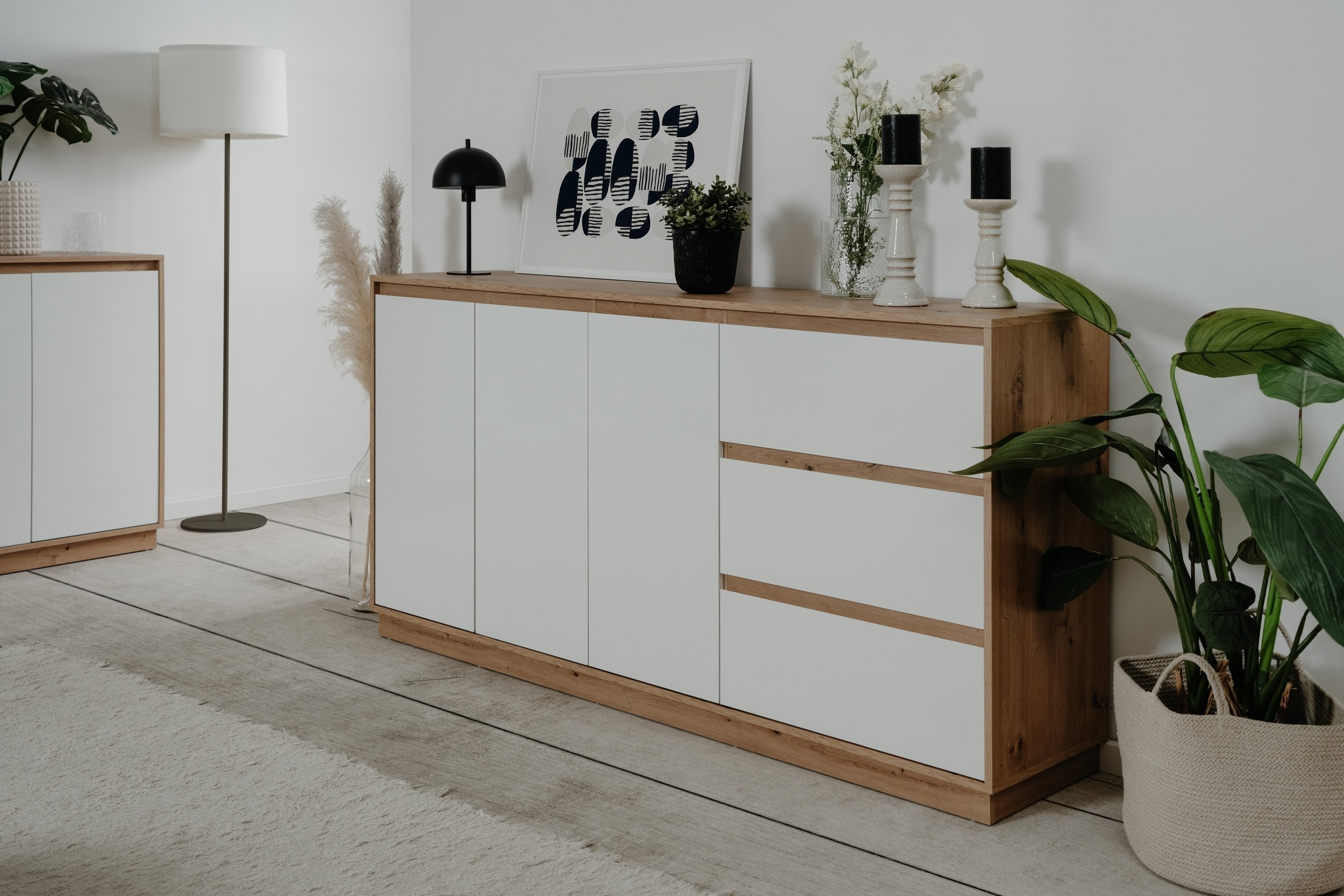 Praktisch im Alltag: Das grifflose Design ermöglicht ein komfortables Öffnen der Türen und Schubladen, ohne dass vorstehende Griffe den Bewegungsraum einschränken. Mit einem Gewicht von rund 42 kg steht das Sideboard stabil an seinem Platz. Geliefert wird es zerlegt, sodass der Transport problemlos möglich ist. Die beiliegende Montageanleitung führt Schritt für Schritt durch den Aufbau, sodass das Möbelstück schnell einsatzbereit ist und sofort für mehr Ordnung im Raum sorgt.