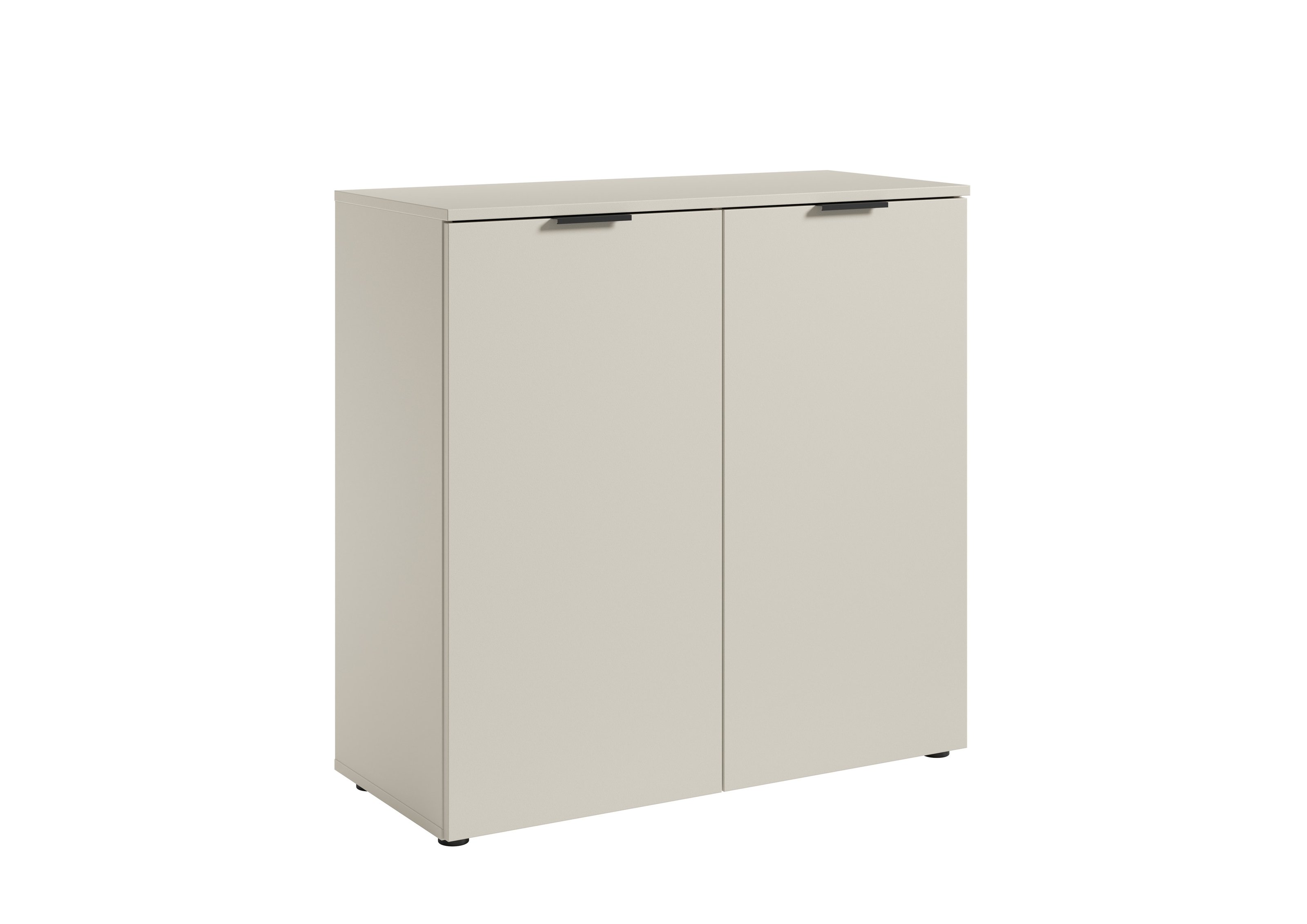 Gefertigt aus robuster Spanplatte mit strapazierfähiger, kaschmirfarbener Melaminbeschichtung ist die Kommode pflegeleicht, kratzfest und wird durch schwarze Lip-Griffe und runde Möbelgleiter aus Kunststoff optisch wie praktisch abgerundet.