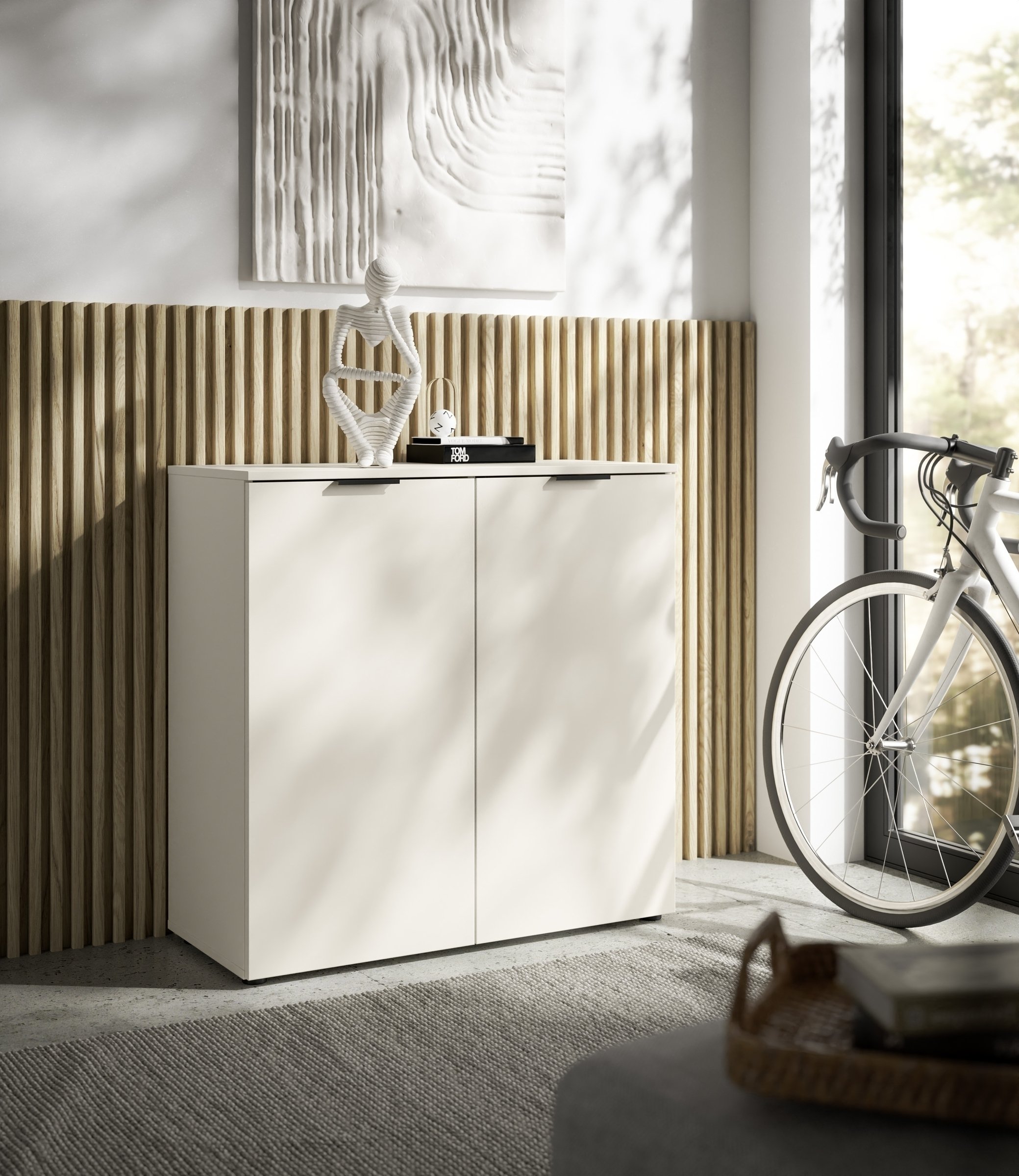 Die kaschmirfarbene Melaminbeschichtung macht die Kommode robust, kratzfest und leicht zu reinigen.