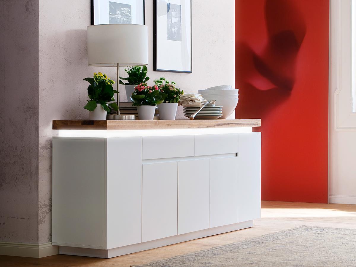 Die Kombination aus matt-weißem MDF-Korpus und der massiven Deckplatte aus geölter Asteiche verleiht dem Sideboard eine natürliche, warme Optik. Die 6 cm starke Deckplatte ist nicht nur ein optisches Highlight, sondern auch besonders stabil und langlebig. Jedes Möbelstück ist ein Unikat, denn Massivholz zeigt individuelle Maserungen, Äste und Farbnuancen – ein Zeichen für Echtheit und Natürlichkeit.