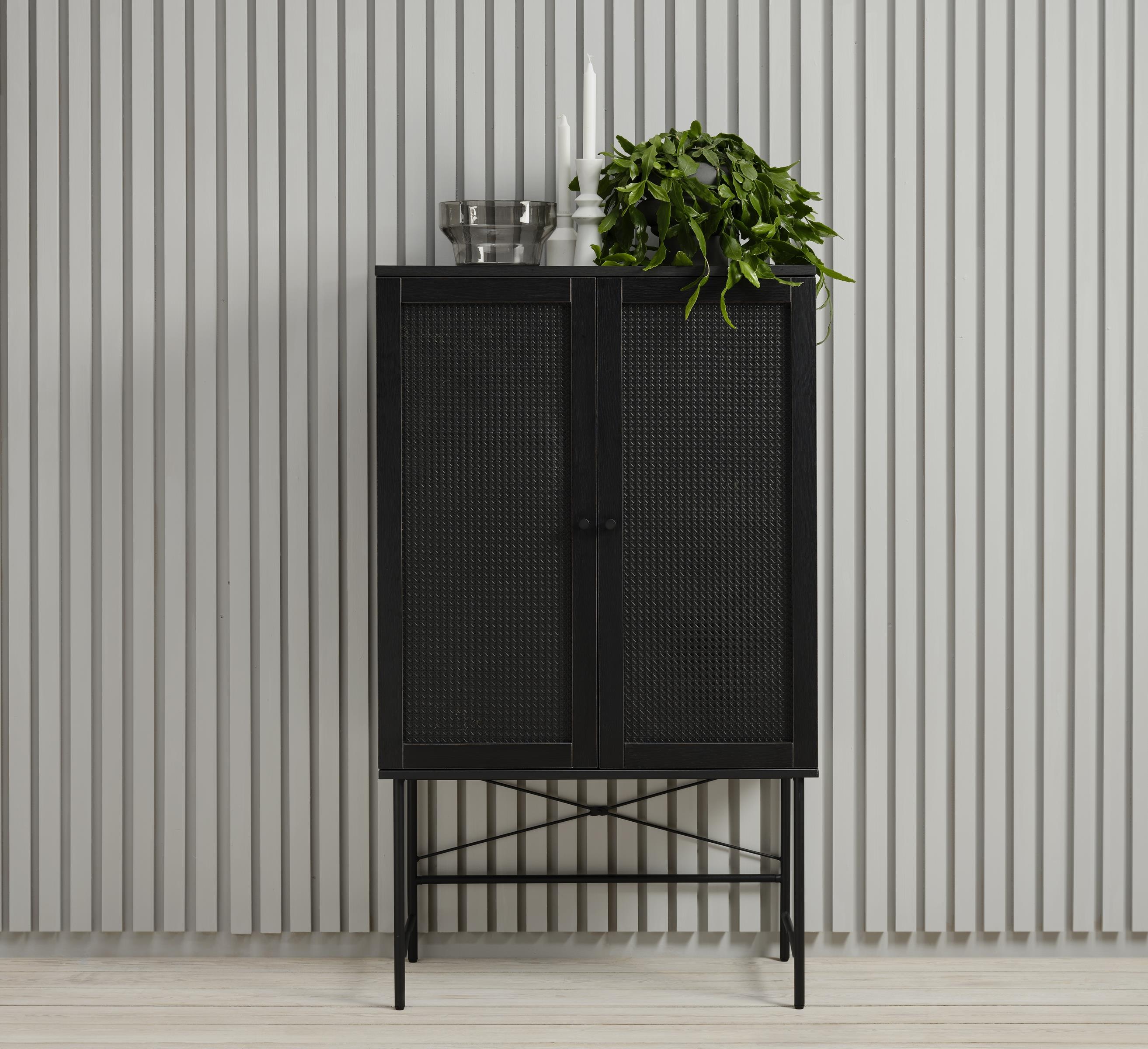 [cWert] => TV Lowboard in Schwarzer Eiche Nachbildung mit Türfüllung im "Wiener Geflecht" aus schwarzem Poly Rattan und schwarzen Metall Griffen. Breite 120 cm , Höhe 43 cm, Tiefe 40 cm. Moderne trifft auf Romantik im außergewöhnlichen Stil kombiniert.