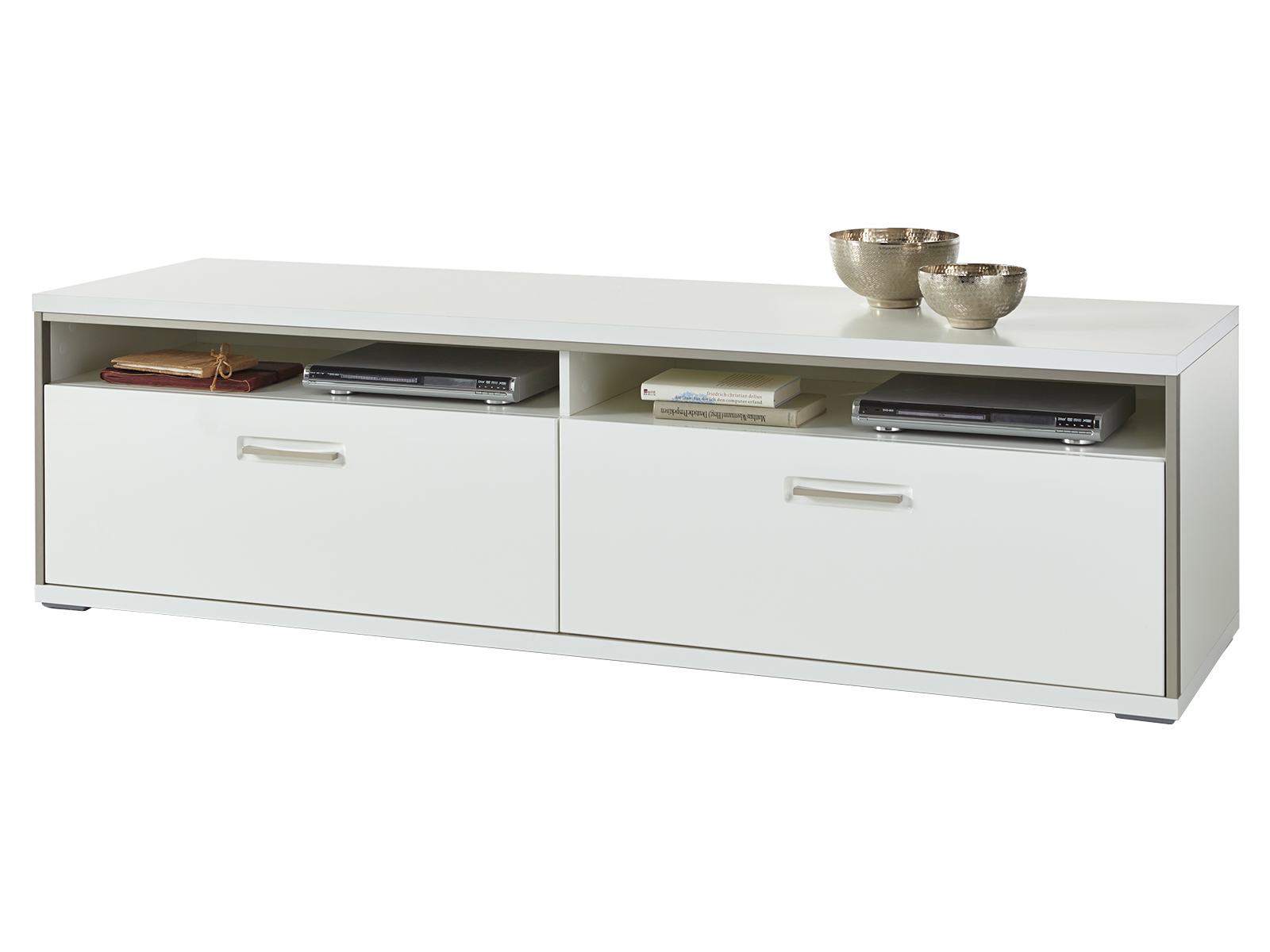 [metaDescription] => Modernes TV-Lowboard, Korpus aus Spanplatte in Weiß matt, Front aus MDF in Weiß-Hochglanz tiefzieh Nachbildung, Korpusabsetzung aus Metall in Edelstahlfarbe
