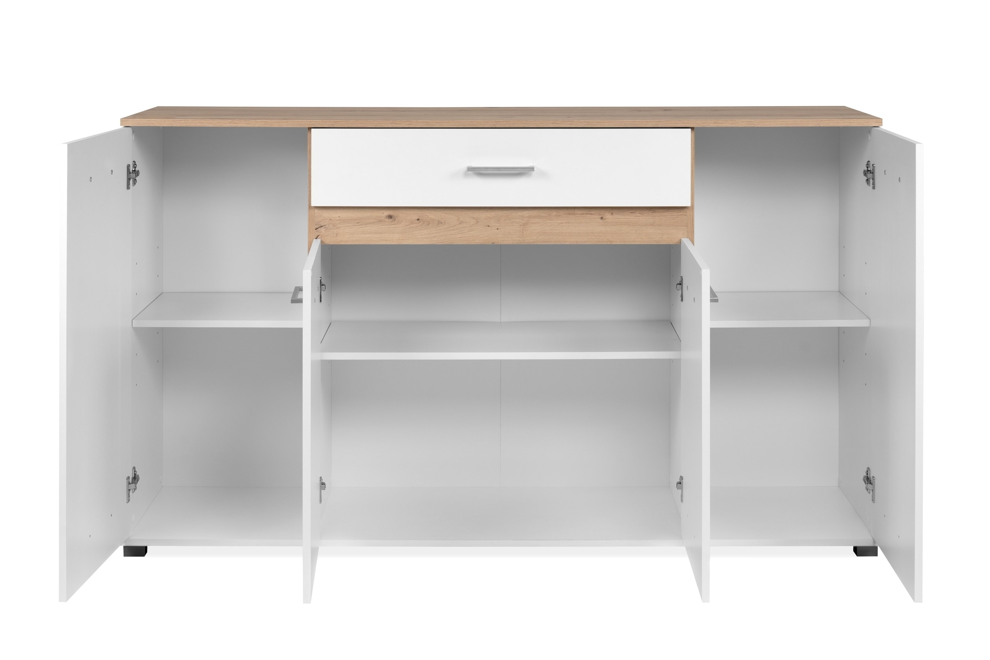 Die Aufteilung mit einer Schublade und vier Türen ermöglicht eine flexible Nutzung. Dahinter verbergen sich drei Einlegeböden, die jeweils bis zu 3 kg belasten können. So finden Geschirr, Textilien, Bücher oder Alltagsgegenstände ihren Platz – geordnet und griffbereit. Die maximale Gesamtbelastbarkeit von 20 kg macht das Sideboard besonders robust und alltagstauglich.