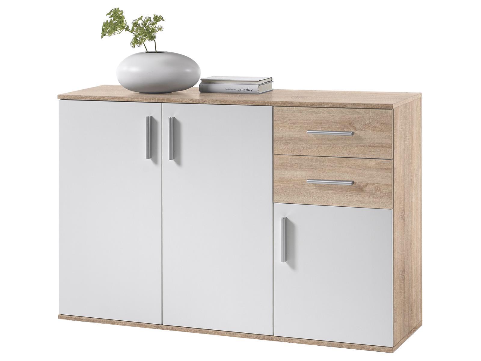 [metaDescription] => Moderne Kommode aus Spanplatte, in Sonoma hell / Weiß, mit 3 Türen, 2 Schubkästen, 1 Einlegeboden Breite 120 cm, Höhe 82 cm, Tiefe 35 cm Jetzt versandkosten