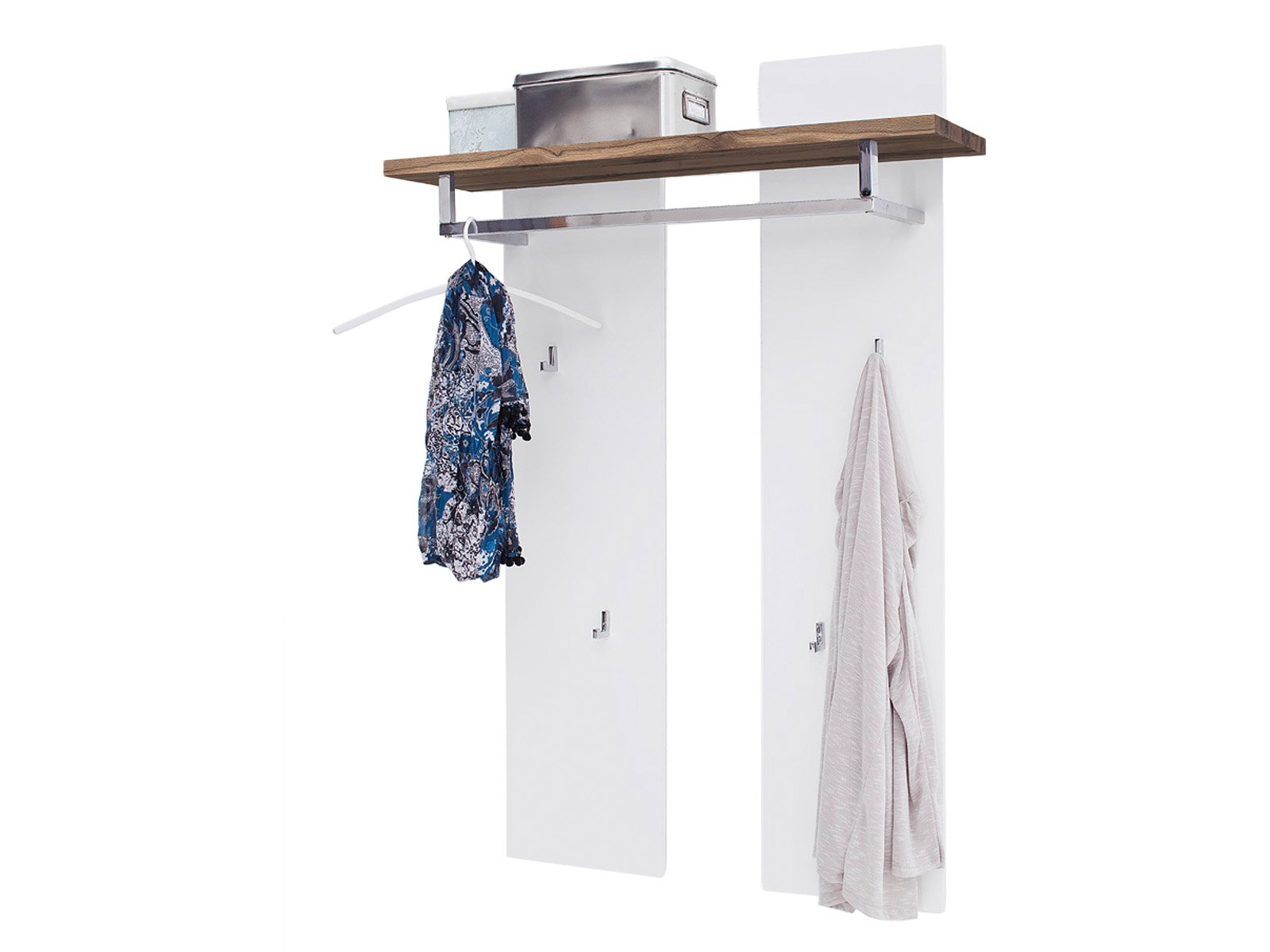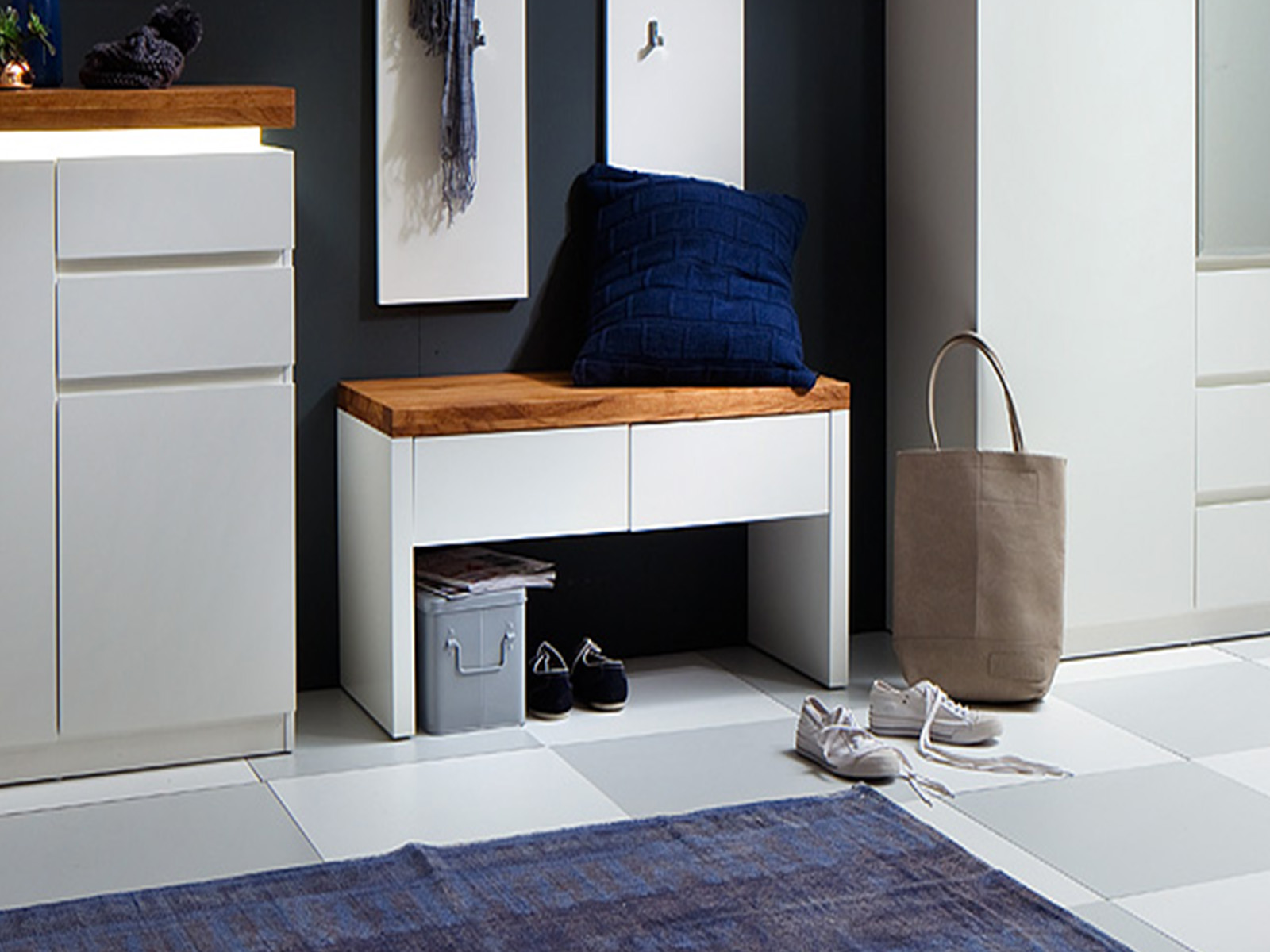 [metaDescription] => Moderne Garderobenbank aus MDF-Platte in Matt-weiß lackiert und Oberboden aus Massivholz in Asteiche geölt mit 2 Schubkästen Breite 91 cm, Höhe 48 cm, Tiefe