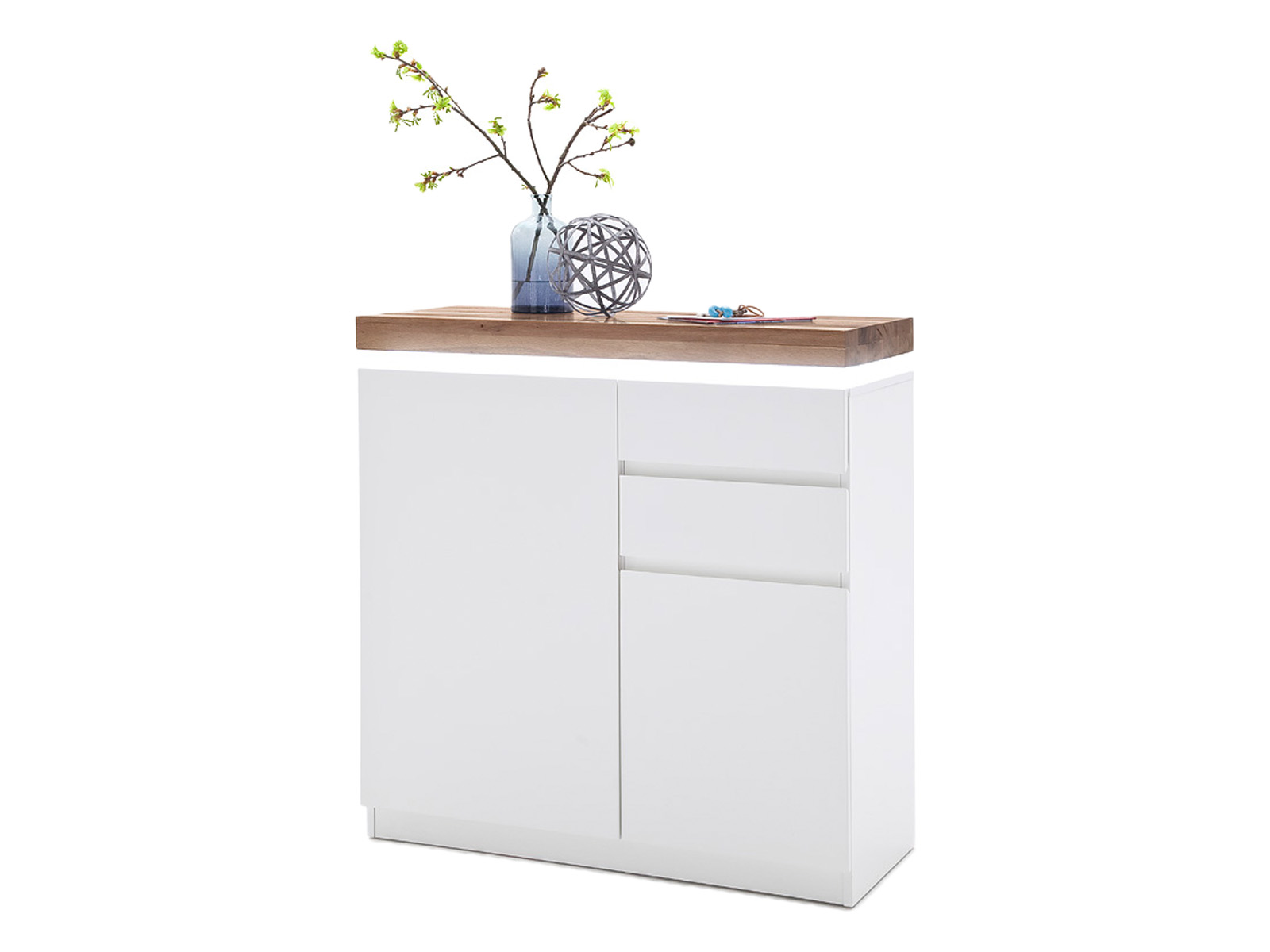 Kombination aus matt-weißer MDF-Platte und geöltem Massivholz-Oberboden für Langlebigkeit und natürliche Optik.