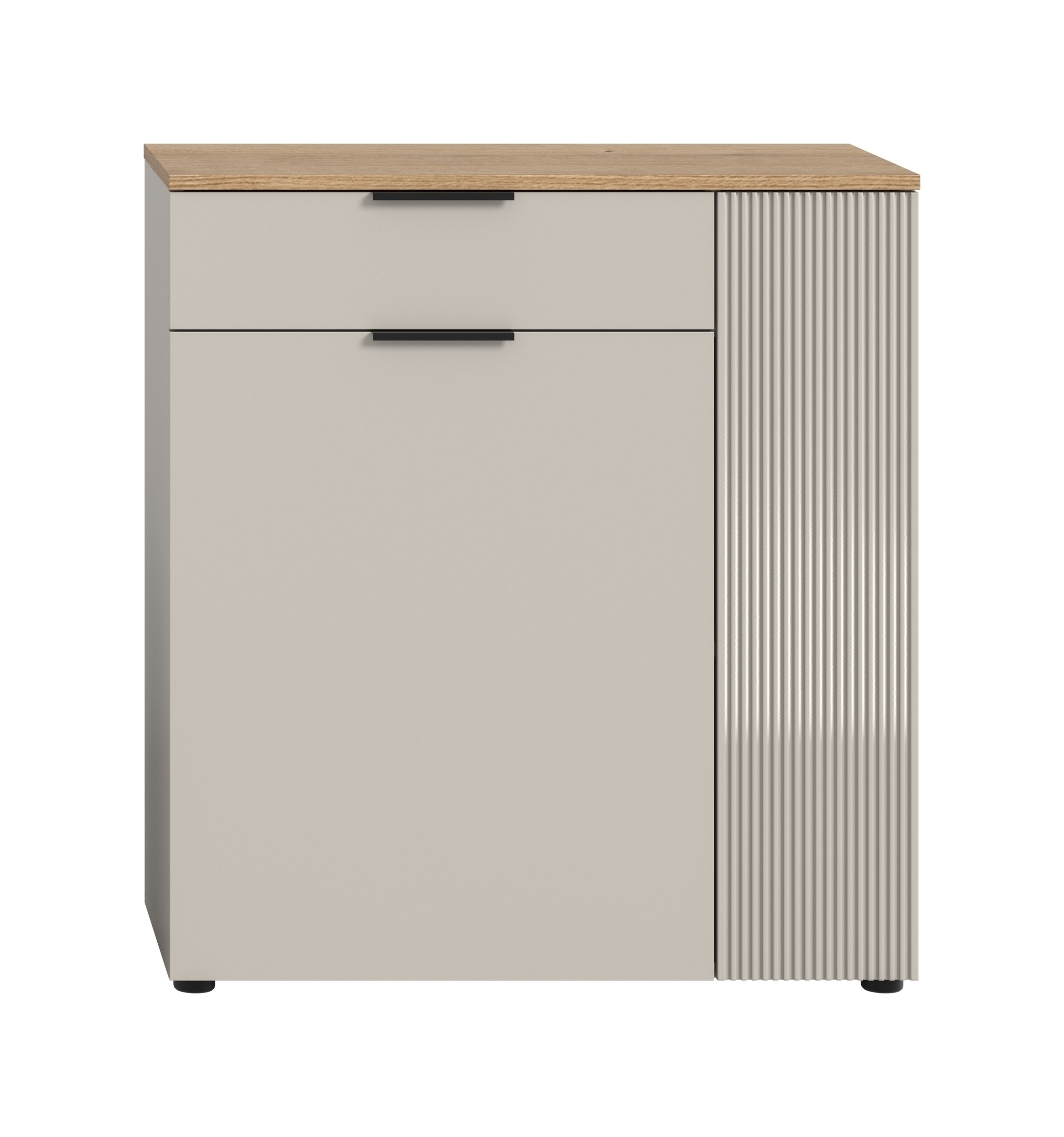 Gefertigt aus FSC®-zertifiziertem Holzwerkstoff leistet die Sitzbank einen Beitrag zum verantwortungsvollen Umgang mit Holzressourcen. Die Beschläge aus Metall und die schwarzen Füße unterstreichen den modernen Stil und sorgen für eine solide Basis. Griffe in Kantengriff-Ausführung aus Kunststoff fügen sich dezent in das Gesamtbild ein.