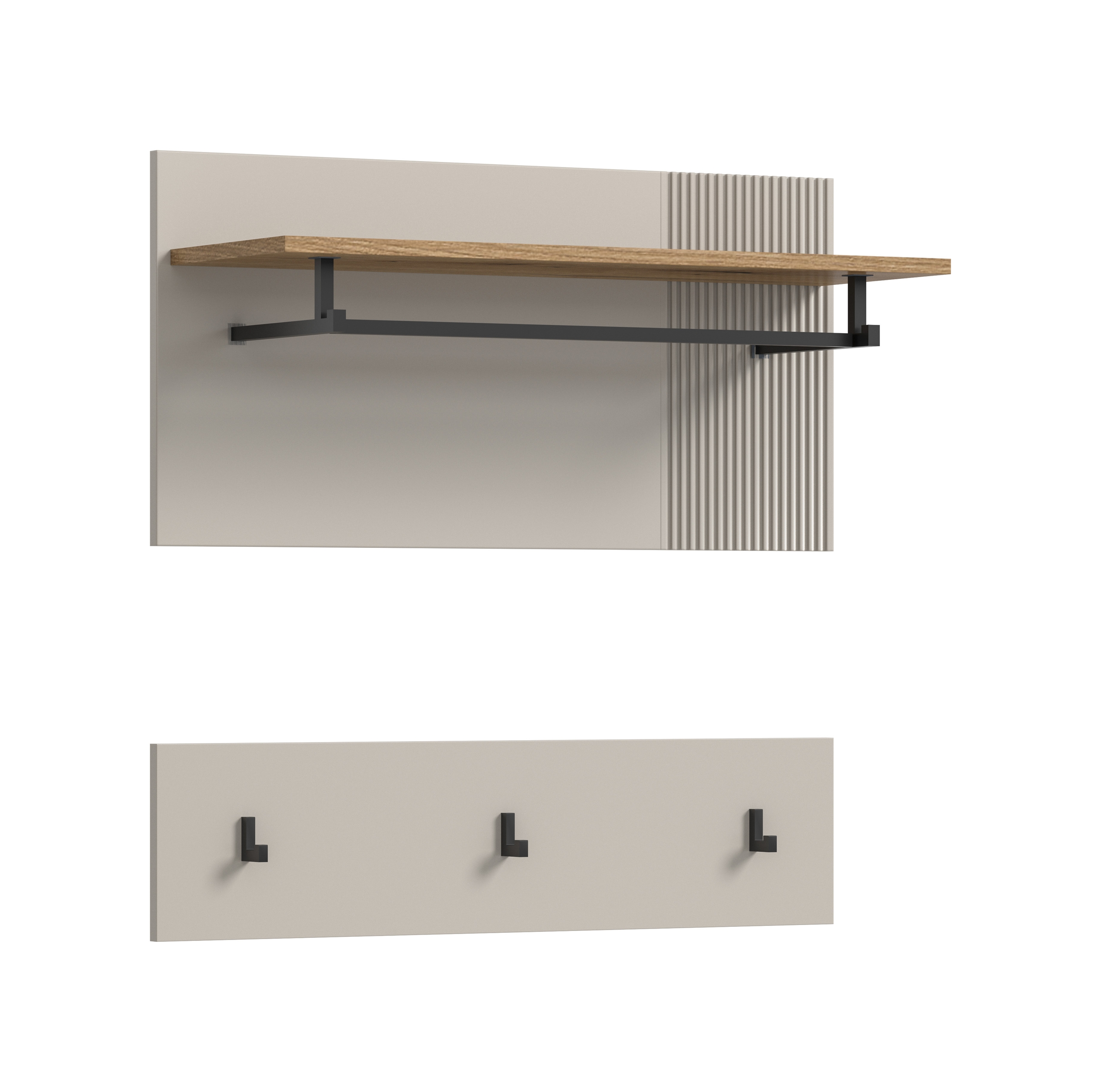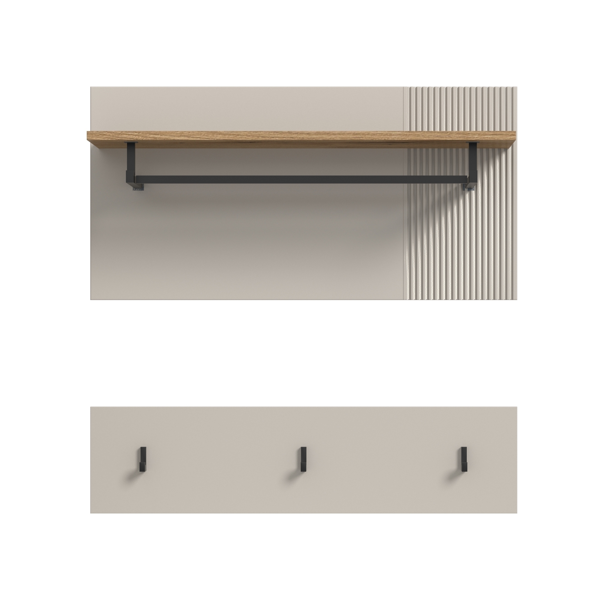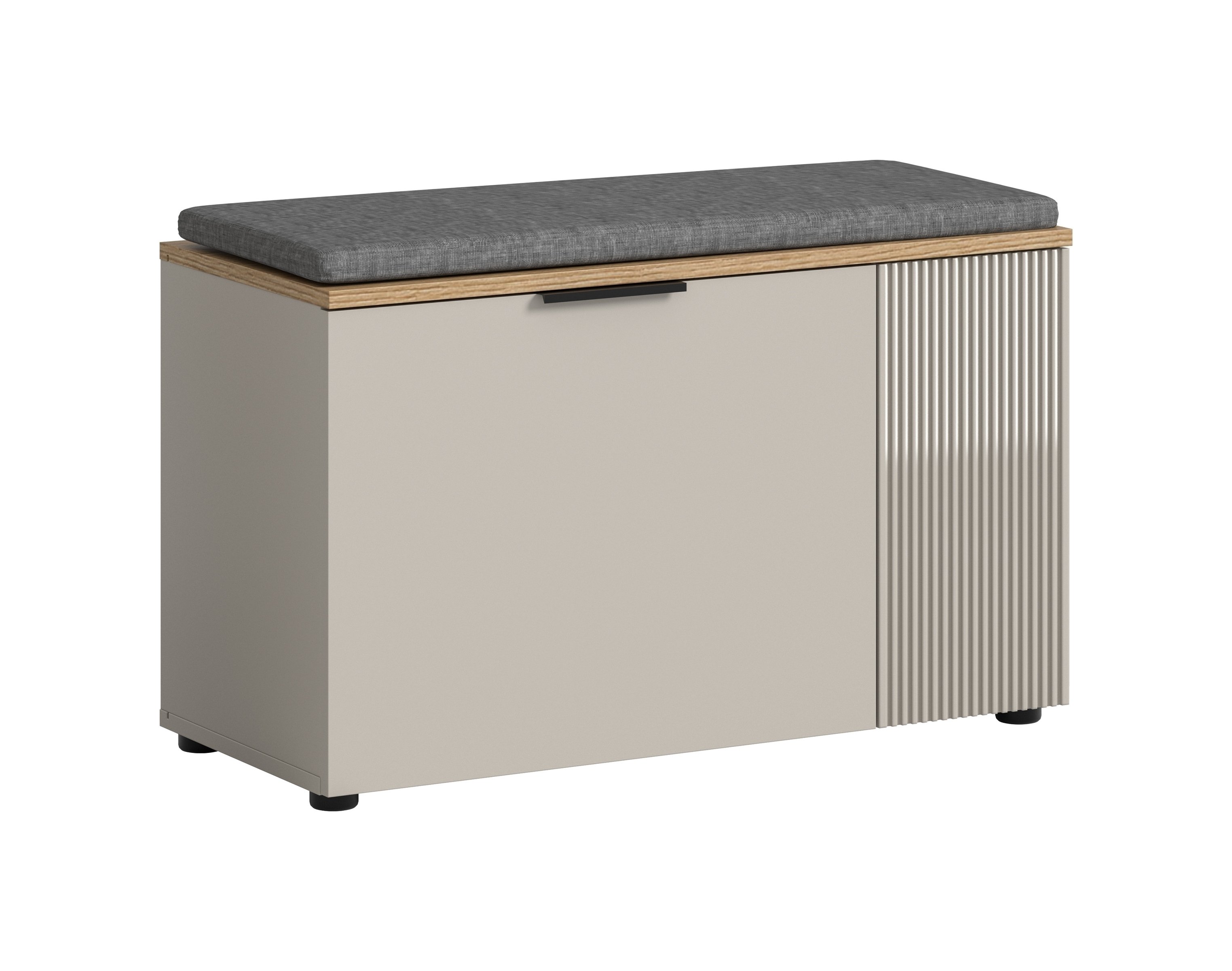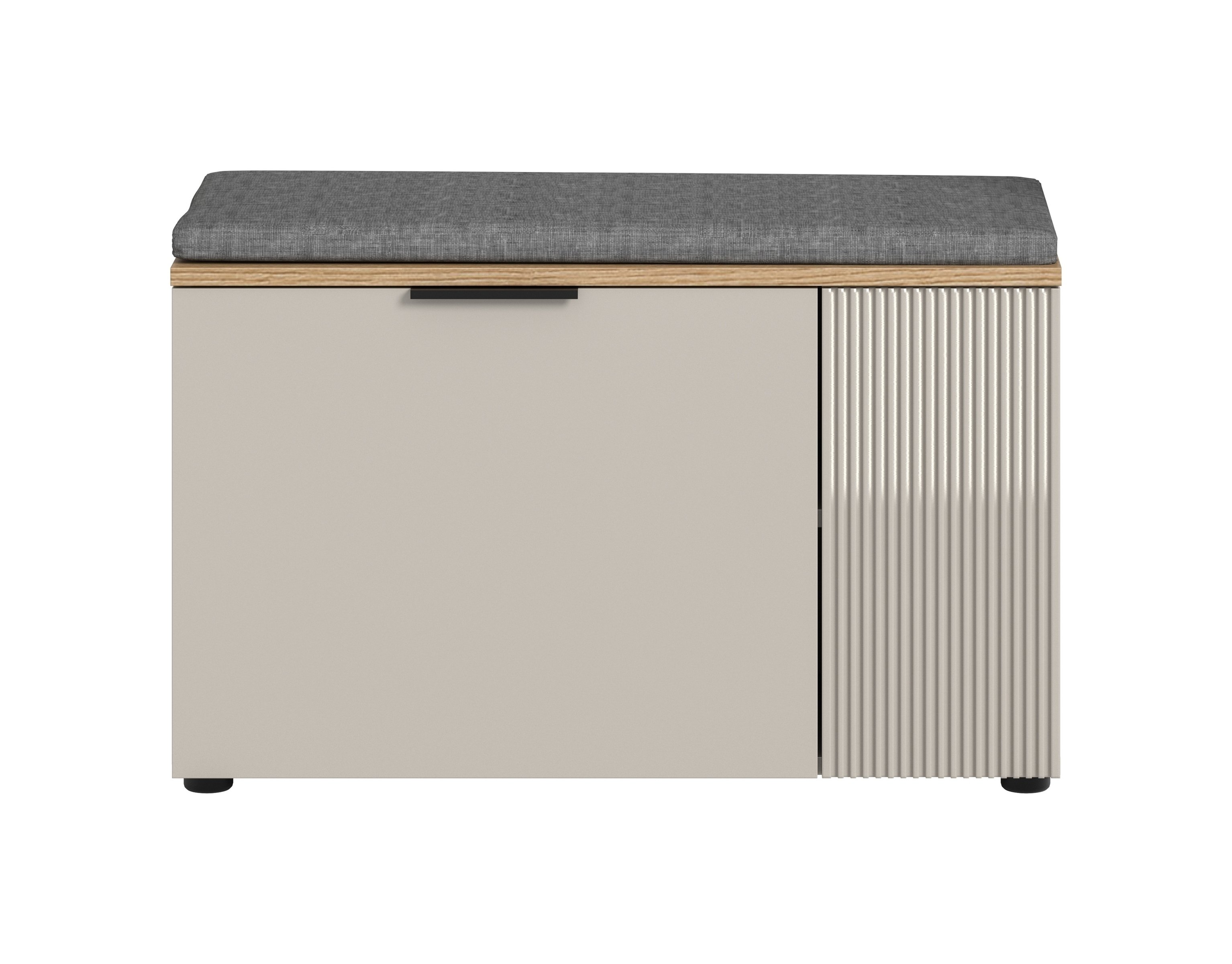 Optisch überzeugt die Sitzbank mit ihrer modernen Längstfräsung in der Front und der harmonischen Kombination aus Evoke Oak und Innenflächen in Kaschmir-Nachbildung. Das graue, abnehmbare Sitzkissen ergänzt das Design und sorgt gleichzeitig für angenehmen Sitzkomfort. Die melaminbeschichteten Oberflächen sind robust und pflegeleicht, wodurch sich die Bank besonders gut für stark frequentierte Bereiche wie den Eingangsbereich eignet.