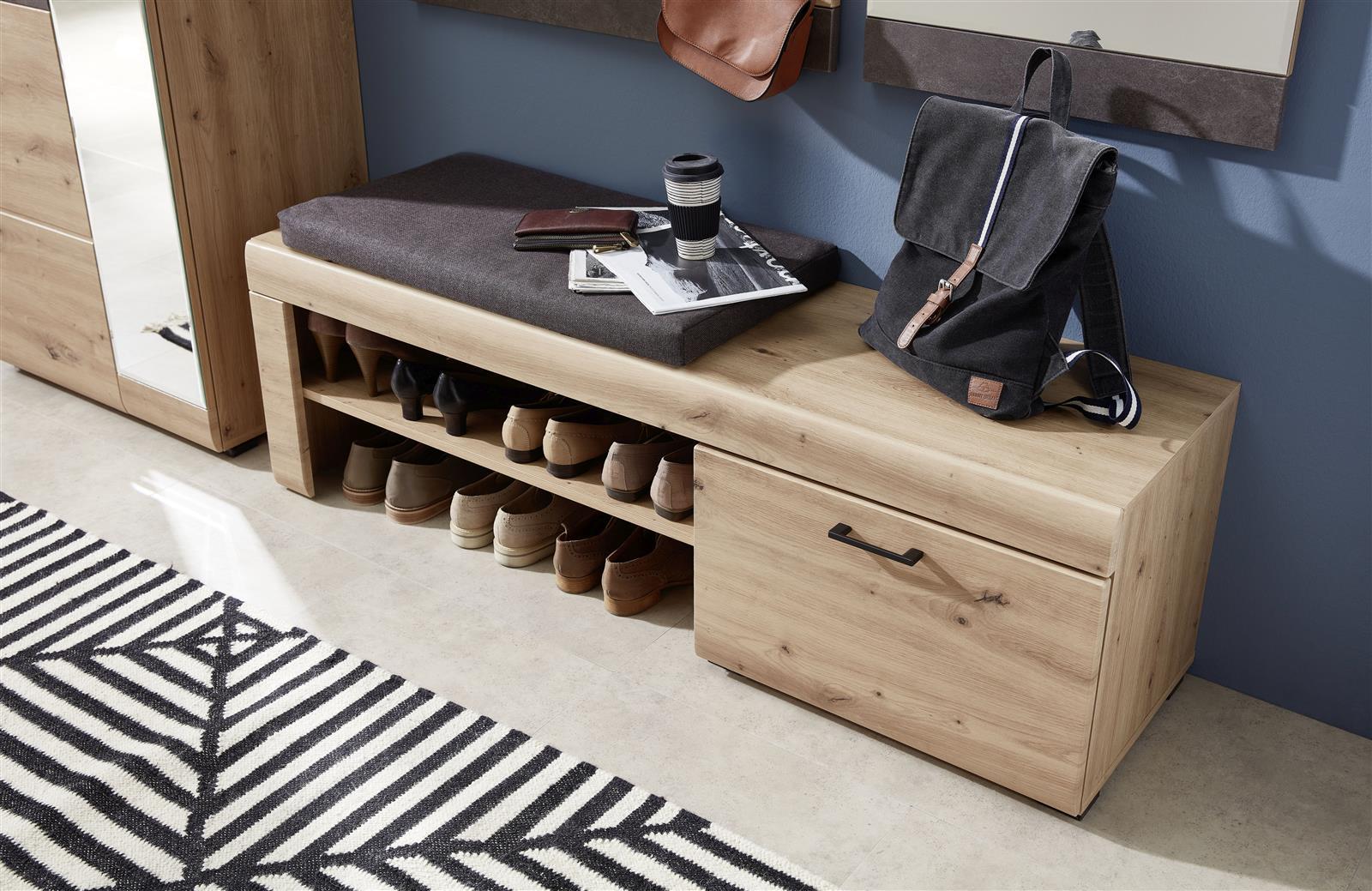 Besonders praktisch: Hinter der modernen Front mit Softclose-Funktion verbirgt sich ein Schubkasten und ein Konstruktionsboden, auf denen du von Schuhen bis hin zu Mützen, Handschuhen und Schals alles übersichtlich verstauen kannst. Das mitgelieferte graubraun melierte Sitzkissen macht das Hinsetzen angenehm komfortabel, wenn du nur kurz Platz nehmen möchtest.