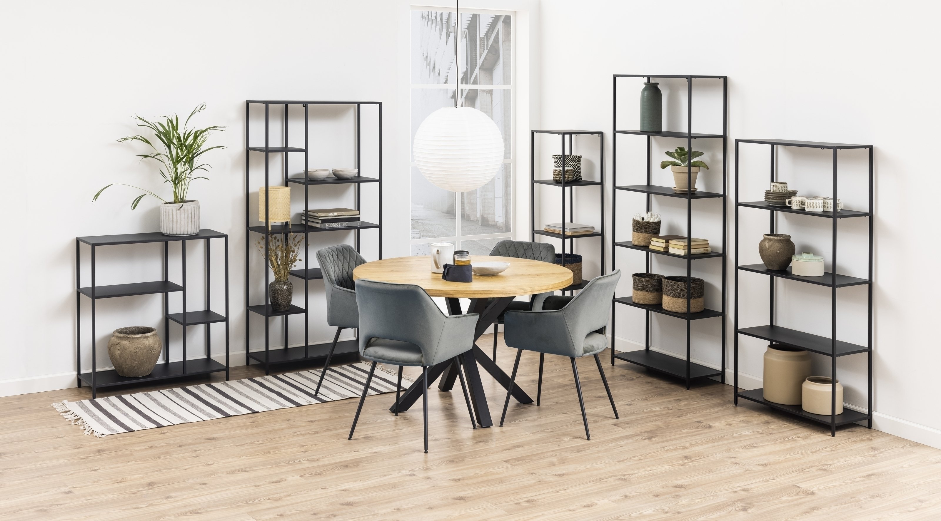 Durch das asymmetrische Design und die matt schwarze, rau pulverbeschichtete Oberfläche erhält das Regal einen zeitgemäßen Look, der verschiedene Einrichtungsstile stilvoll ergänzt. Die unterschiedlichen Größen der Ablageböden setzen Ihre Lieblingsstücke gezielt in Szene und sorgen gleichzeitig für praktische Ordnung im Alltag.