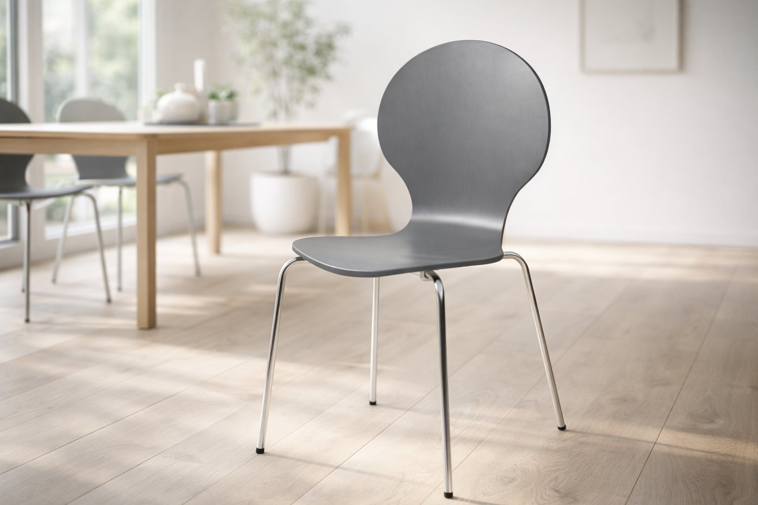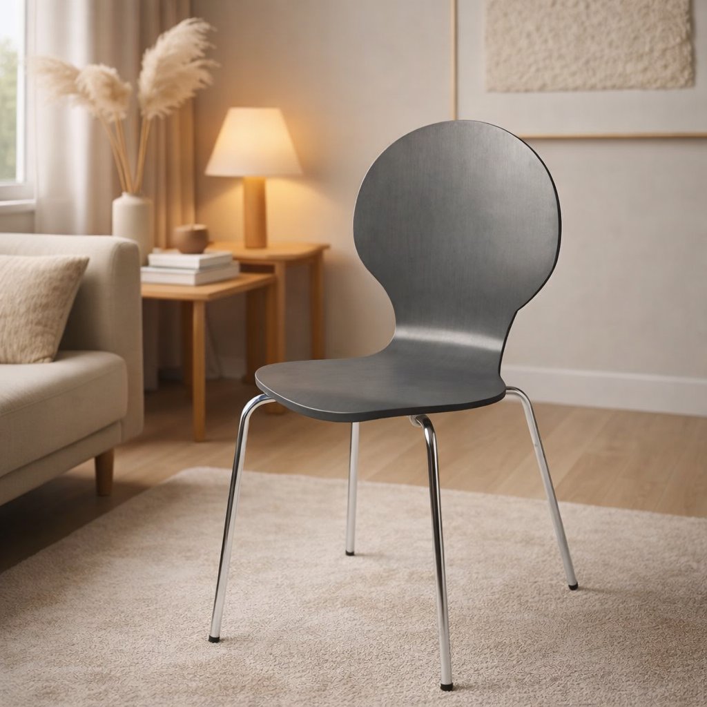Die formgepresste Sitz- und Rückenfläche aus MDF wird im Schichtholzverfahren hergestellt und bietet durch ihre leichte Flexibilität einen hohen Sitzkomfort. Das Gestell aus verchromtem Stahlrohr sorgt nicht nur für eine ansprechende Optik, sondern auch für Stabilität bis 120 kg. Die vier Fußstopfen schützen Ihren Boden vor Kratzern und geben dem Stuhl einen sicheren Stand.