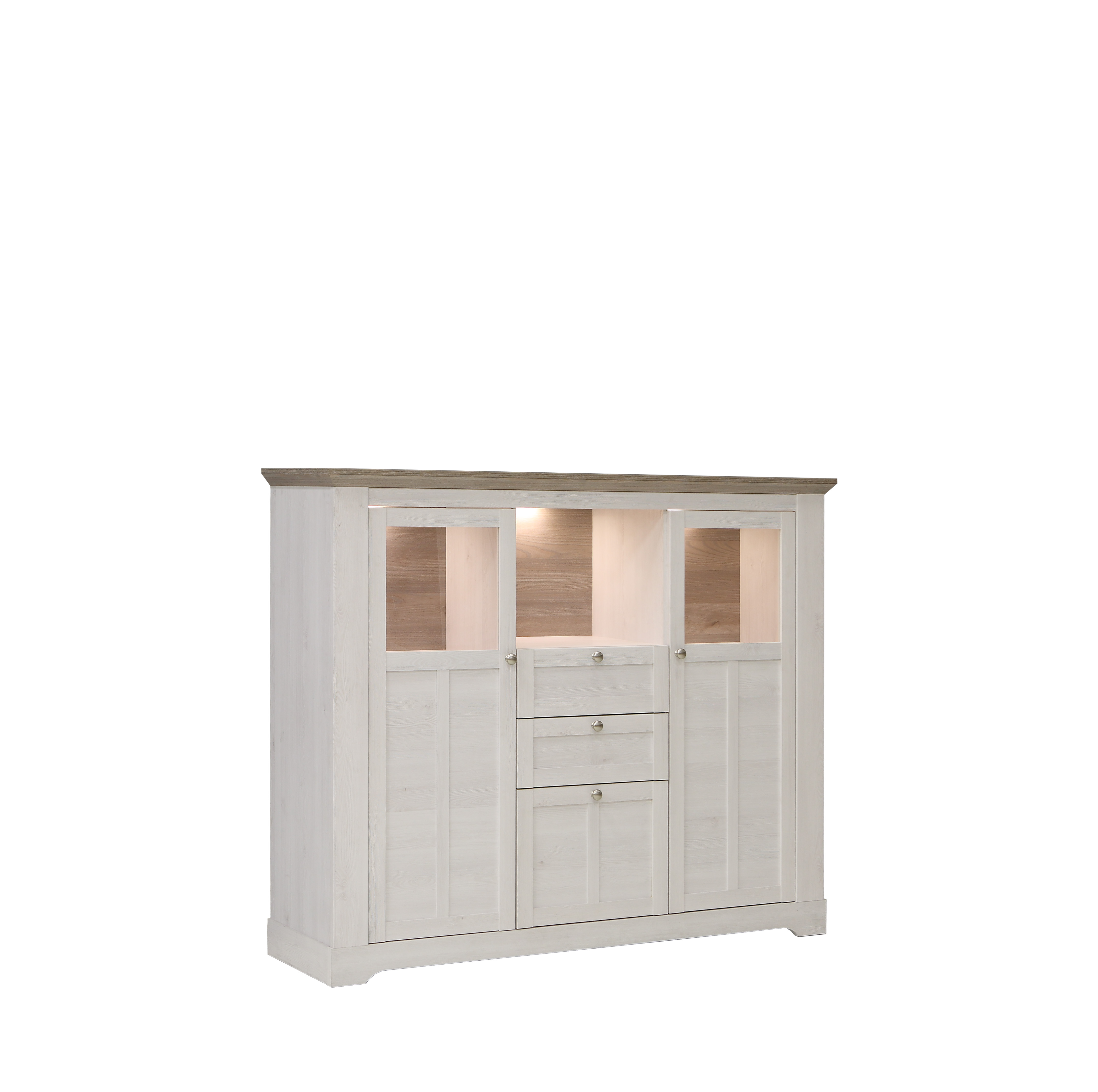 [metaDescription] => Modernes Highboard inkl Beleuchtung aus Spanplatte in Schneeeiche Nachbildung, Oberboden in Nelson Eiche Nachbildung mit 2 Glas-/Holztüren, 1 Holztür, 2 Sch