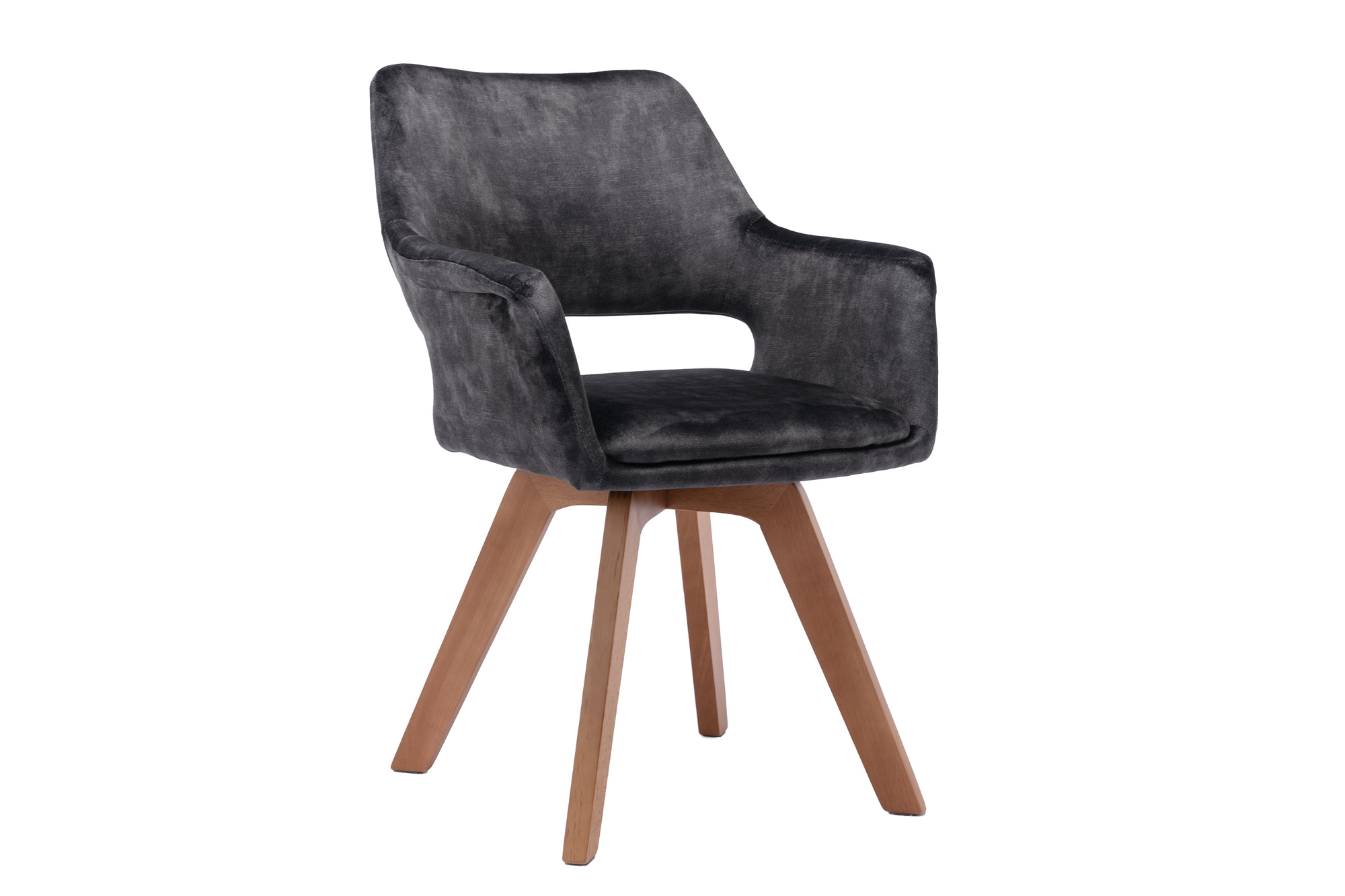 Vintage-Samt in Grau, 4-Fuß-Untergestell aus Massivholz, 360° drehbare Sitzschale, Ausschnitt im Rücken |