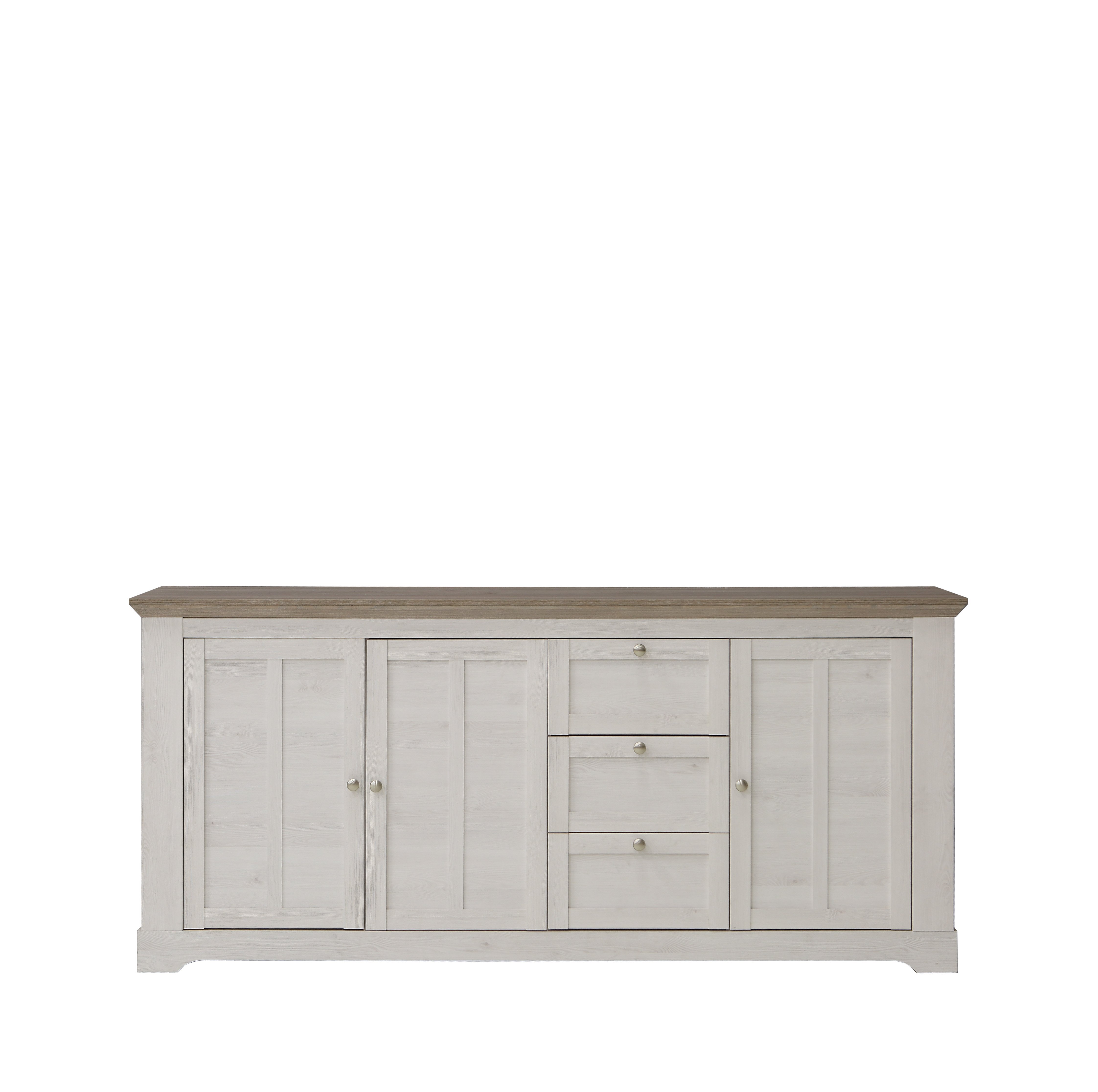 Die Fronten und der Korpus aus Spanplatte in Schneeeiche Nachbildung verleihen dem Möbel eine helle, freundliche Optik, während der Oberboden in Nelson Eiche Nachbildung für einen warmen Kontrast sorgt. Die Holzoptik in Nachbildung fügt sich harmonisch in unterschiedliche Einrichtungskonzepte im Landhaus-Wohnstil ein und schafft ein gemütliches Ambiente.