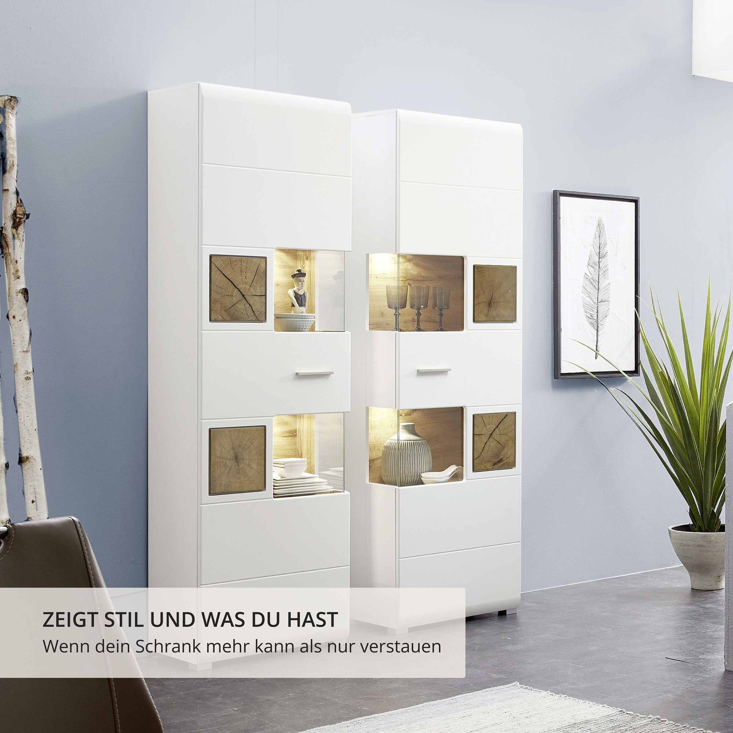 [metaDescription] => Moderne Hängevitrine in Weiß-Matt, Korpus aus Spanpatte, Front aus MDF mit Absetzungen aus Spanplatte in Hirnholz Nachbildung mit 1 Glas-/Holztür, 1 Holztür